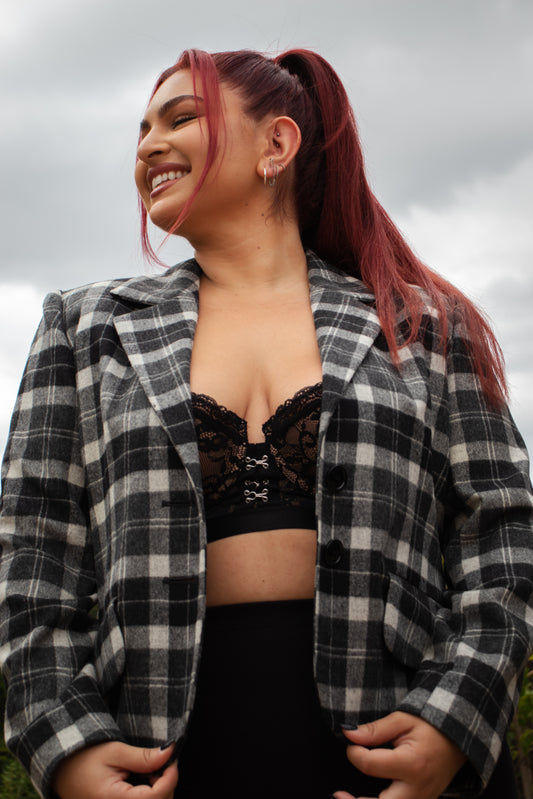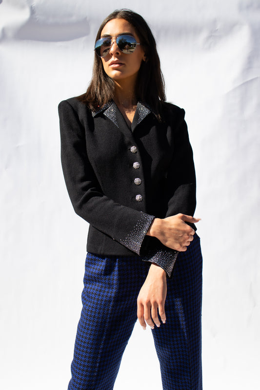 90's Yves Saint Laurent Black and Grey Plaid Wool Blazer L/XL