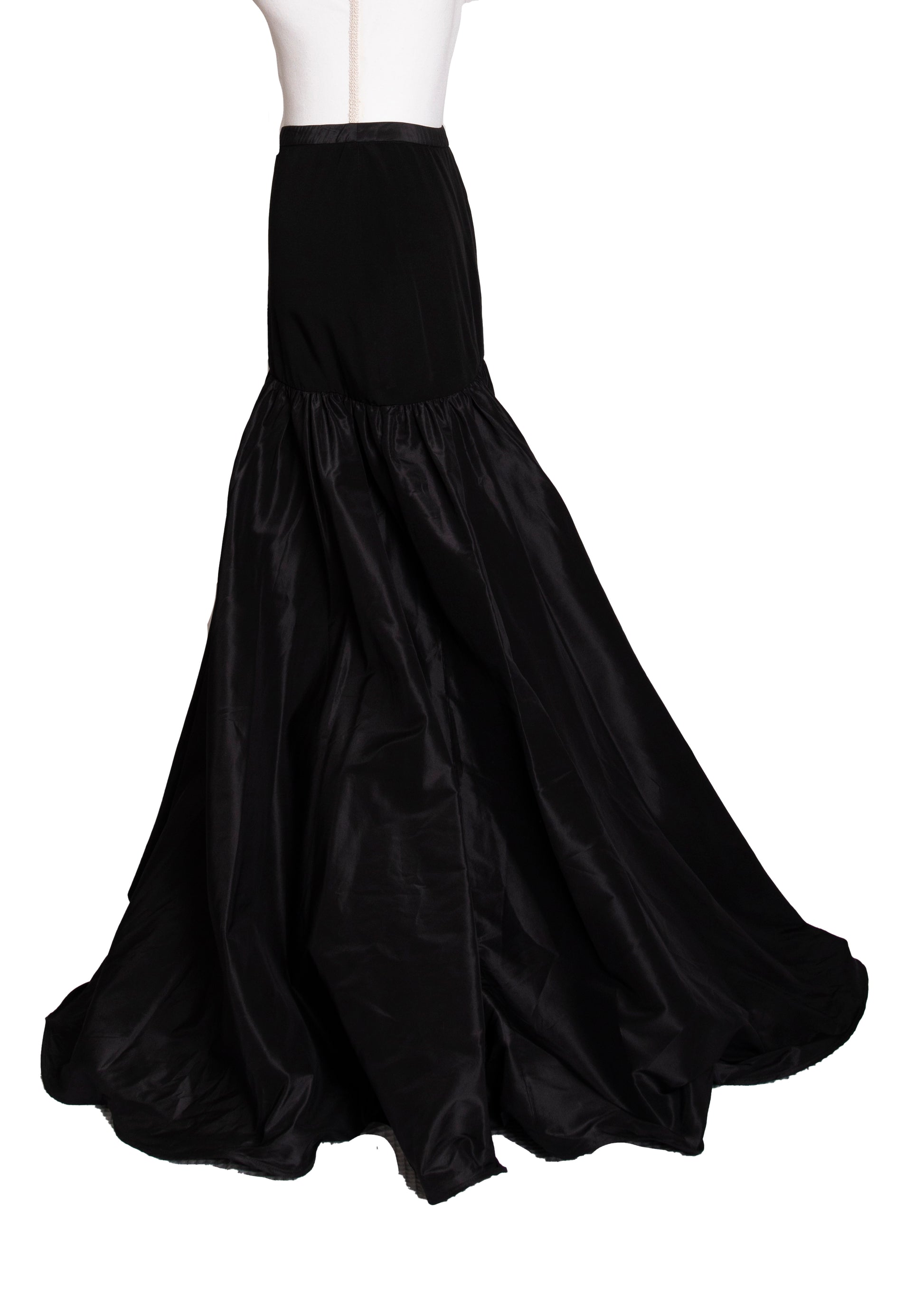 If this is your size please grab it. These skirts are so versatile and timeless, it's an essential wardrobe staple. We love how the cut hugs the butt...if you got it, this is the skirt for you. The fabric in the booty is super stretchy and rouched for added hotness and features gorgeous crystal buttons at left side and a silk taffeta train.