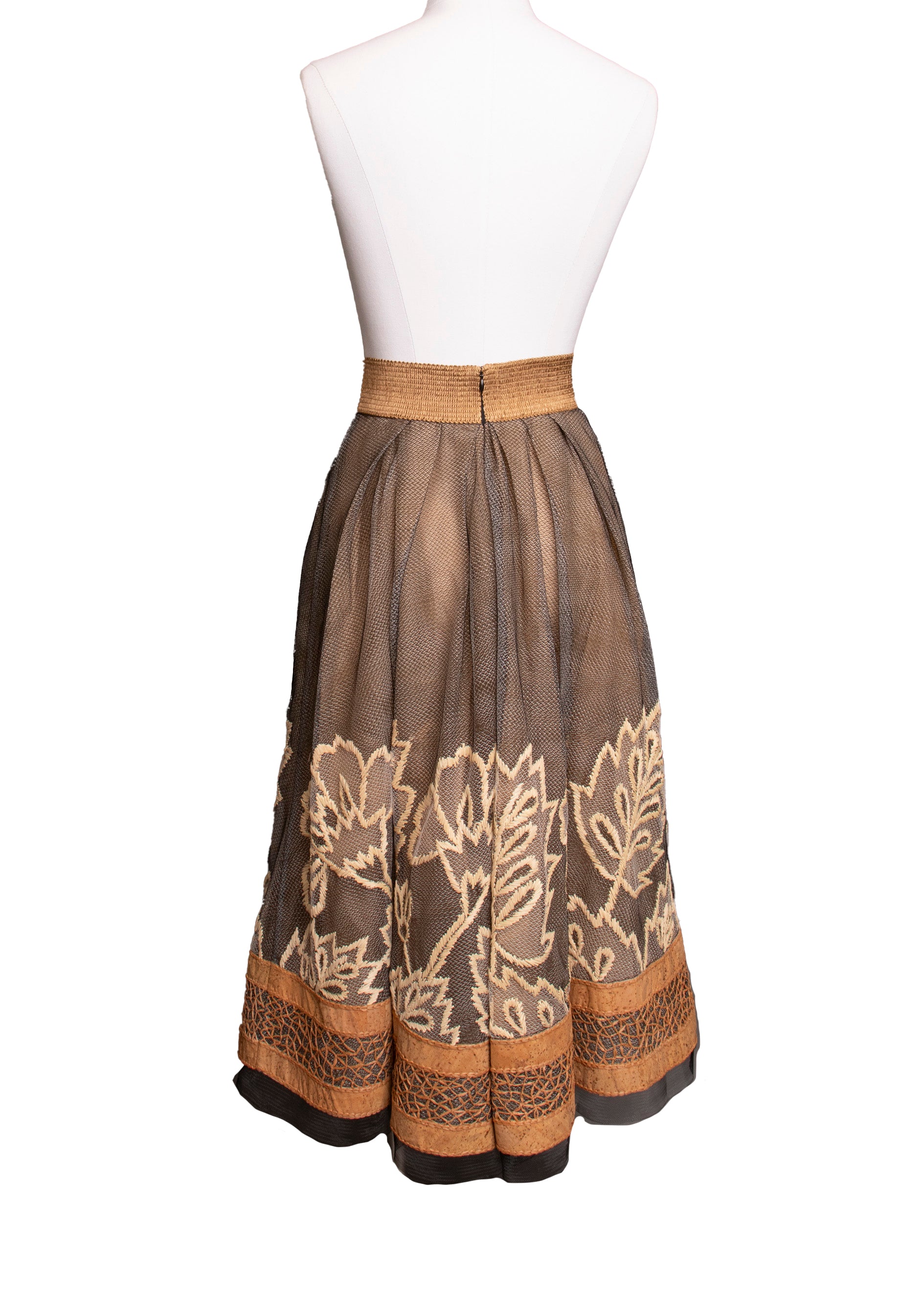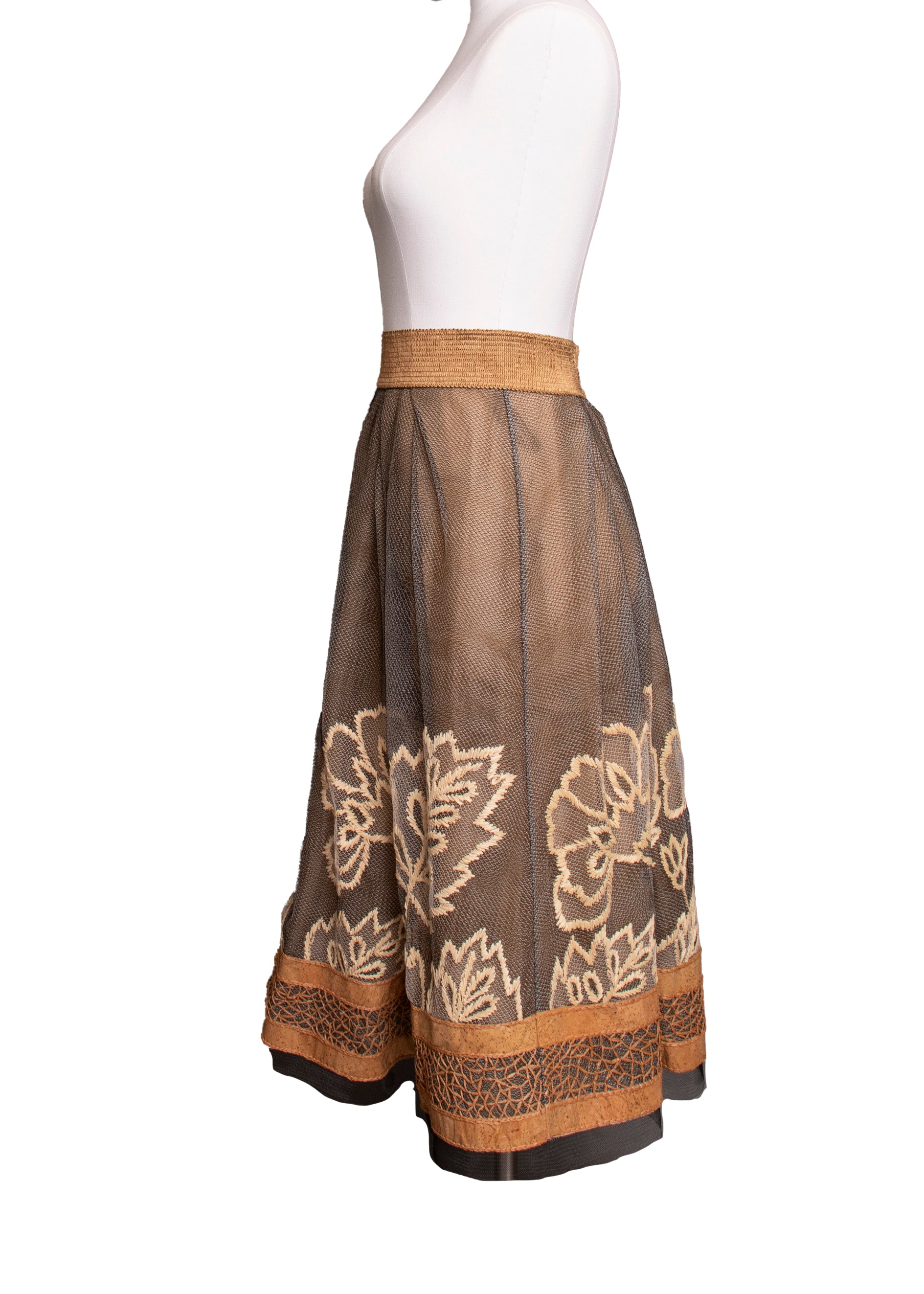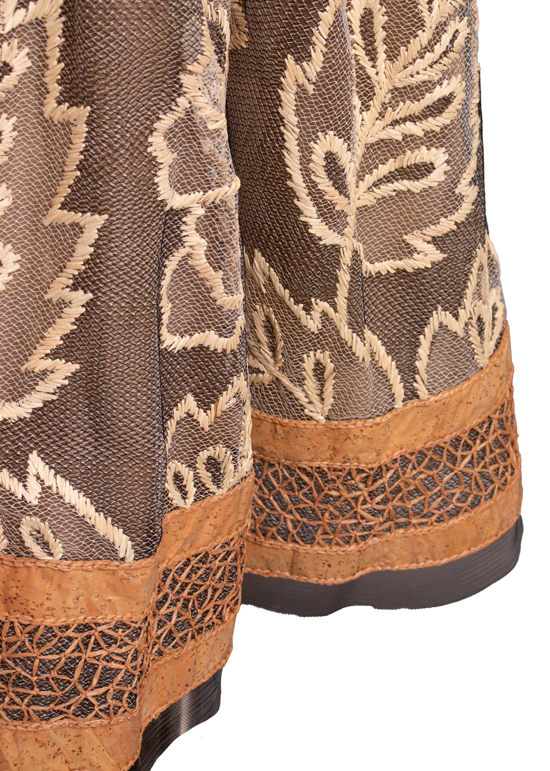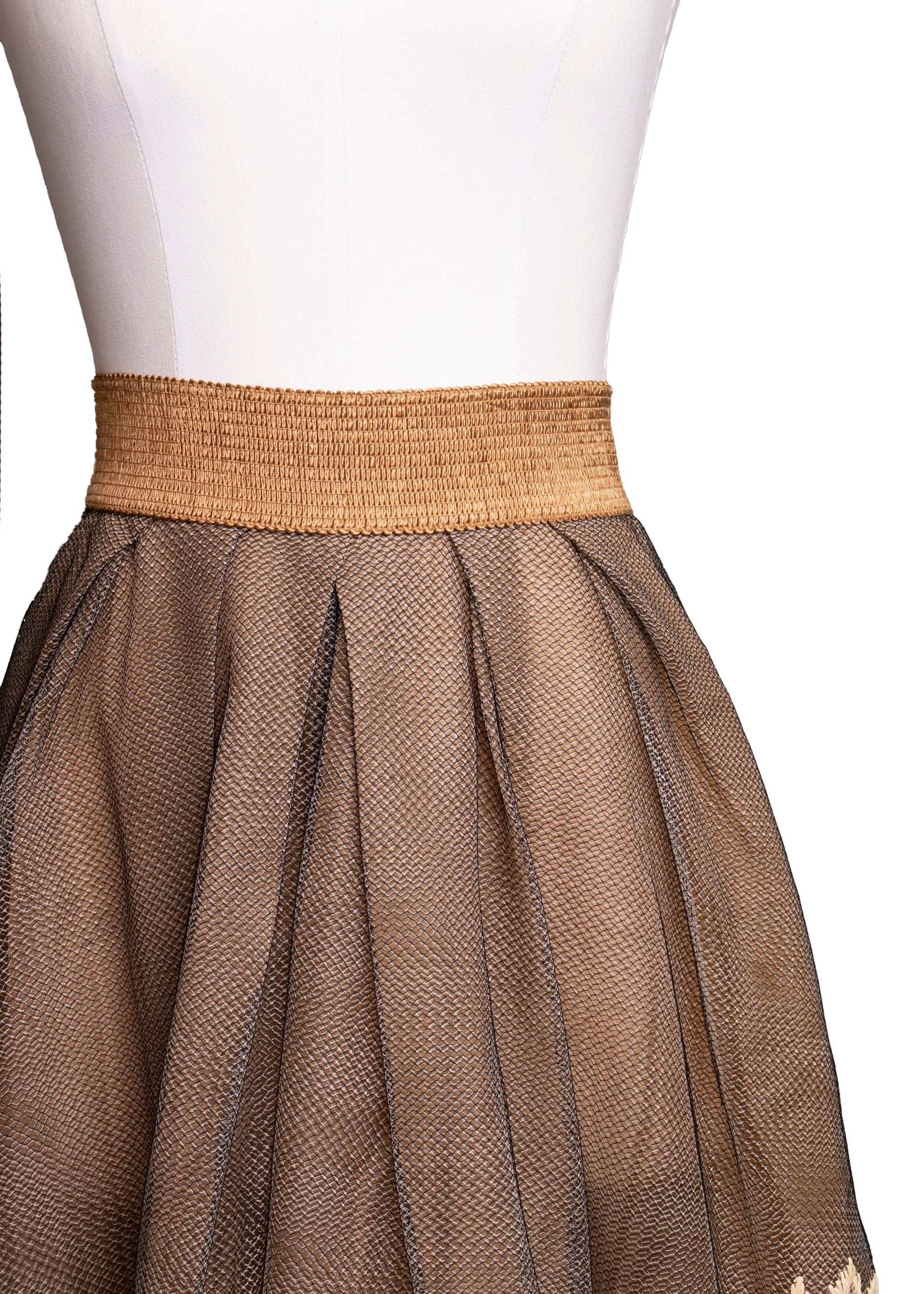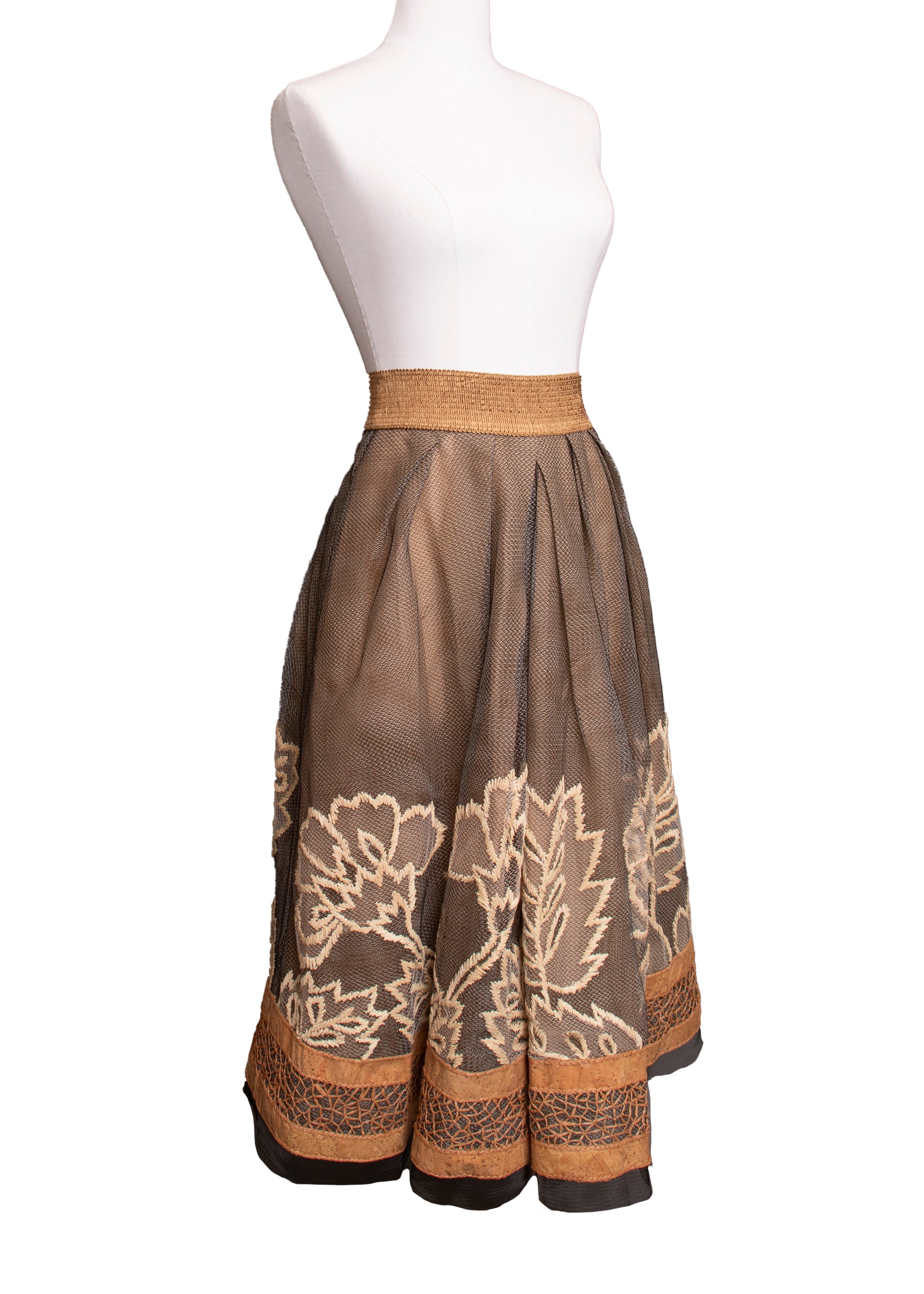 Layers of tulle, woven raffia and razor thin cork line the hem. Features an elastic waistband, back zipper, and is cut on the bias for incredible drape. Fully lined in a cotton blend taupe fabric.