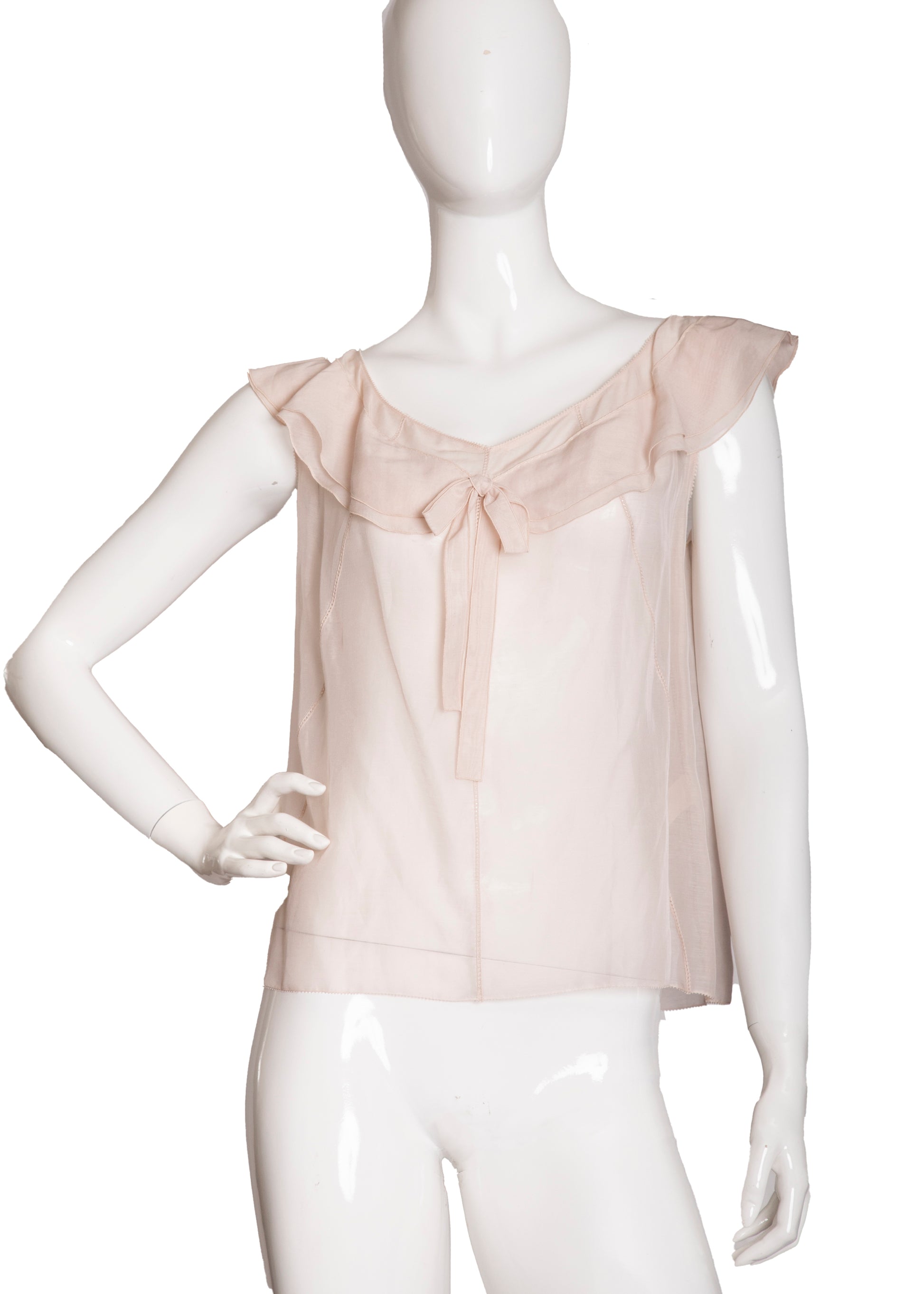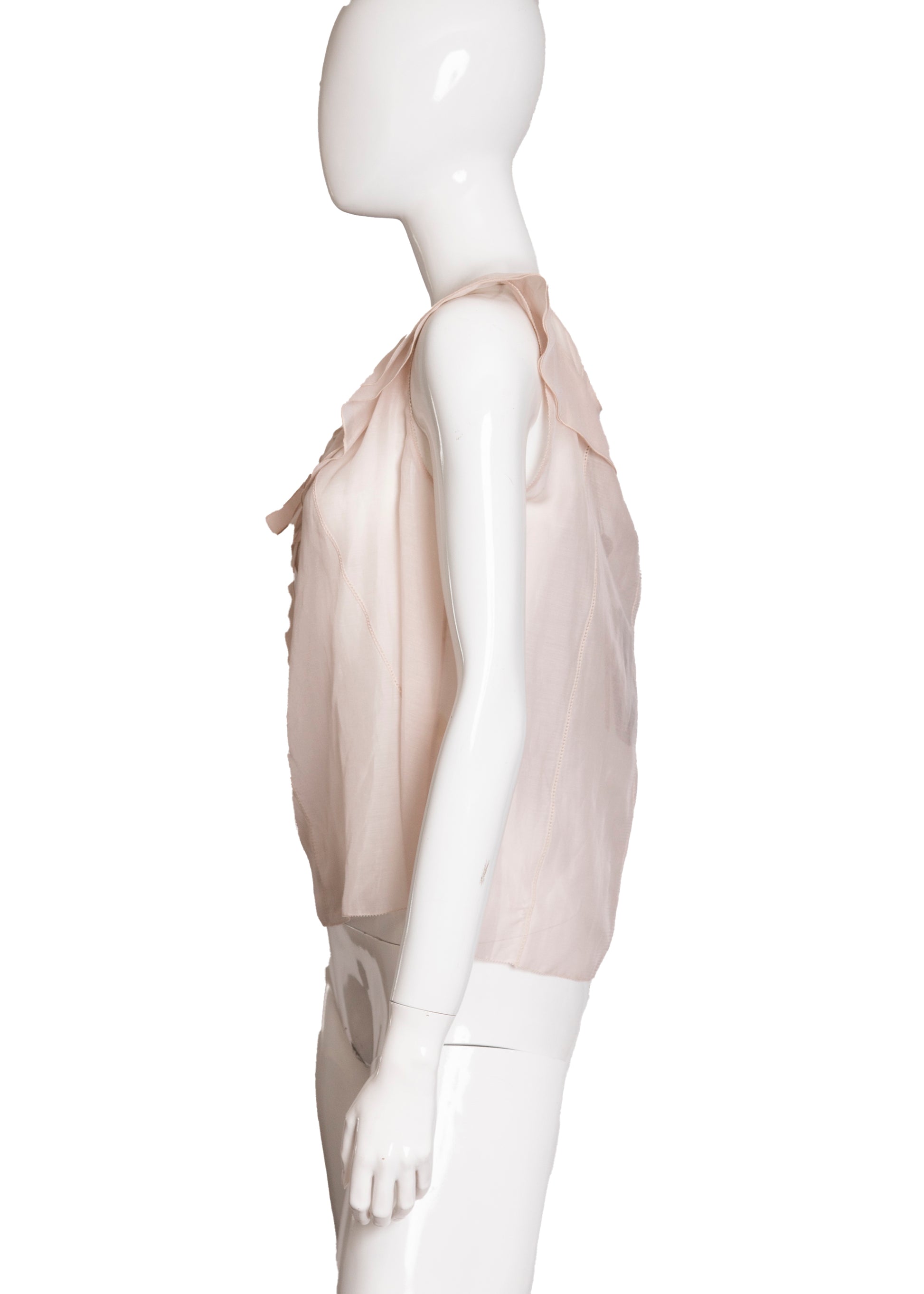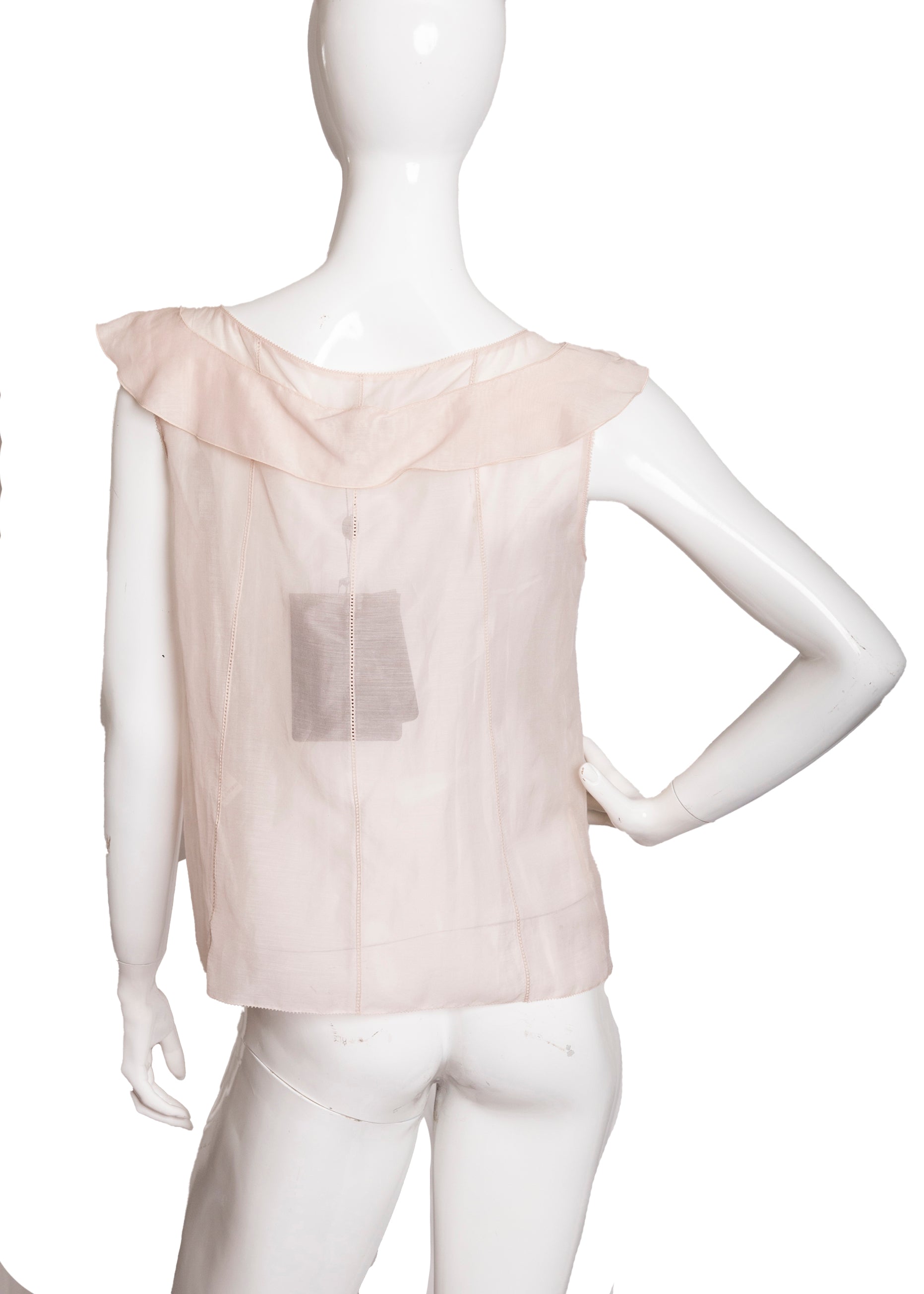 Perfect for the warm months ahead, pair with cut off jeans or white capris and sandals for a seaside dinner. Semi-sheer and sexy, this peter pan collared and sleeveless top hangs beautifully and features hand-stitching throughout. New with tags and ready to go.