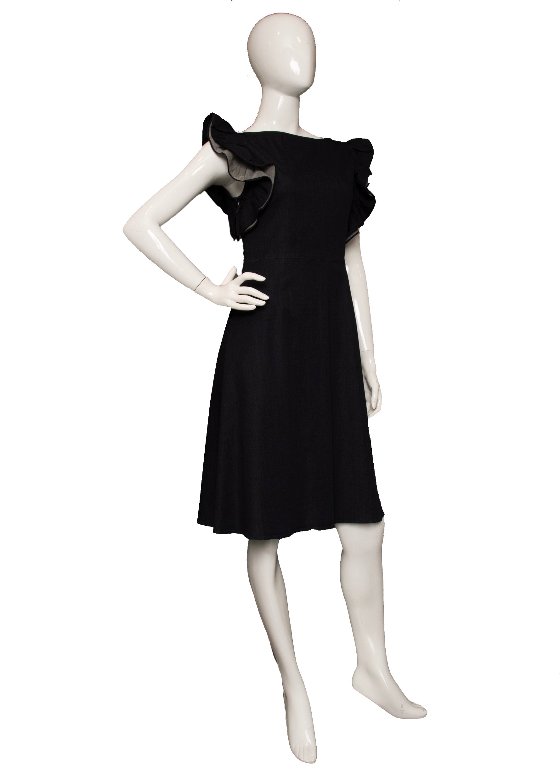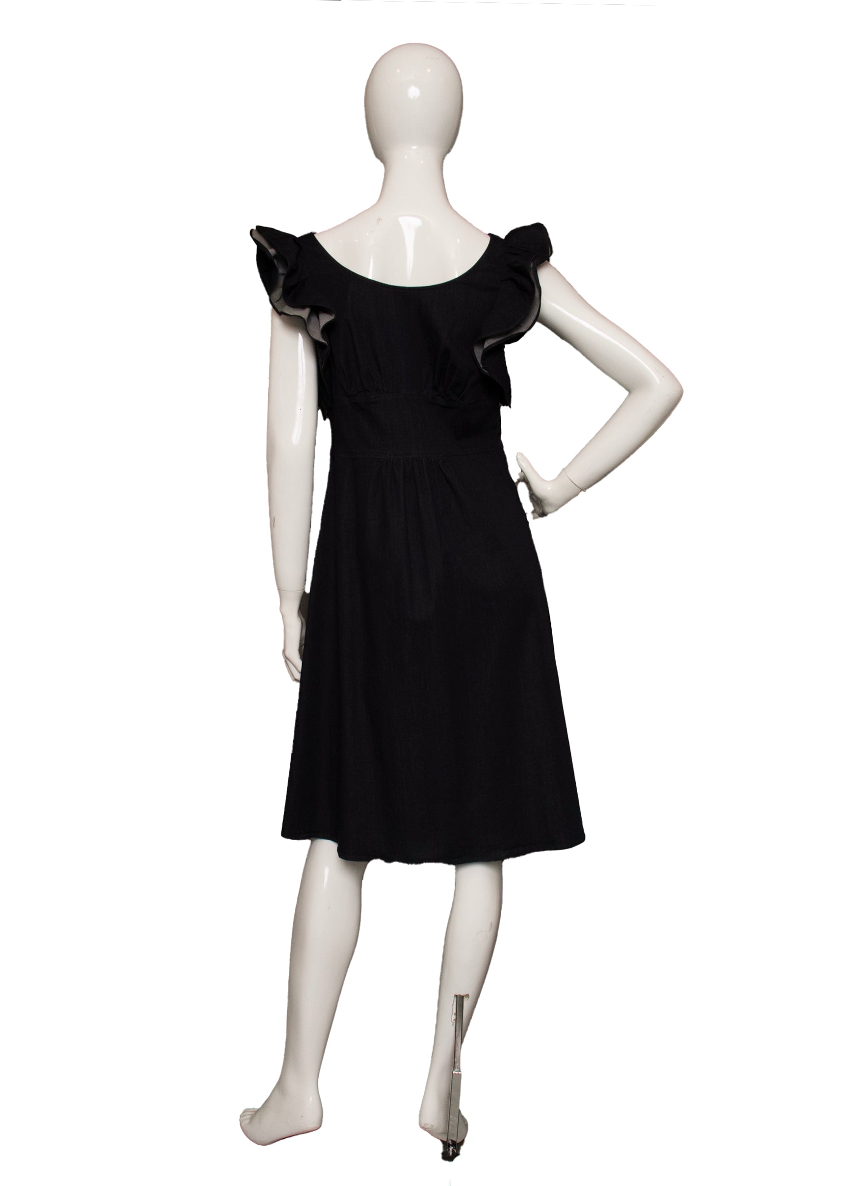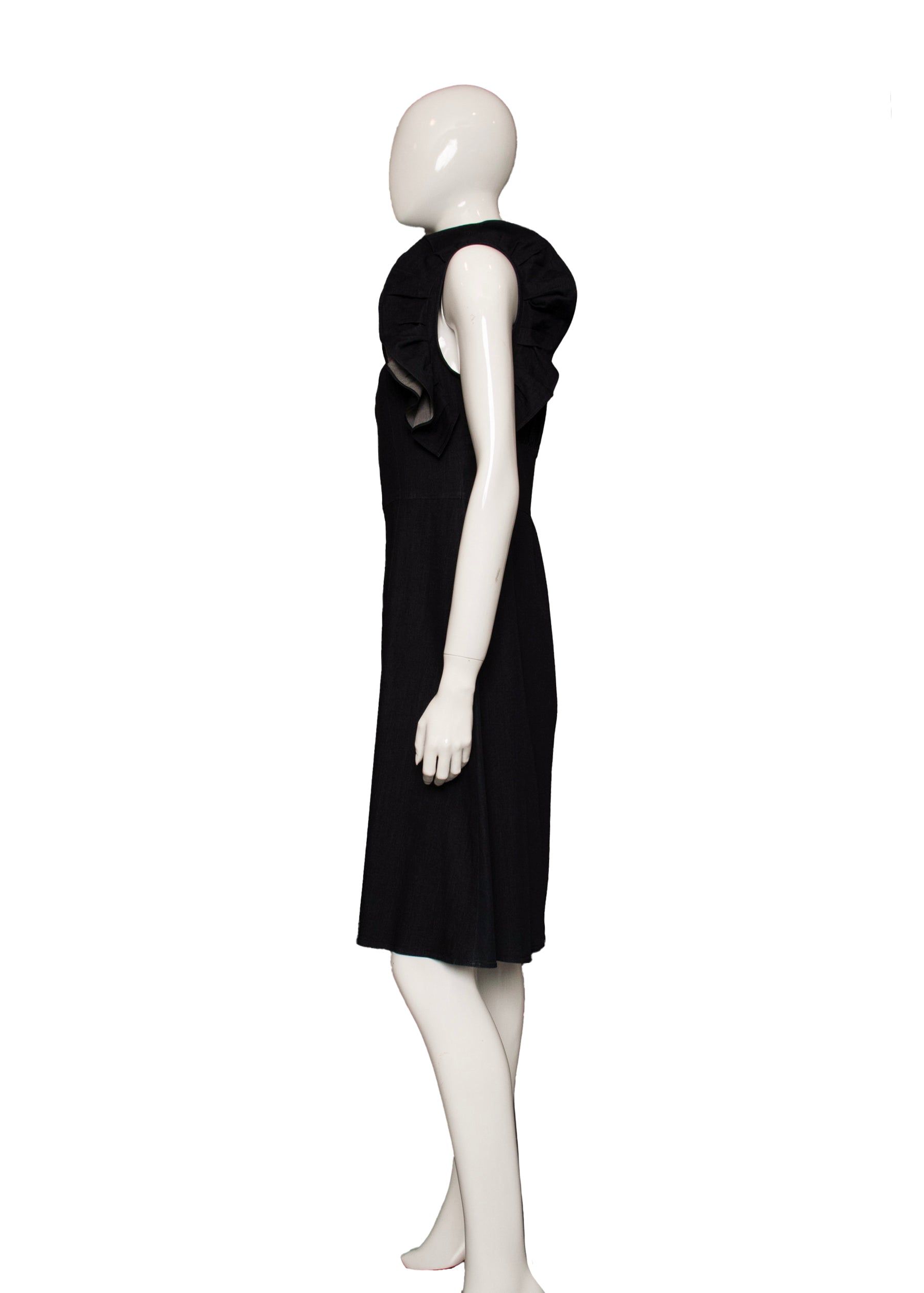 Gorgeous, comfortable, classic and perfect for the warmer months. The ruffled shoulders add to the chic silhouette. Gorgeous dark wash blue Prada knee-length denim dress with ruffle trim, tonal stitching throughout and zipper at side.