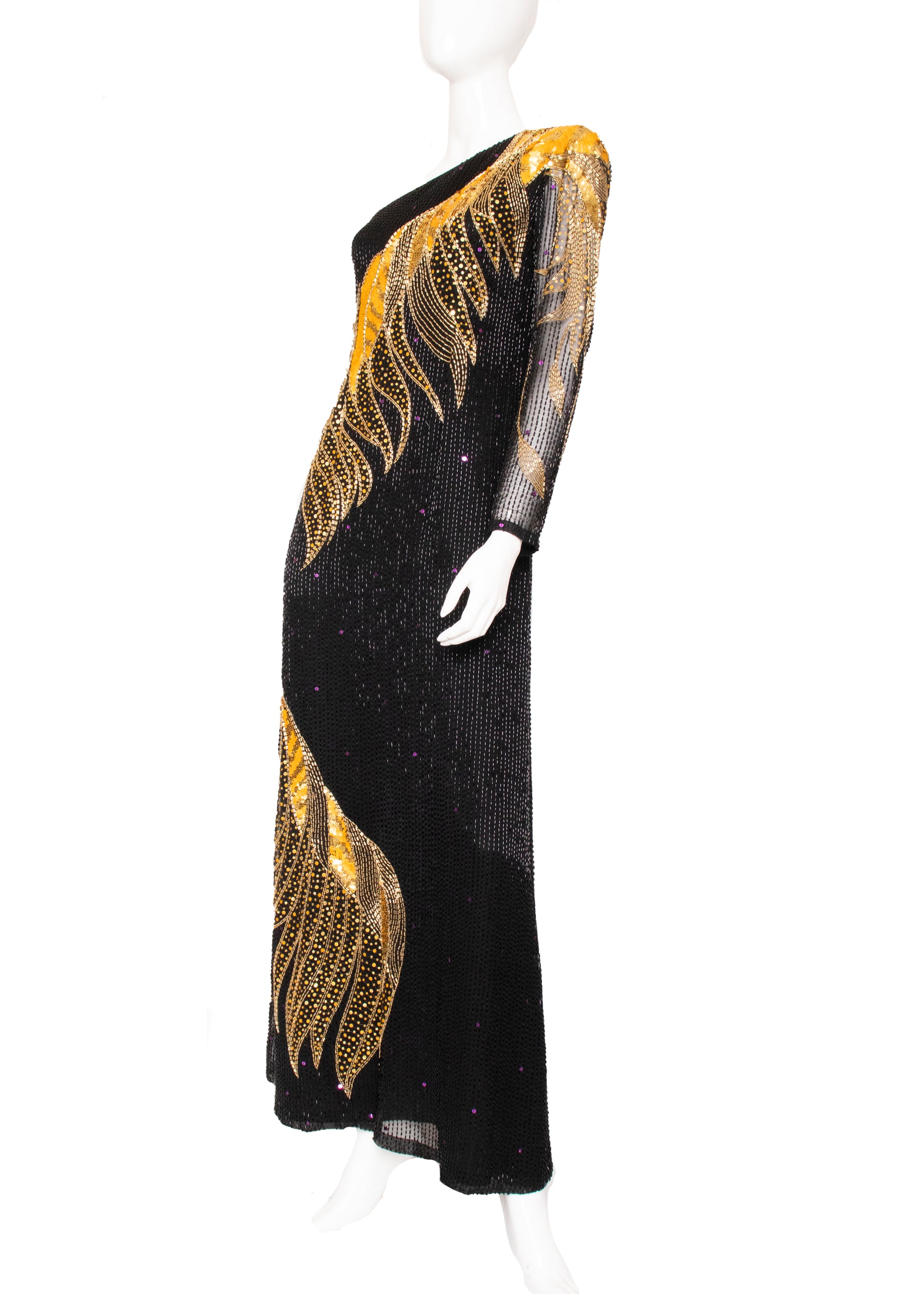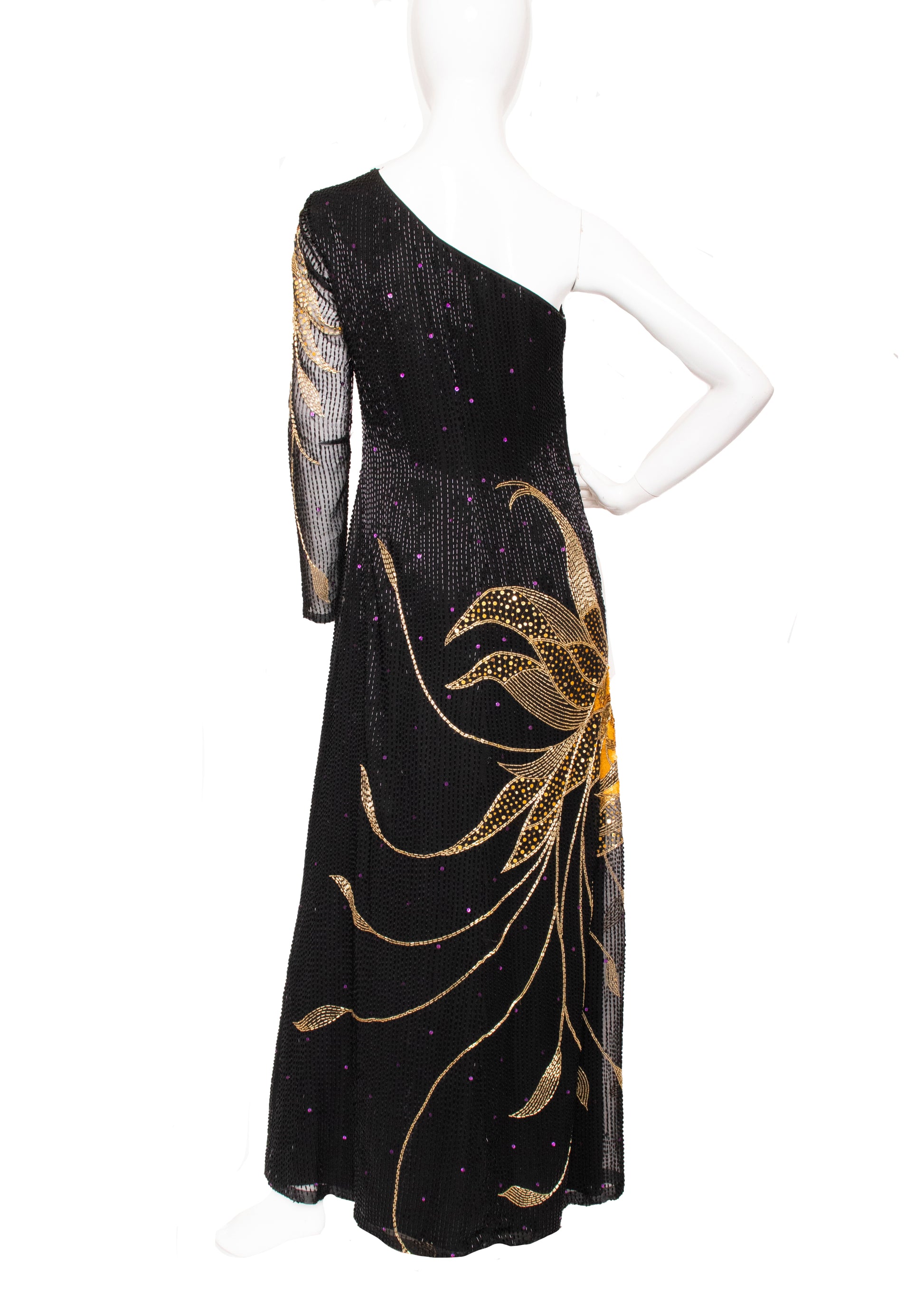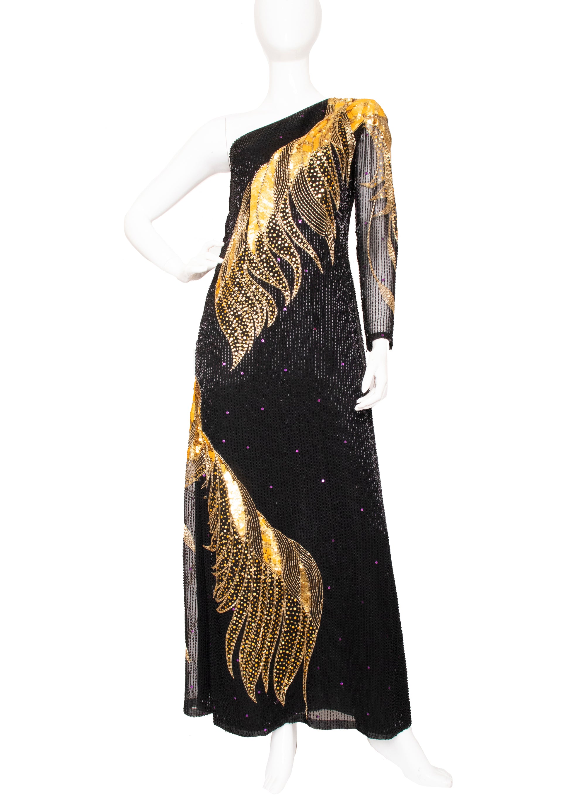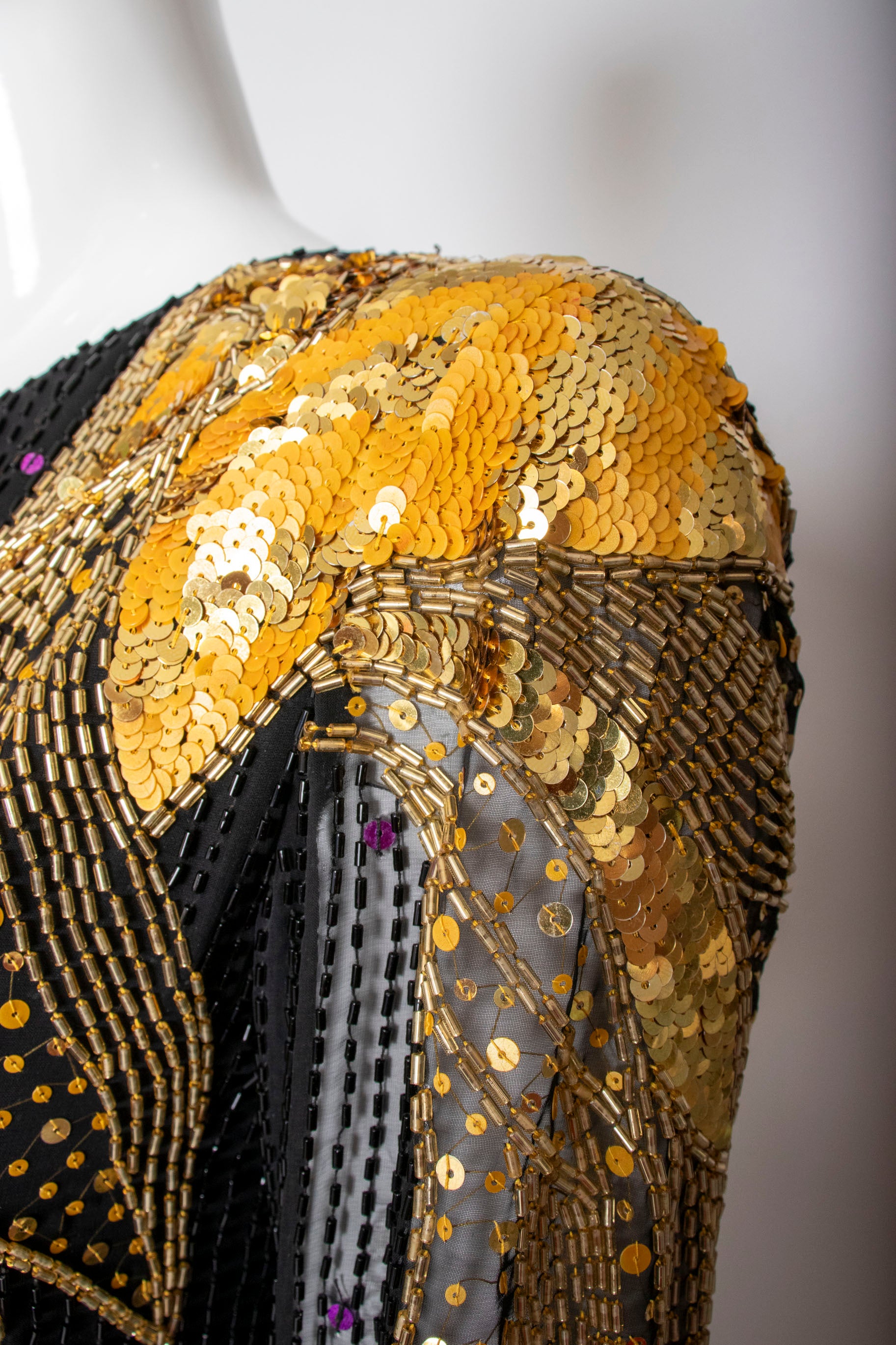 This Amen Wardy Beaded Cocktail Dress captures the essence of the 1980s with its distinctive one-sleeve design in black and gold. From Newport Beach, California, each bead is meticulously placed. The dress is fully lined with a sheer sleeve, professionally dry cleaned, and perfectly prepared for your next celebration.