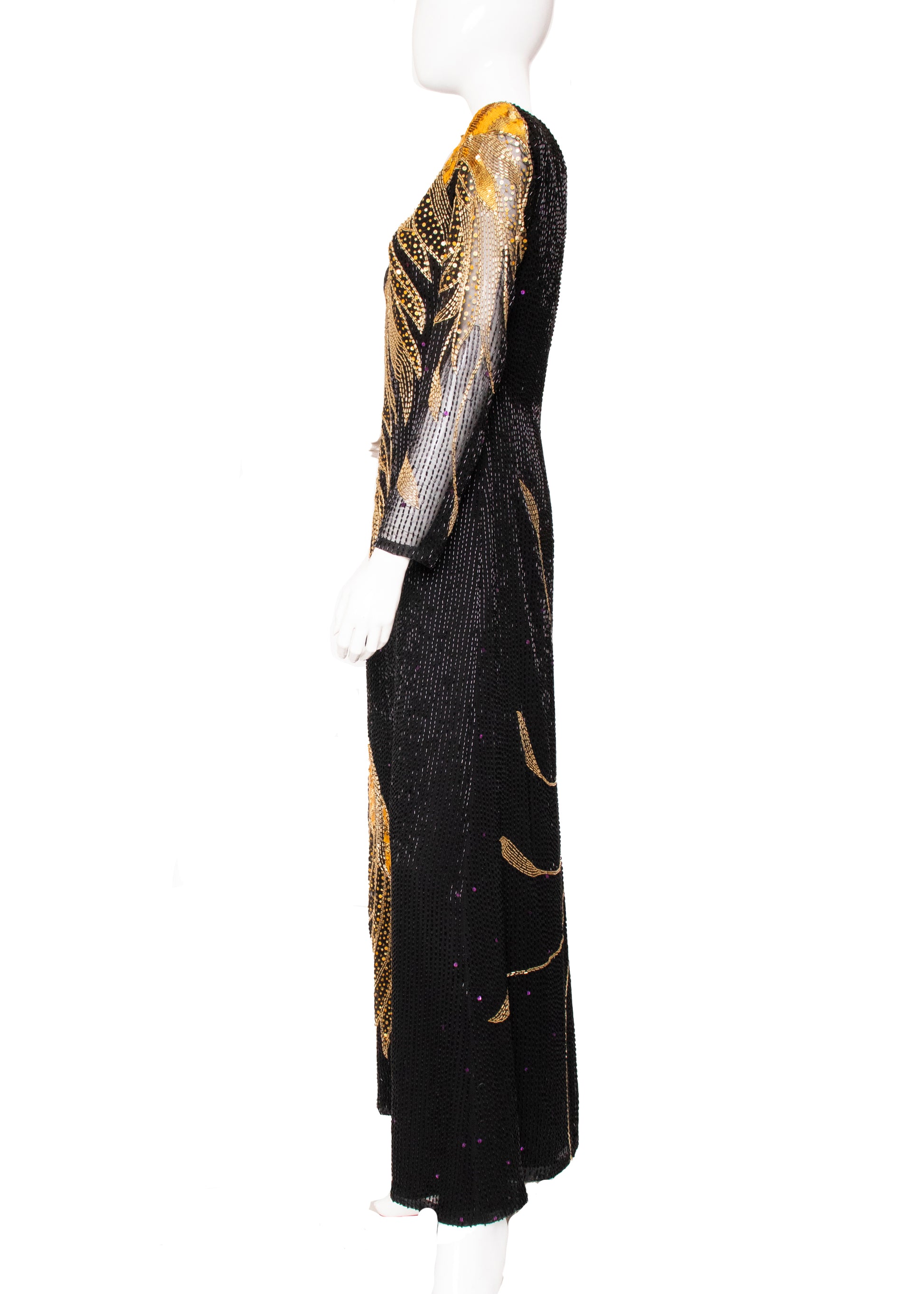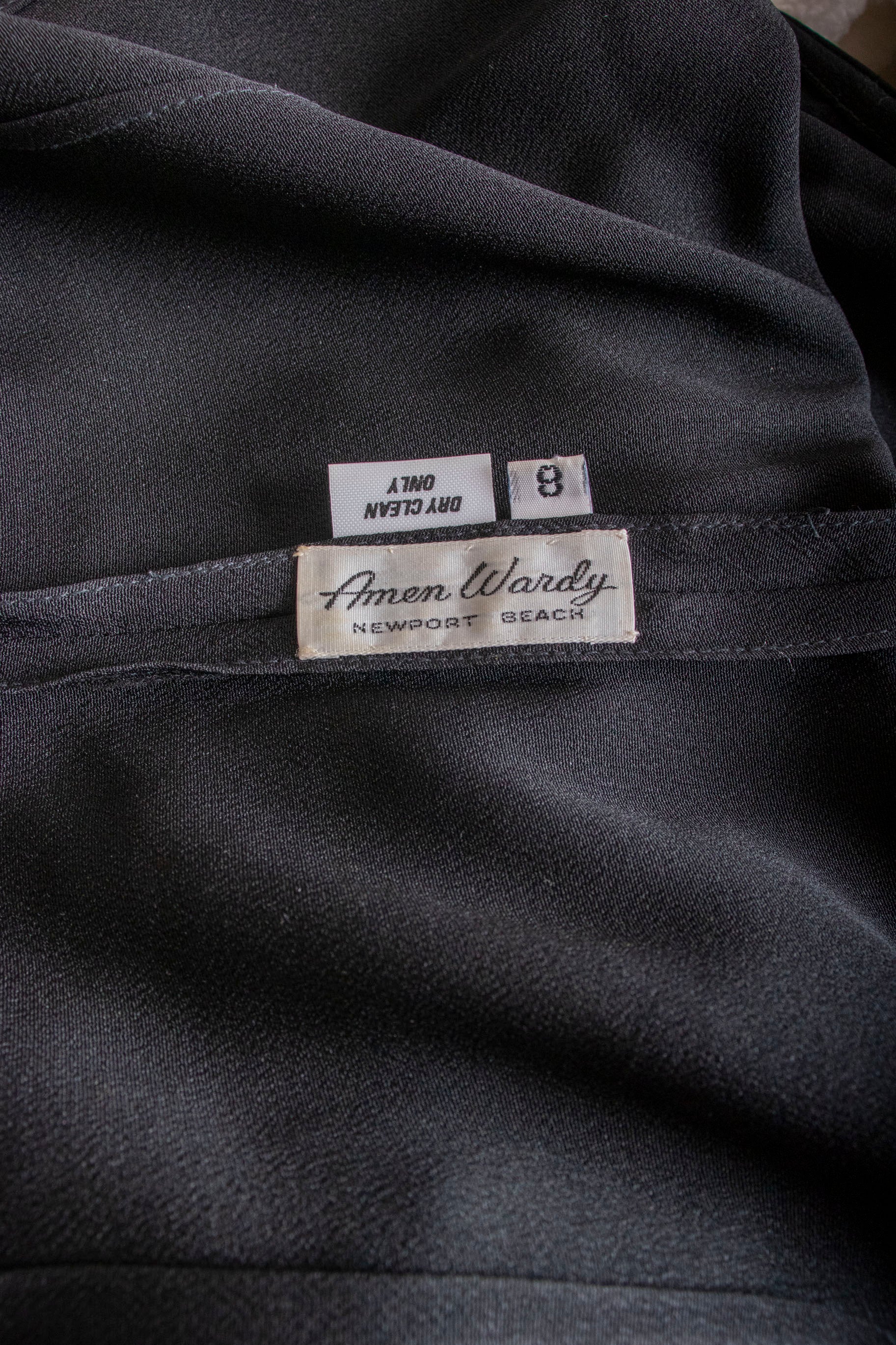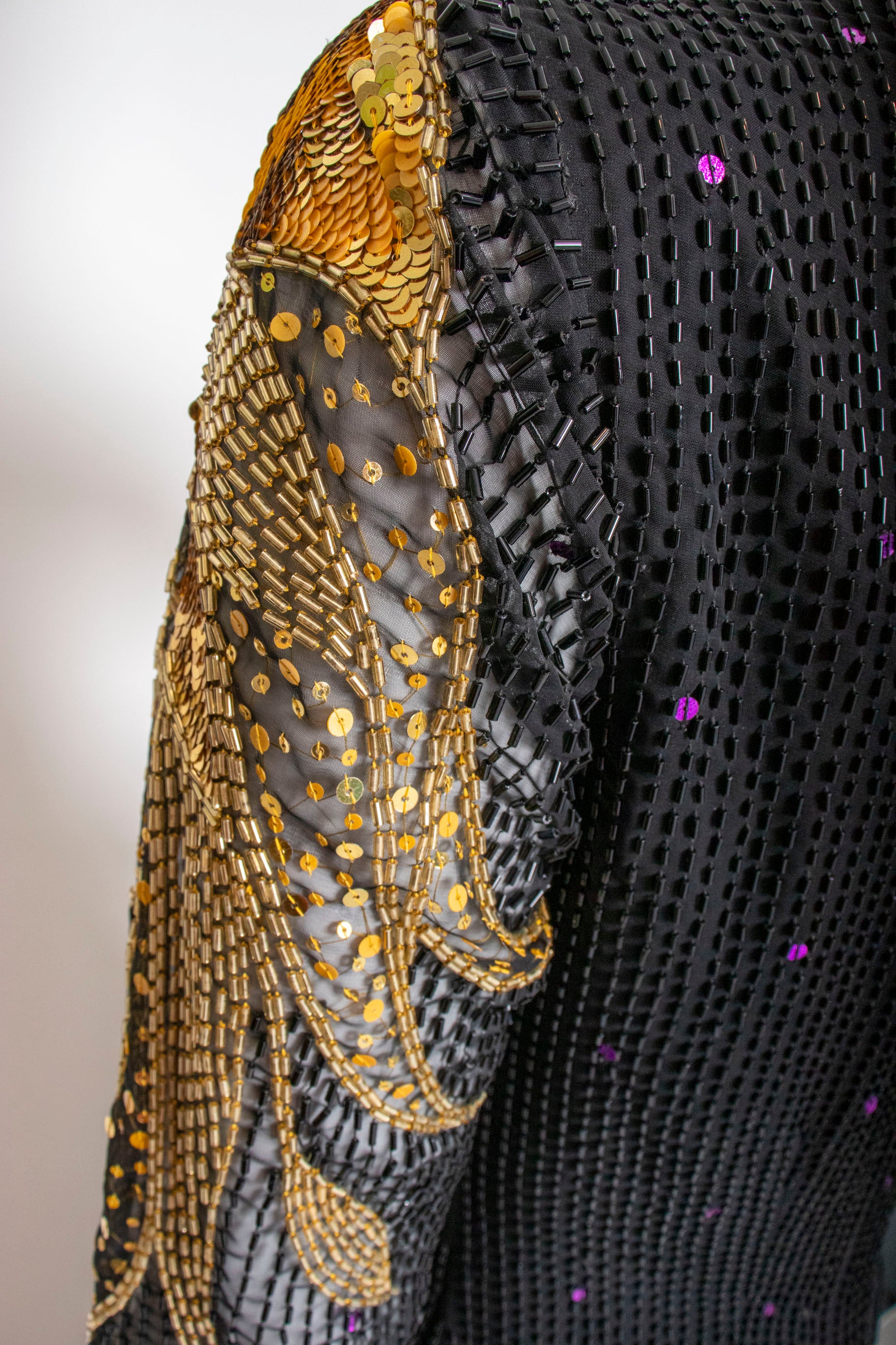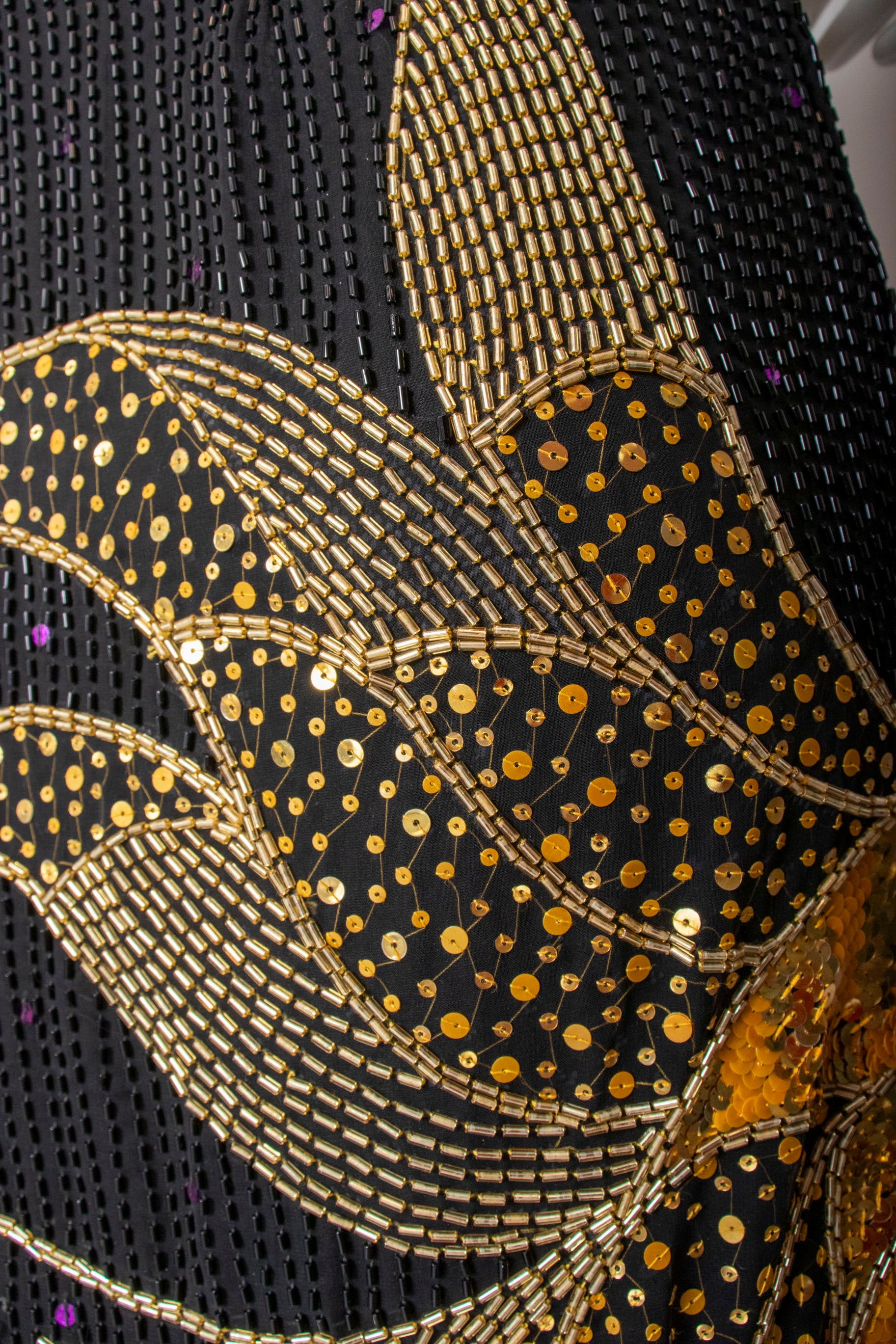 This Amen Wardy Beaded Cocktail Dress captures the essence of the 1980s with its distinctive one-sleeve design in black and gold. From Newport Beach, California, each bead is meticulously placed. The dress is fully lined with a sheer sleeve, professionally dry cleaned, and perfectly prepared for your next celebration.