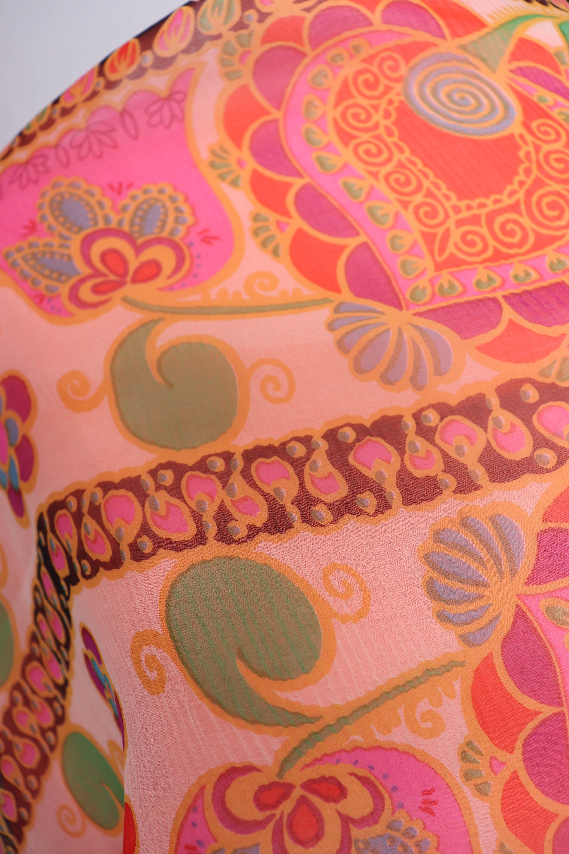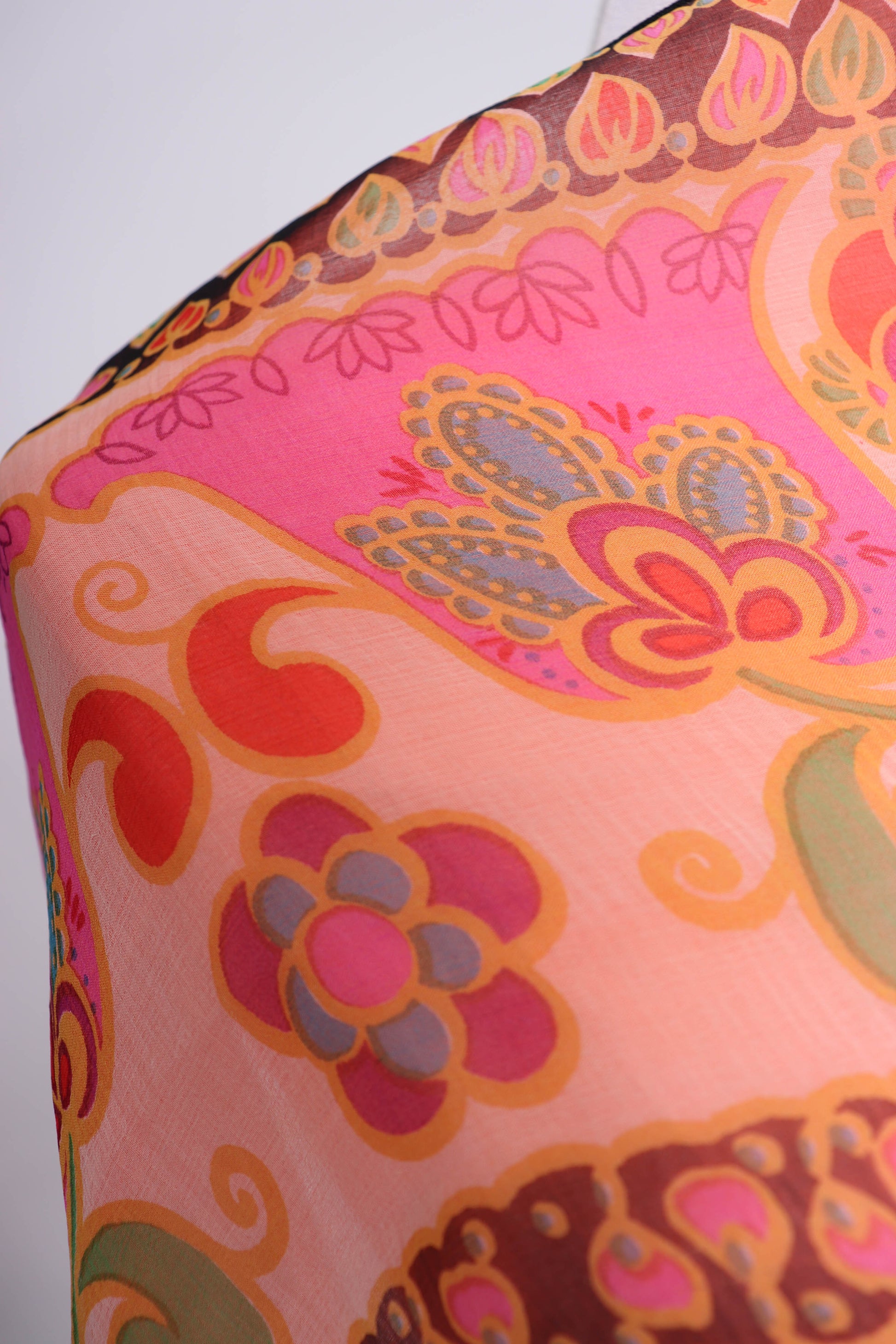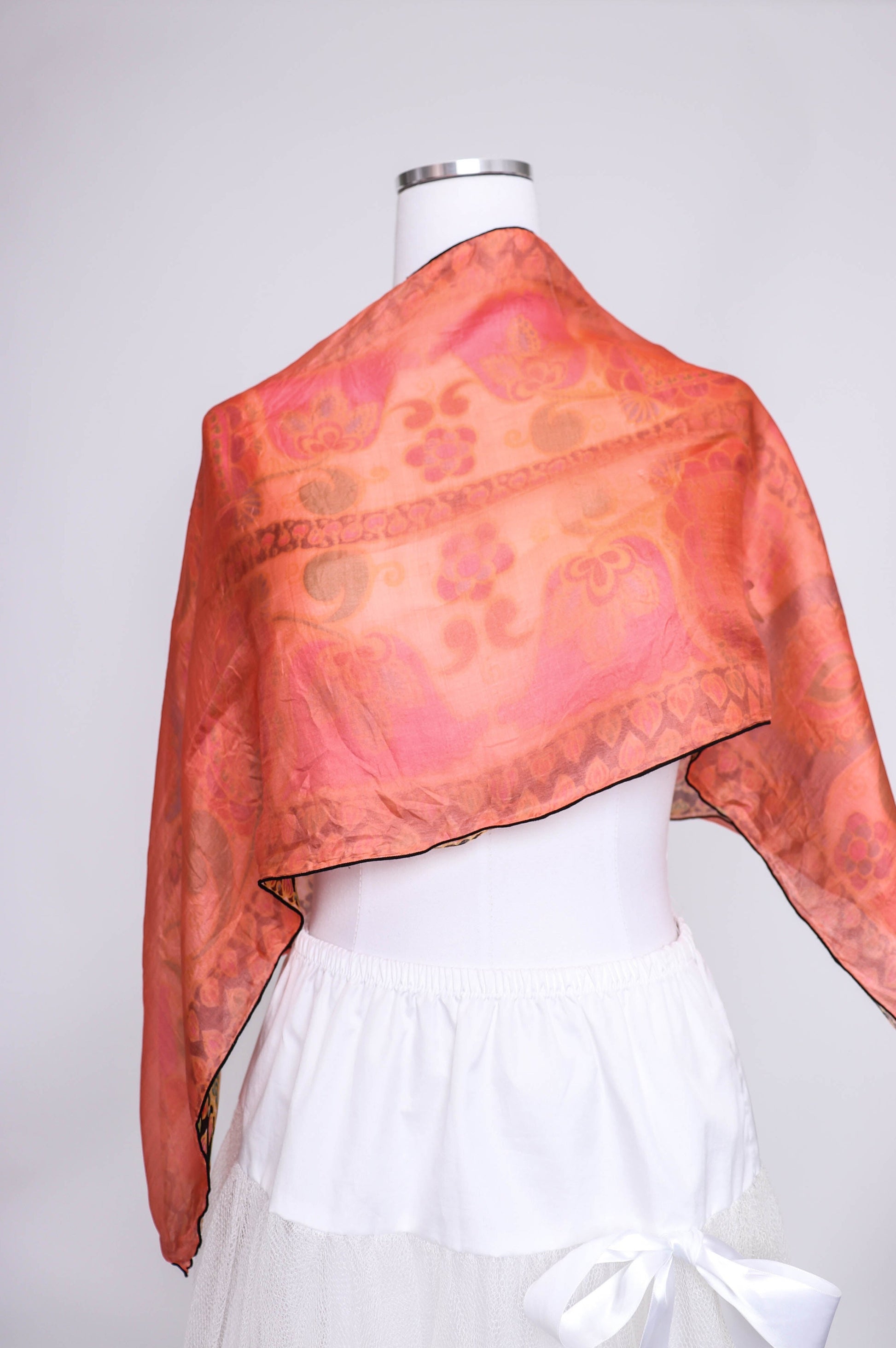 Experience a hint of old-world charm with this exquisite shop fave. Featuring two delicate layers of fine silk chiffon, orange and a stunning floral paisley print, this one-of-a-kind scarf is perfect for adding a touch of vintage flair to any outfit.