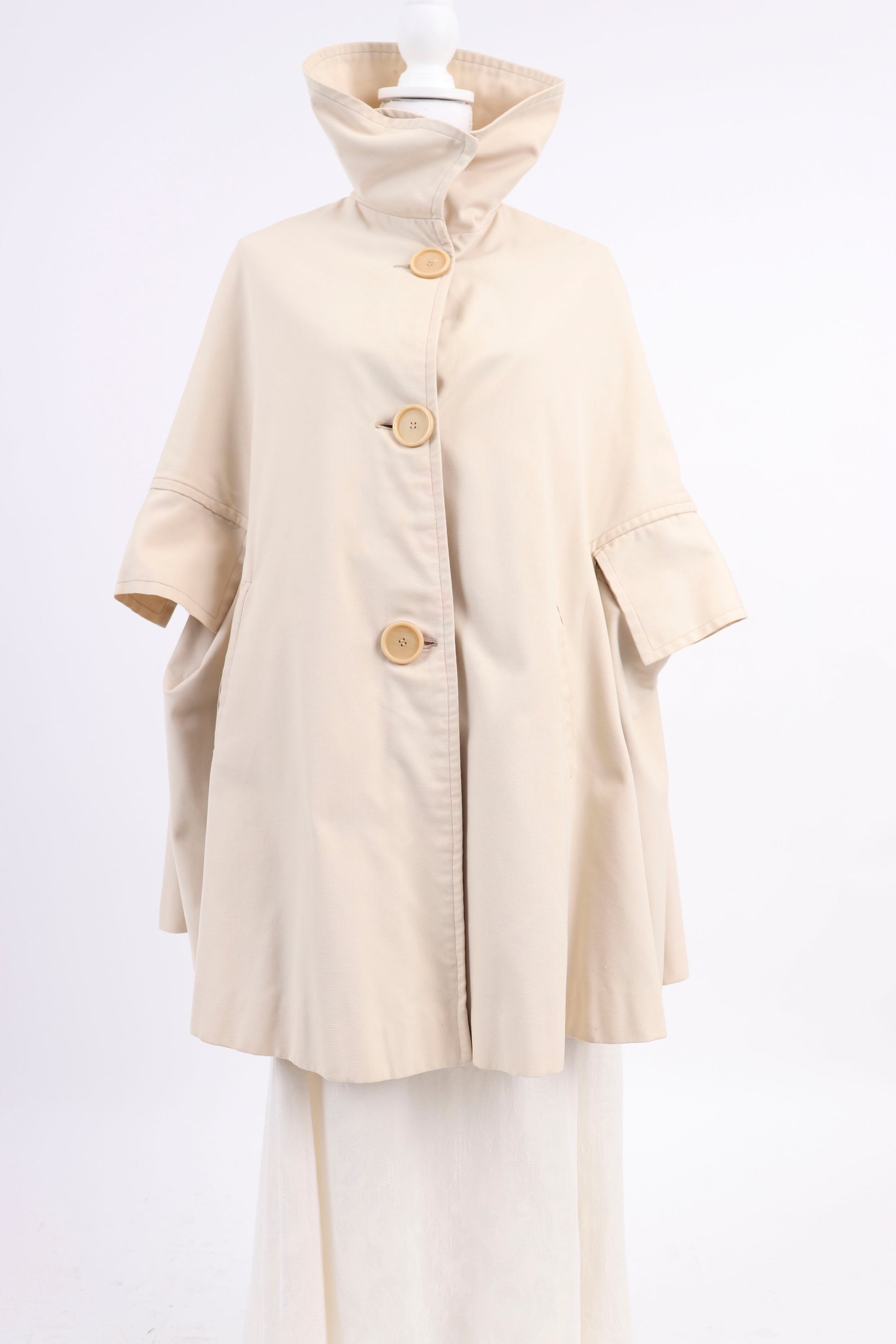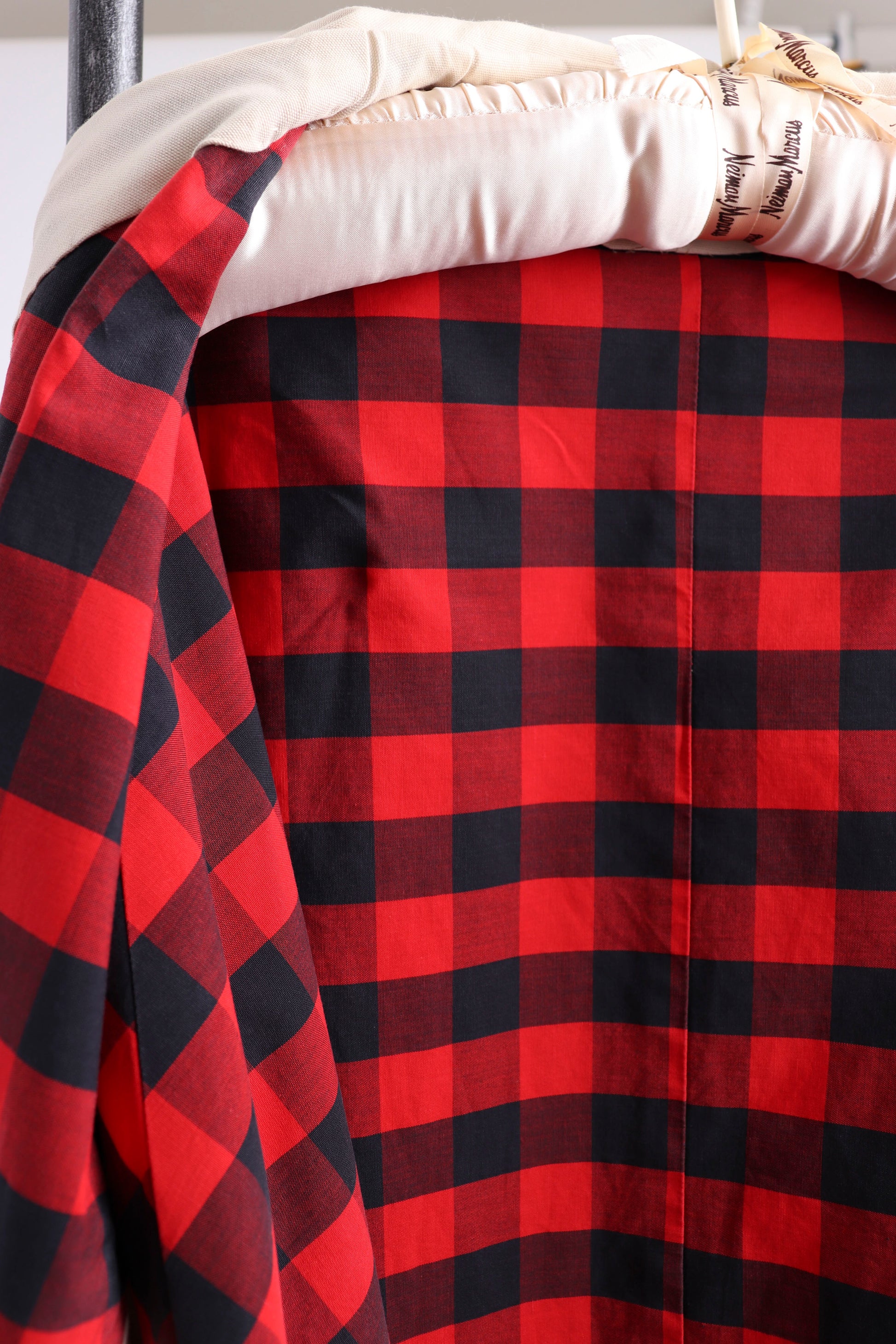 Features three large buttons and two front pockets. The interior black and red plaid lining is the same trench fabric as the exterior. Unsure of fabric but appears to be cotton twill.