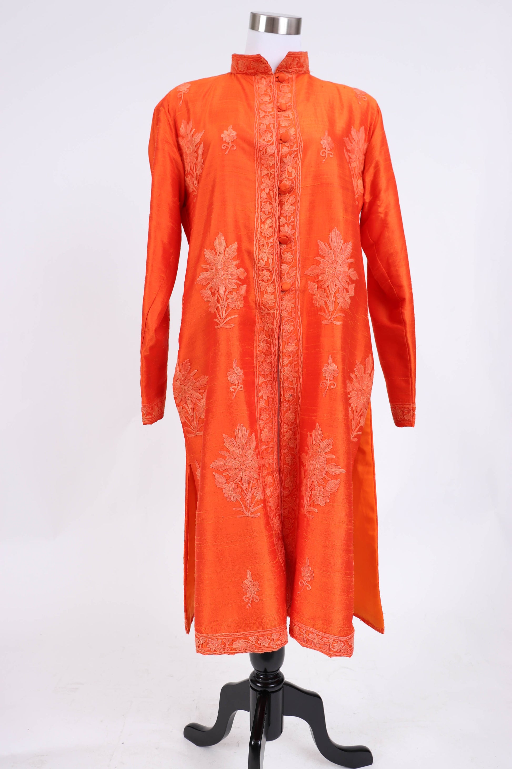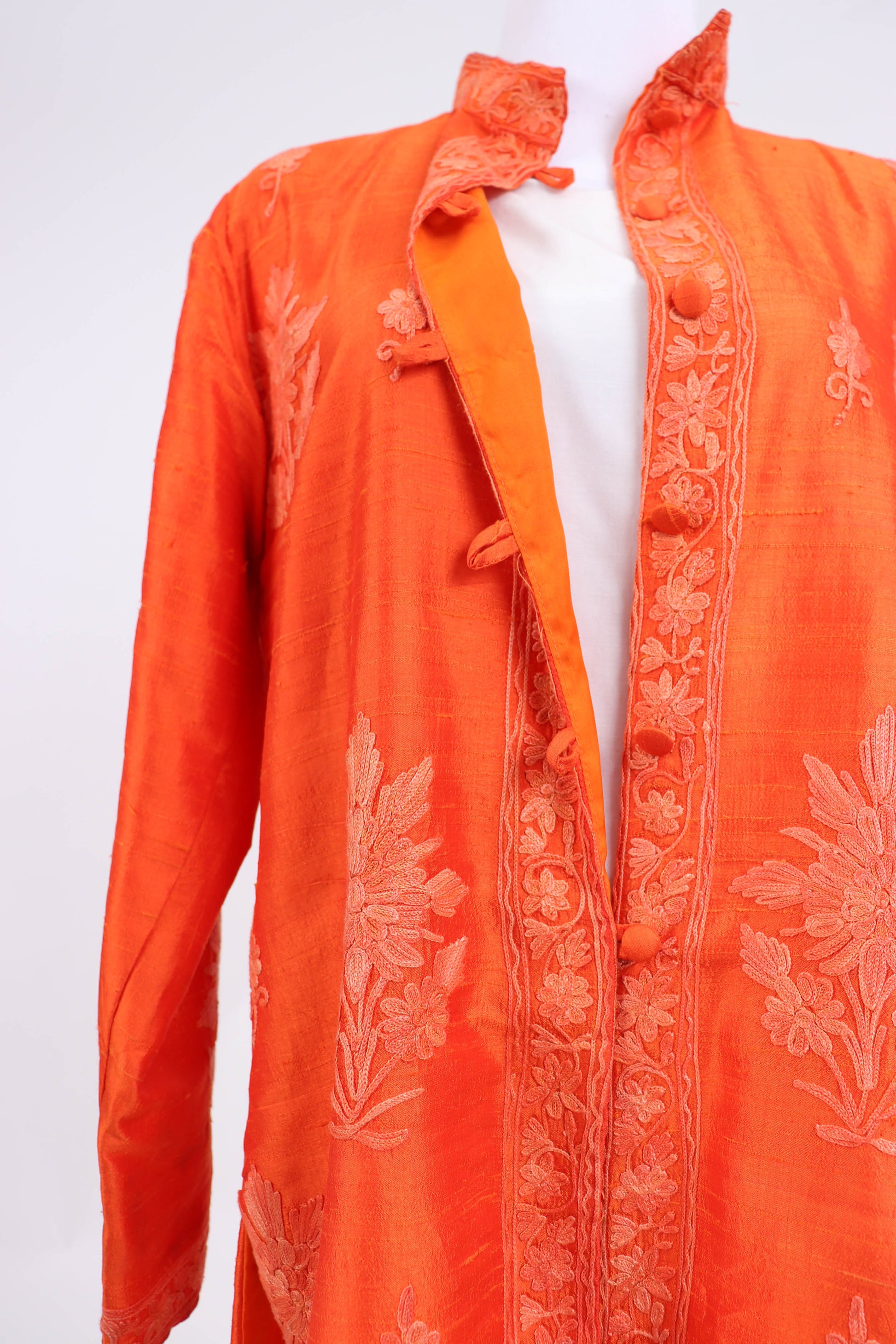 Mandarin collar and trim are embroidered and it is fully lined. Features six fabric covered buttons at the bodice with an open skirt in front and side slits.