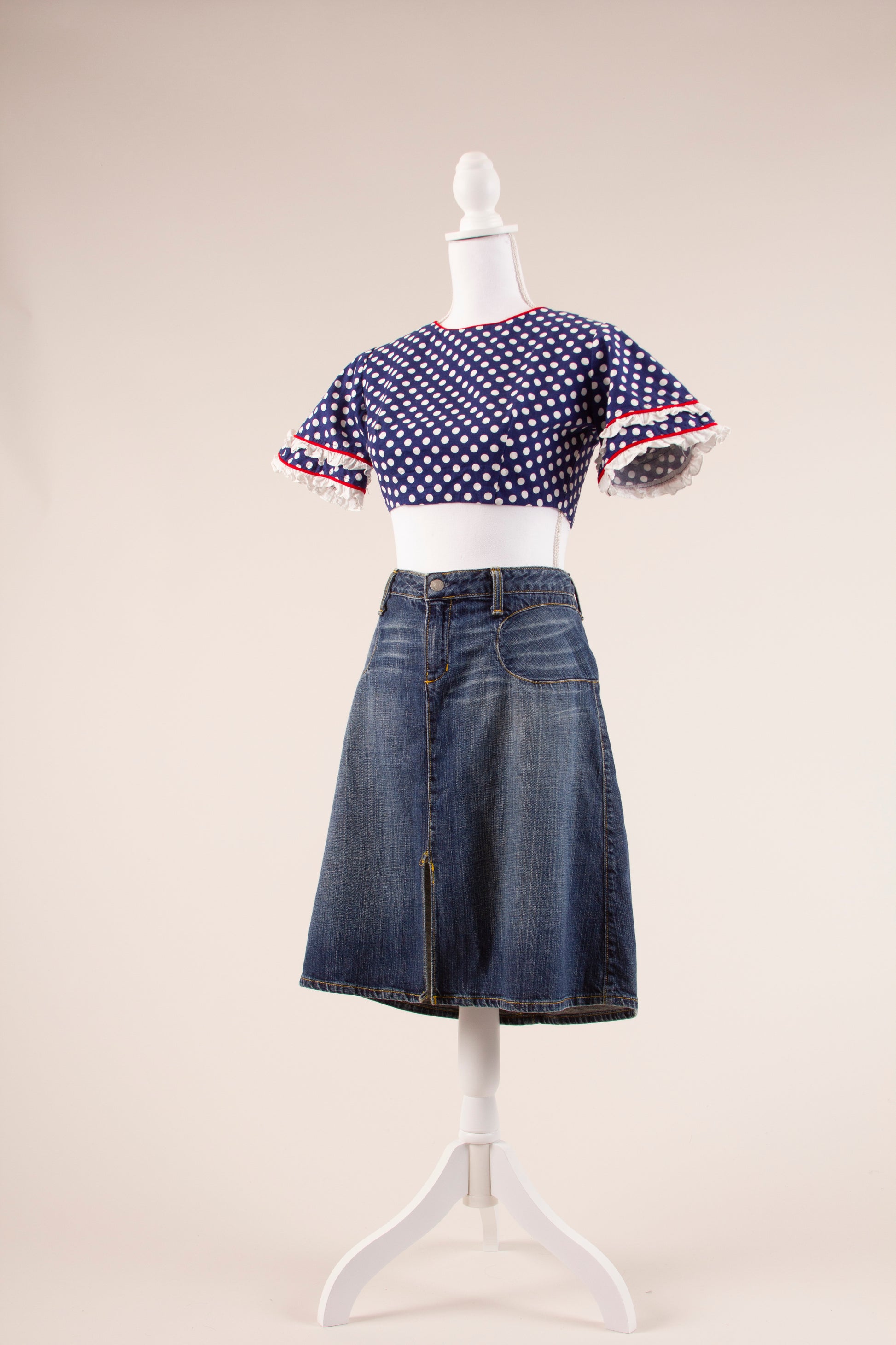 This one of a kind cropped top is made from a heavy cotton fabric, has four buttons in the back, red piping and is ruffled twice at the sleeves.