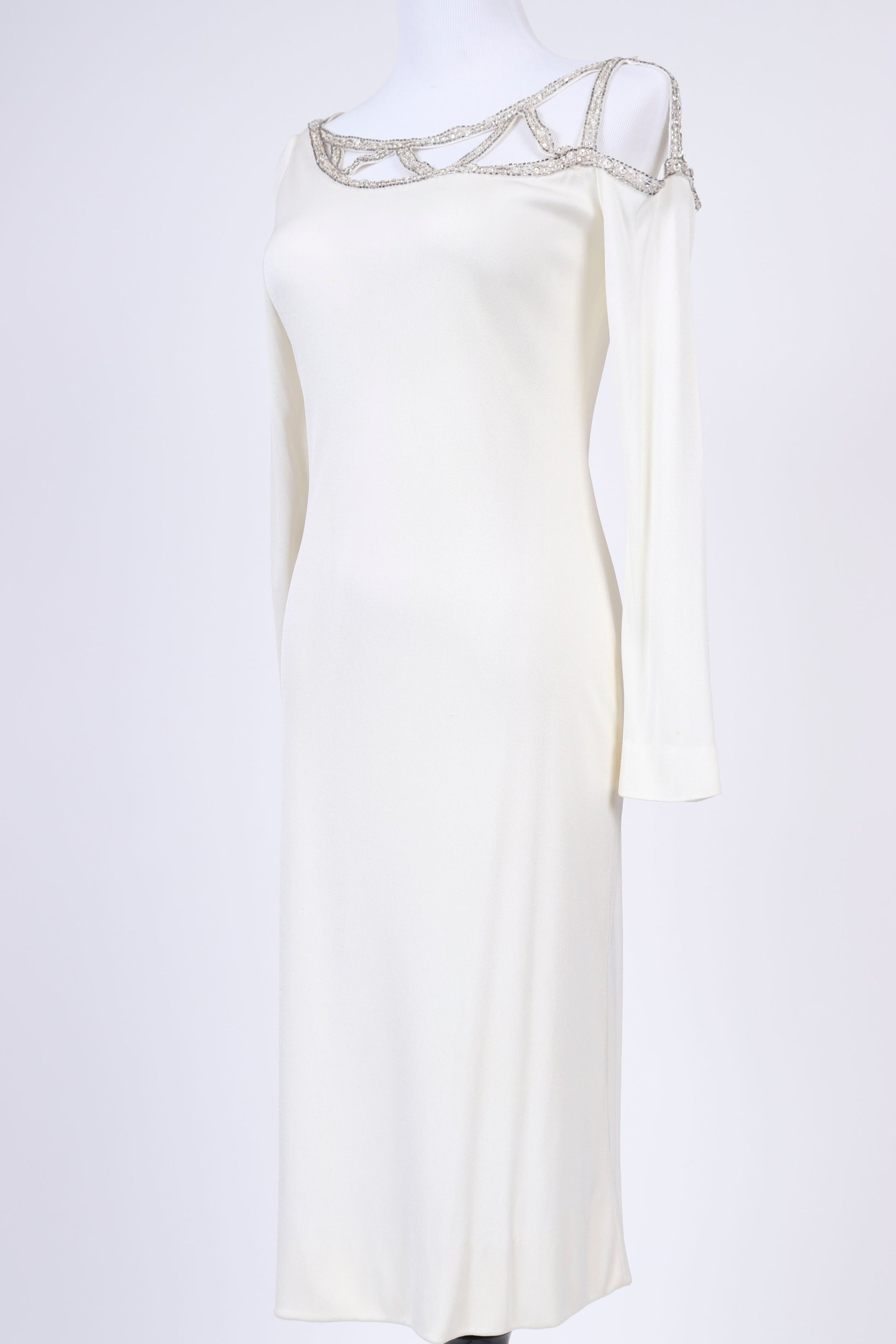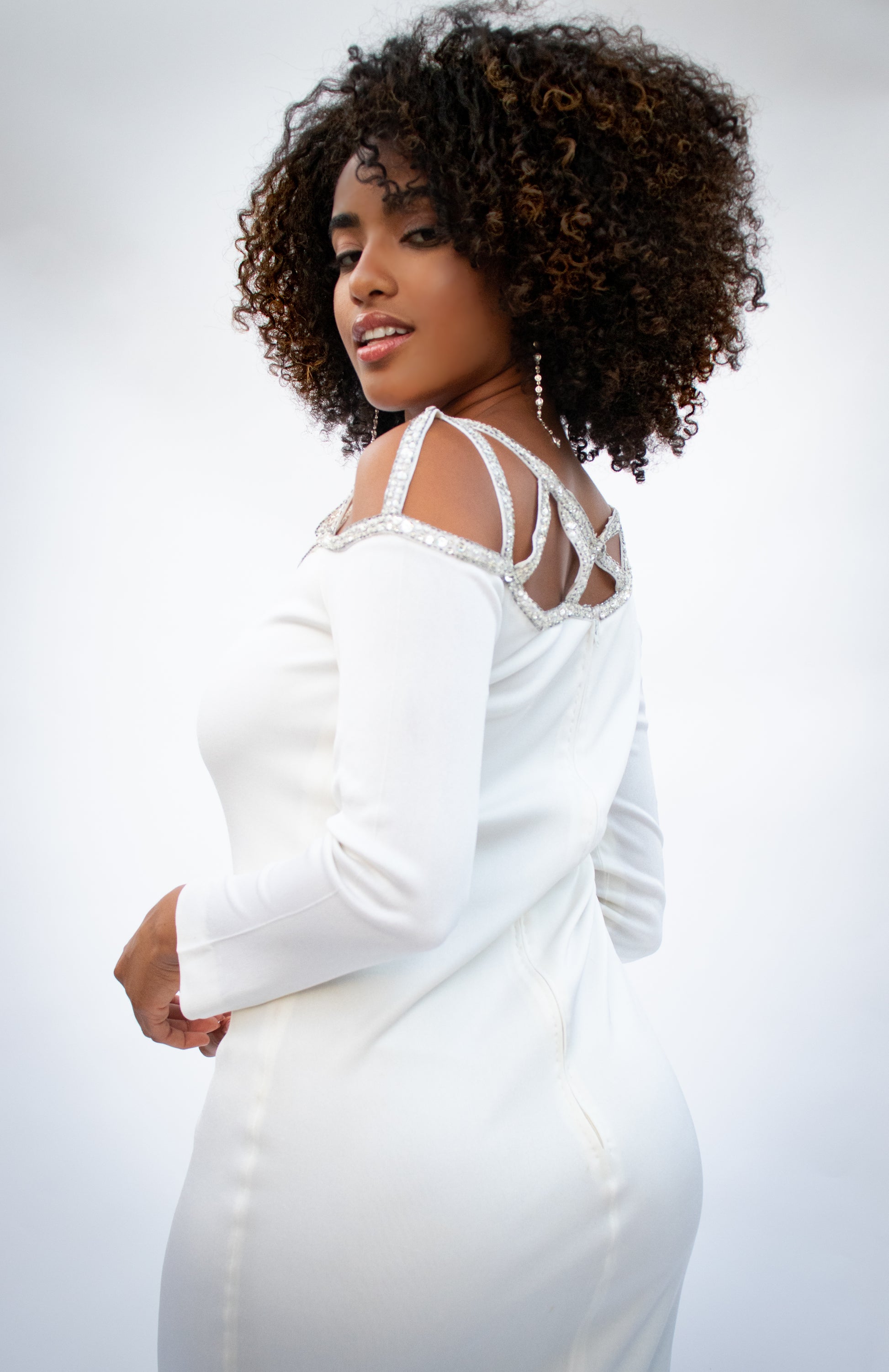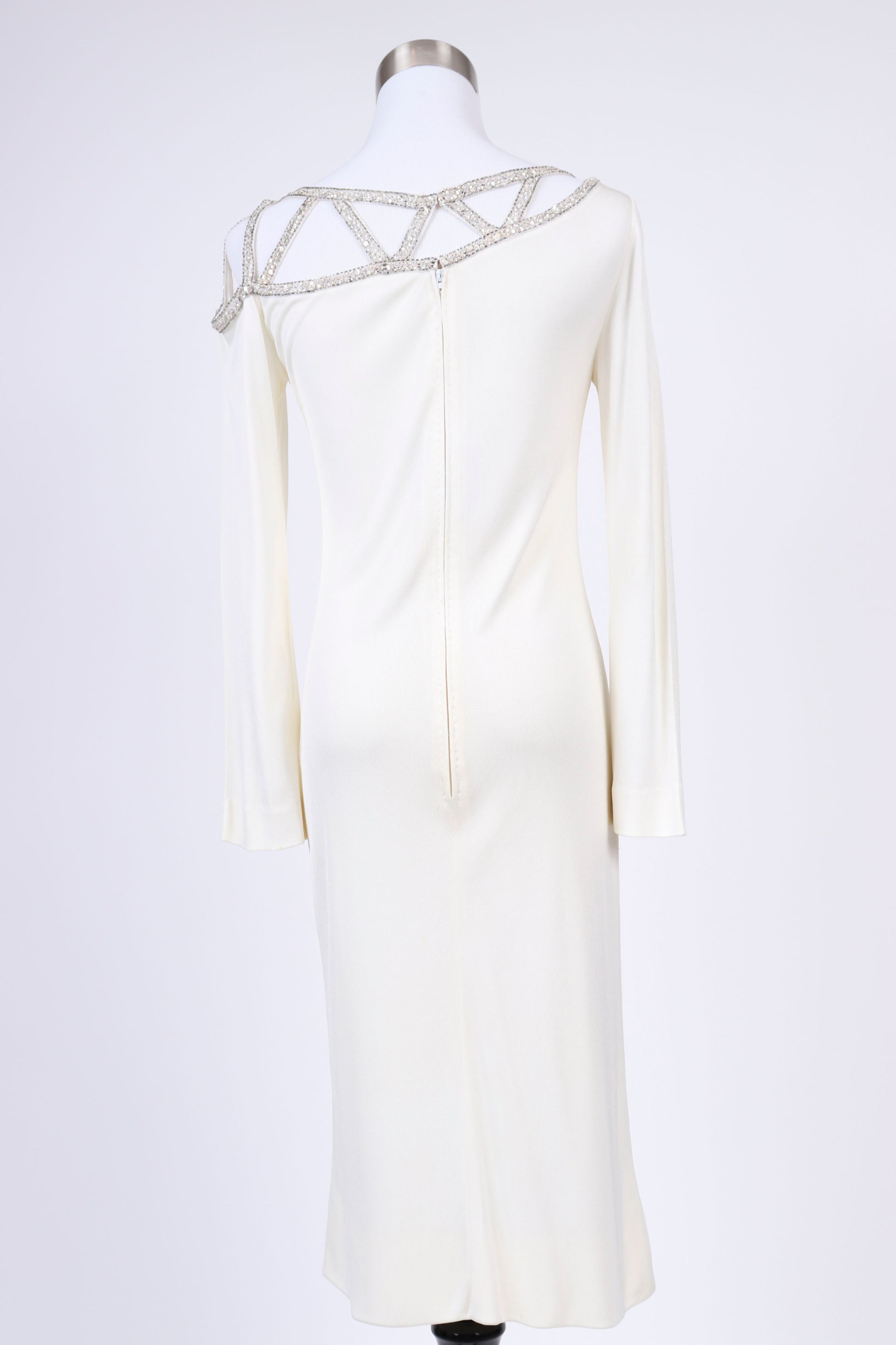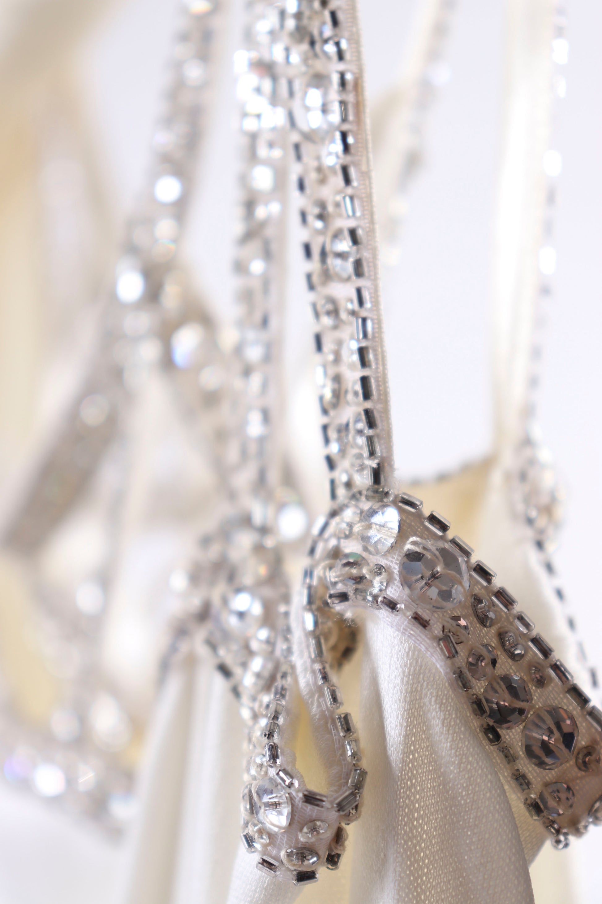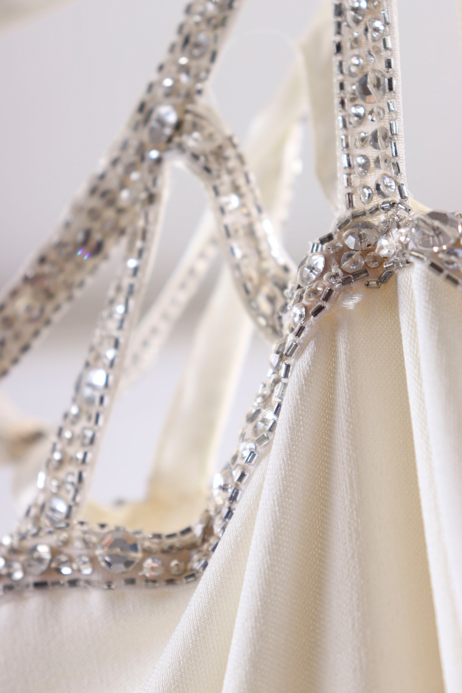 Made from heavy jersey stretch knit, unlined with zipper in back and hand sewn sequins and beading adorn the straps.