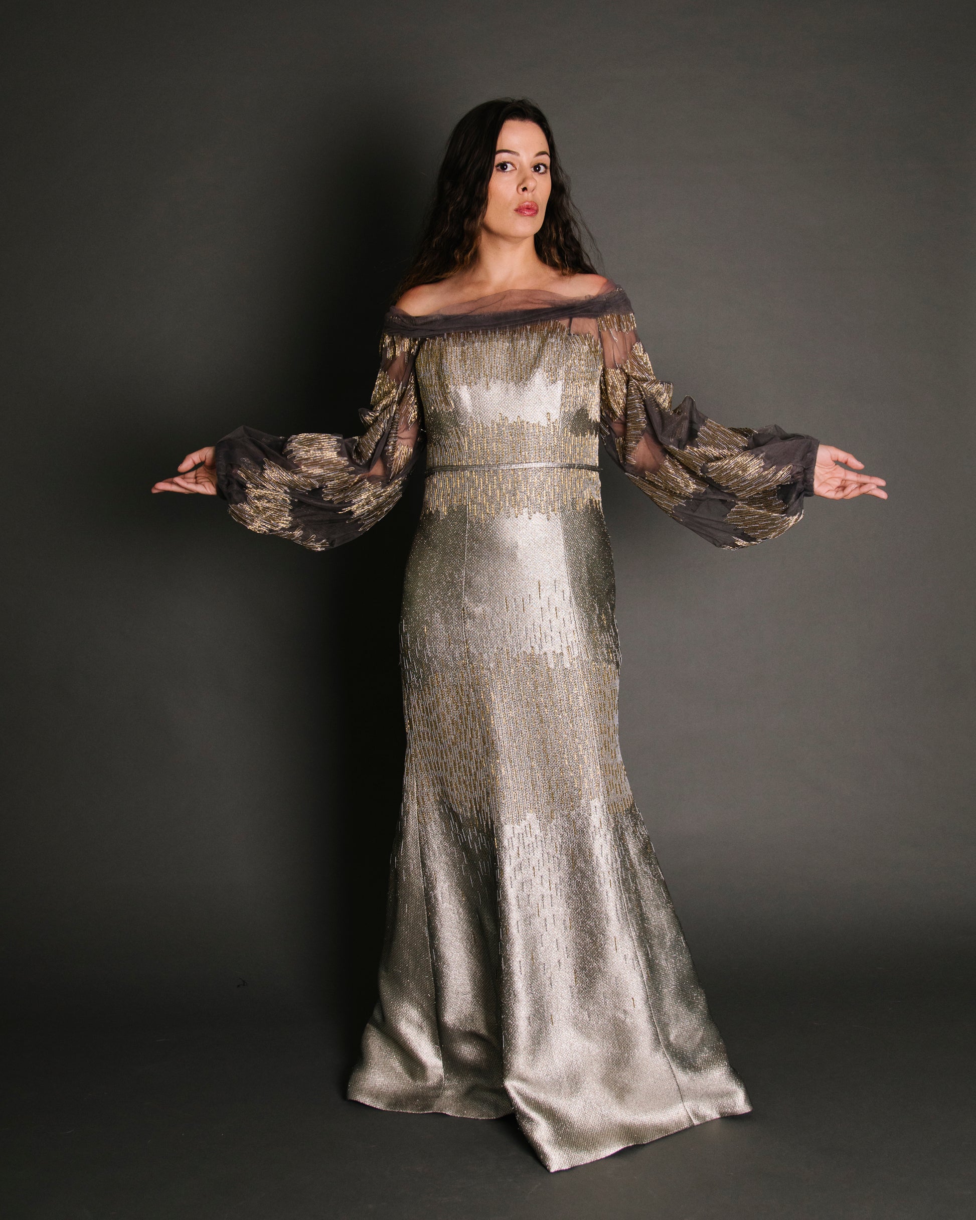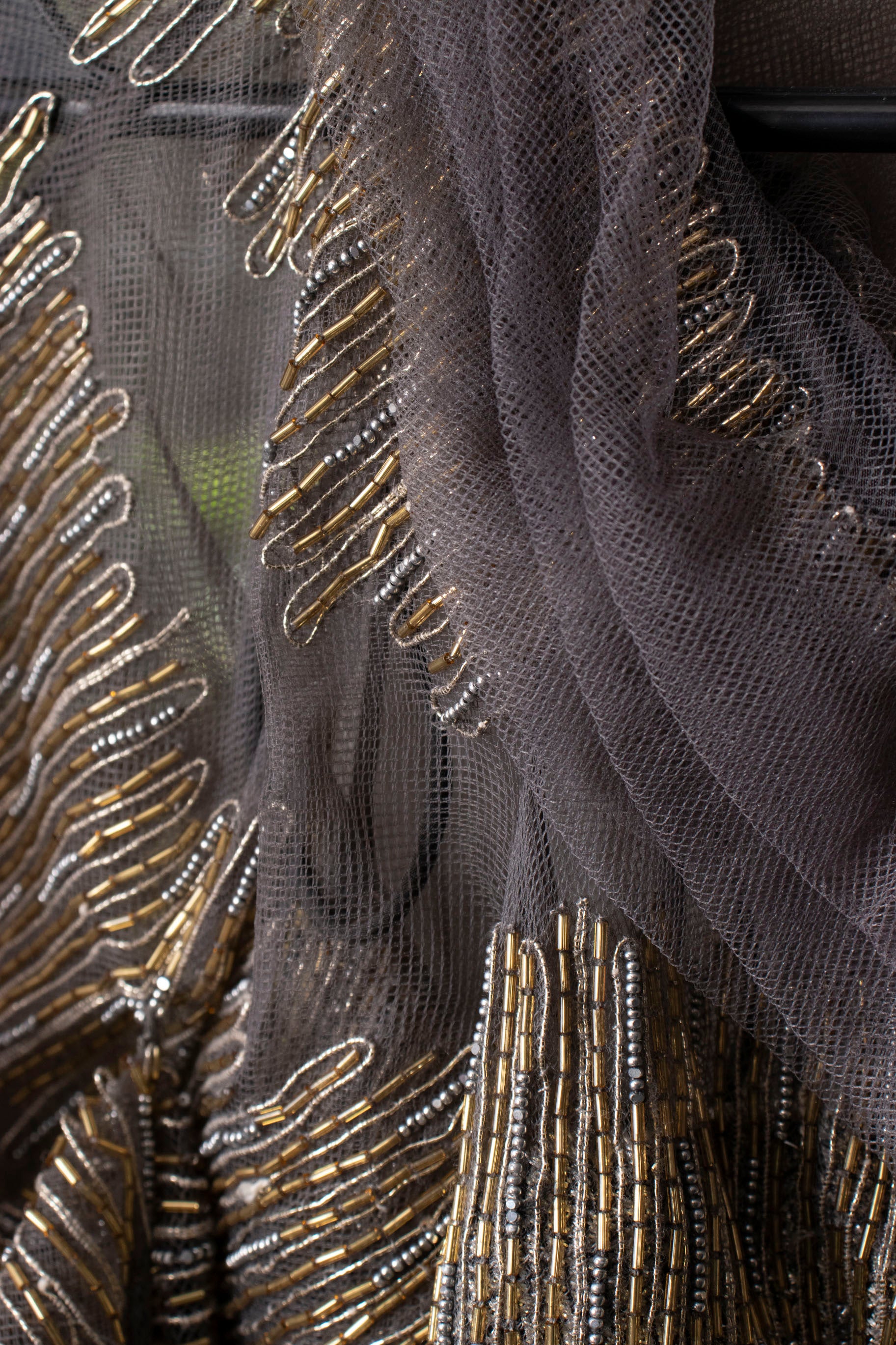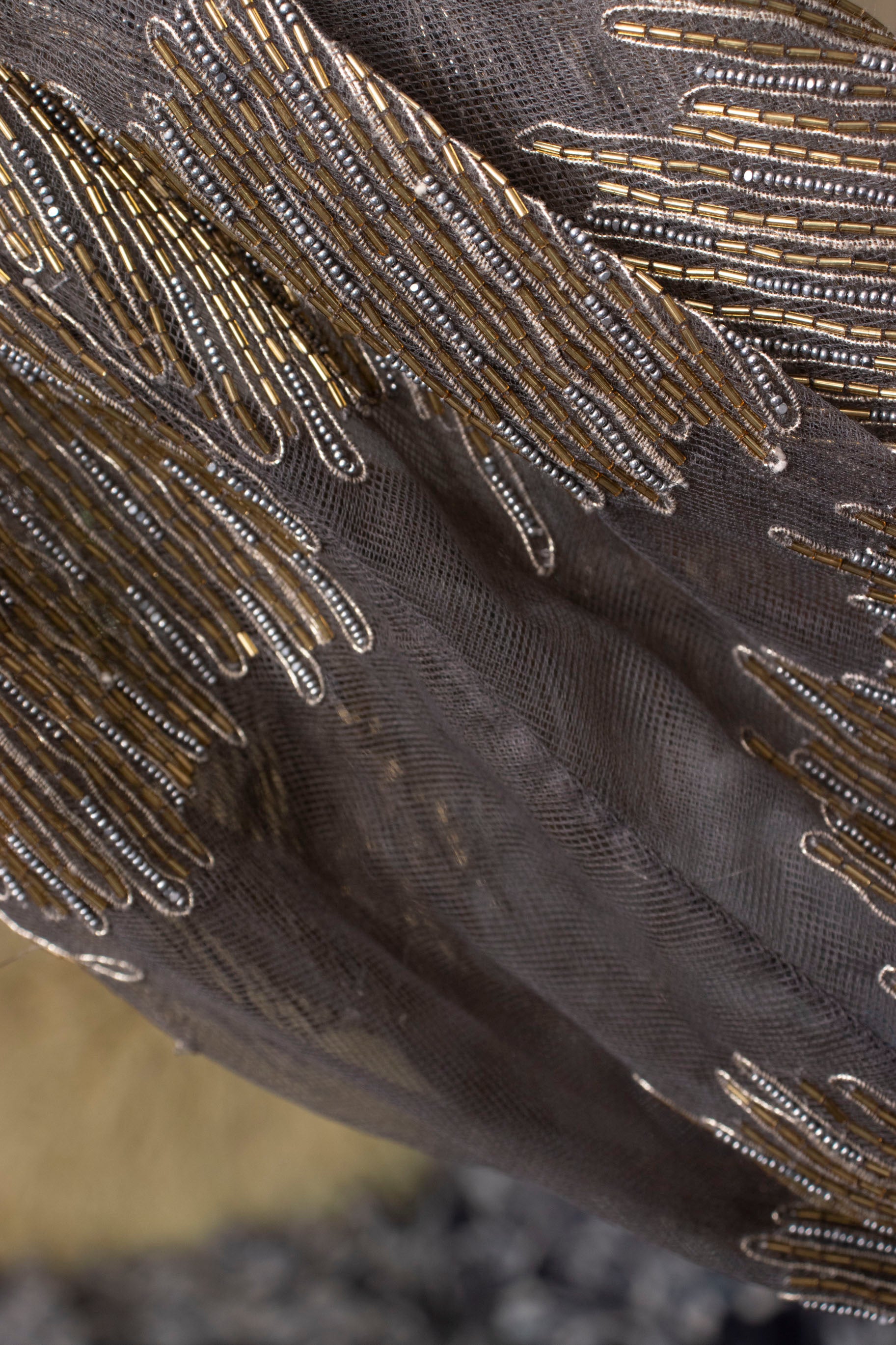 This stunning gown makes a bold impression! Crafted from a heavy woven silk and polyester blend, it features intricate silver and gold beadwork. The bias cut ensures a beautiful drape, while the balloon sleeves add a dramatic touch. A subtle train enhances its elegance and sparkle for evening wear. Details include tulle-trimmed boning in the bodice, a mini train, cream silk lining, and a back zipper. The semi-sheer, heavily beaded balloon sleeves hold their shape with 8-inch cuffs. Gently worn with tags, it has a faint interior stain on the back train.