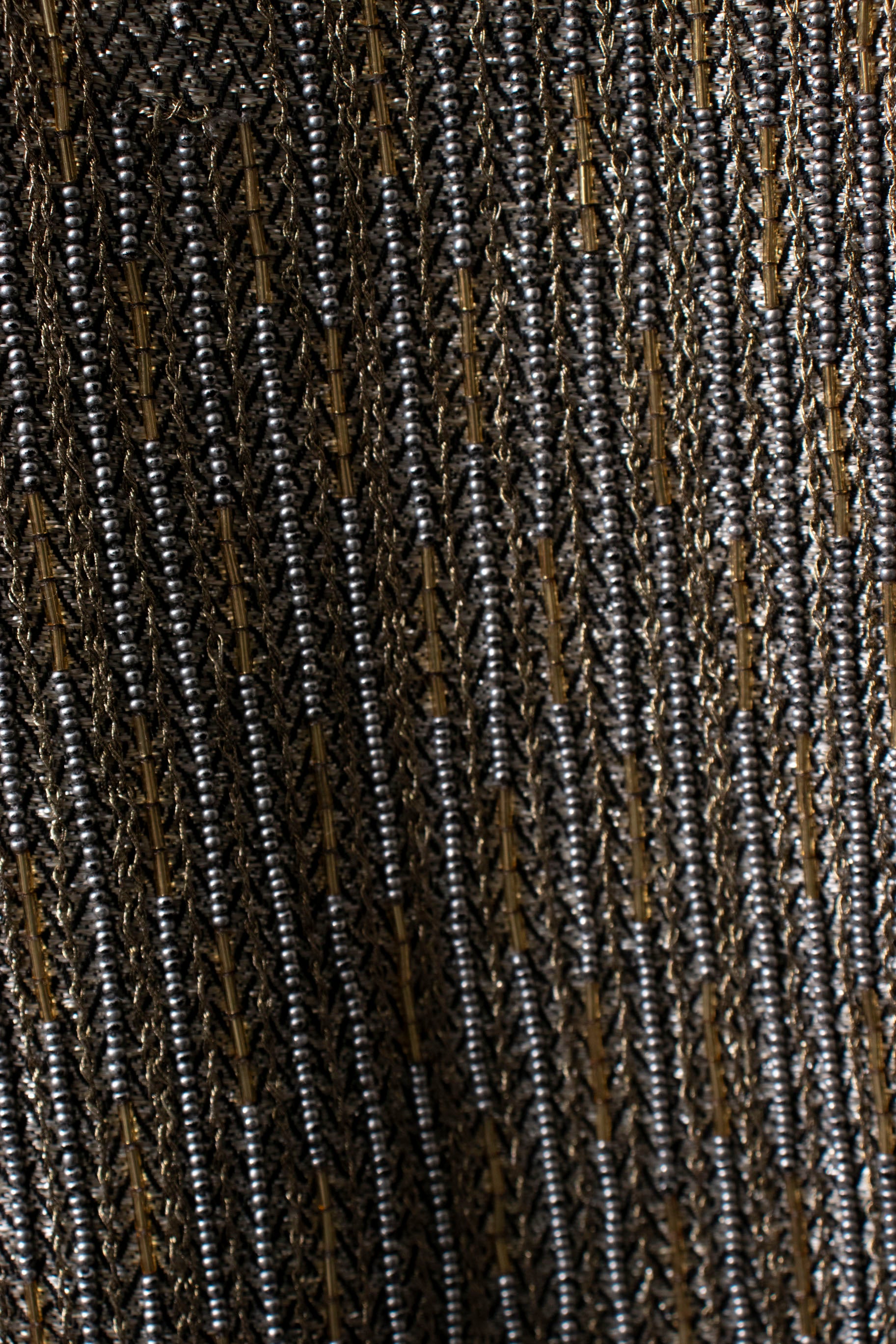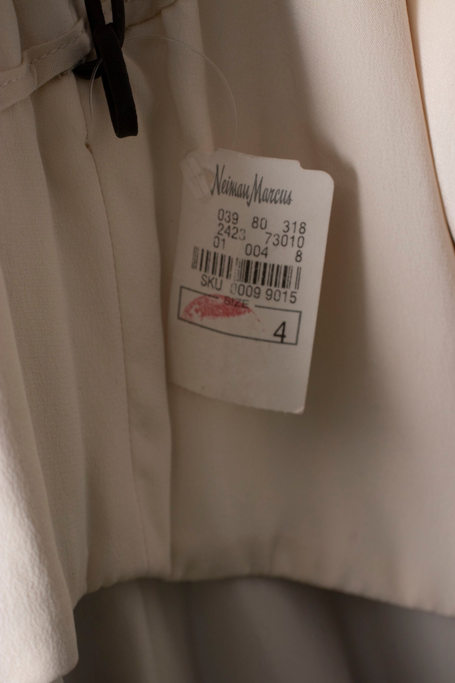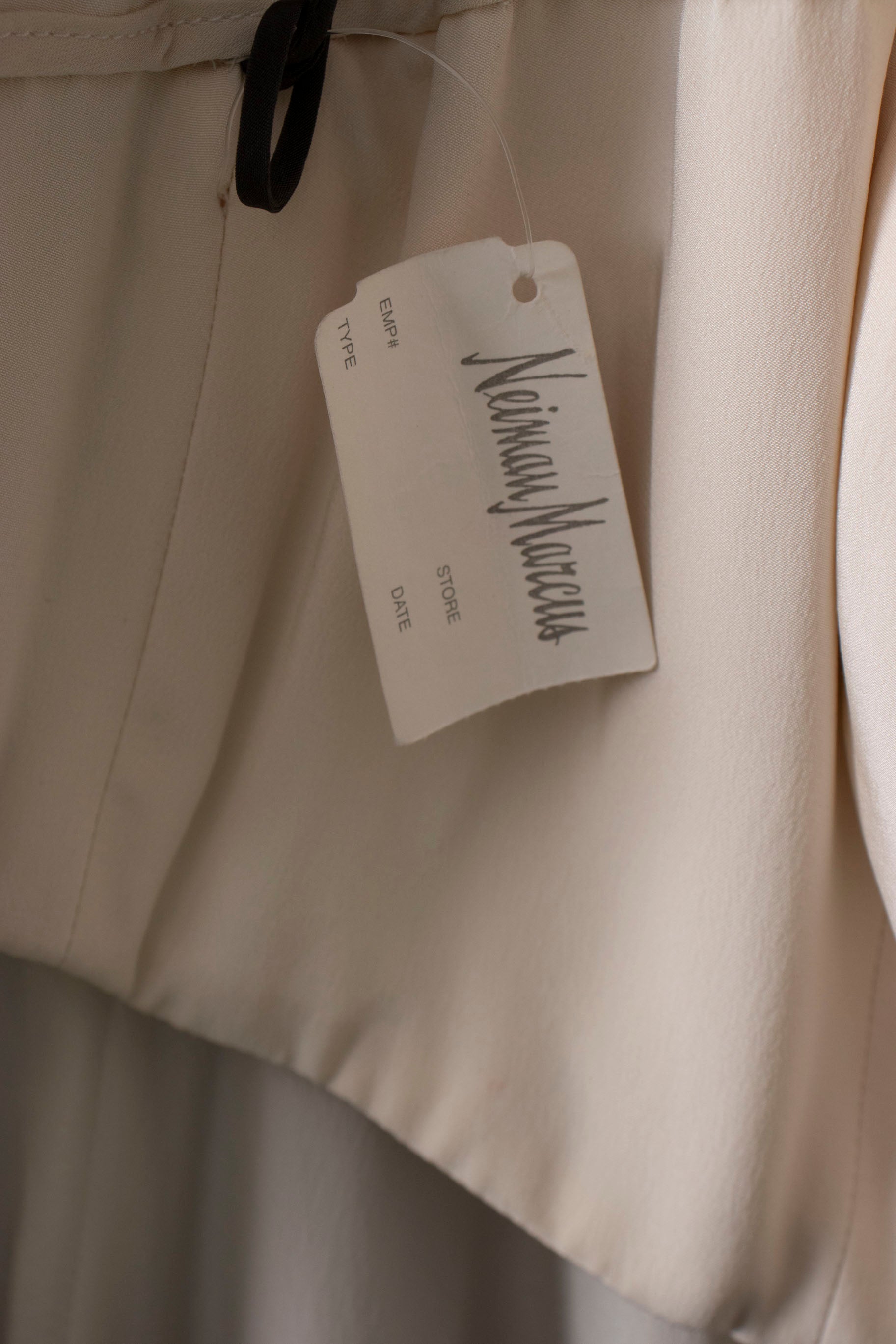 This stunning gown makes a bold impression! Crafted from a heavy woven silk and polyester blend, it features intricate silver and gold beadwork. The bias cut ensures a beautiful drape, while the balloon sleeves add a dramatic touch. A subtle train enhances its elegance and sparkle for evening wear. Details include tulle-trimmed boning in the bodice, a mini train, cream silk lining, and a back zipper. The semi-sheer, heavily beaded balloon sleeves hold their shape with 8-inch cuffs. Gently worn with tags, it has a faint interior stain on the back train.