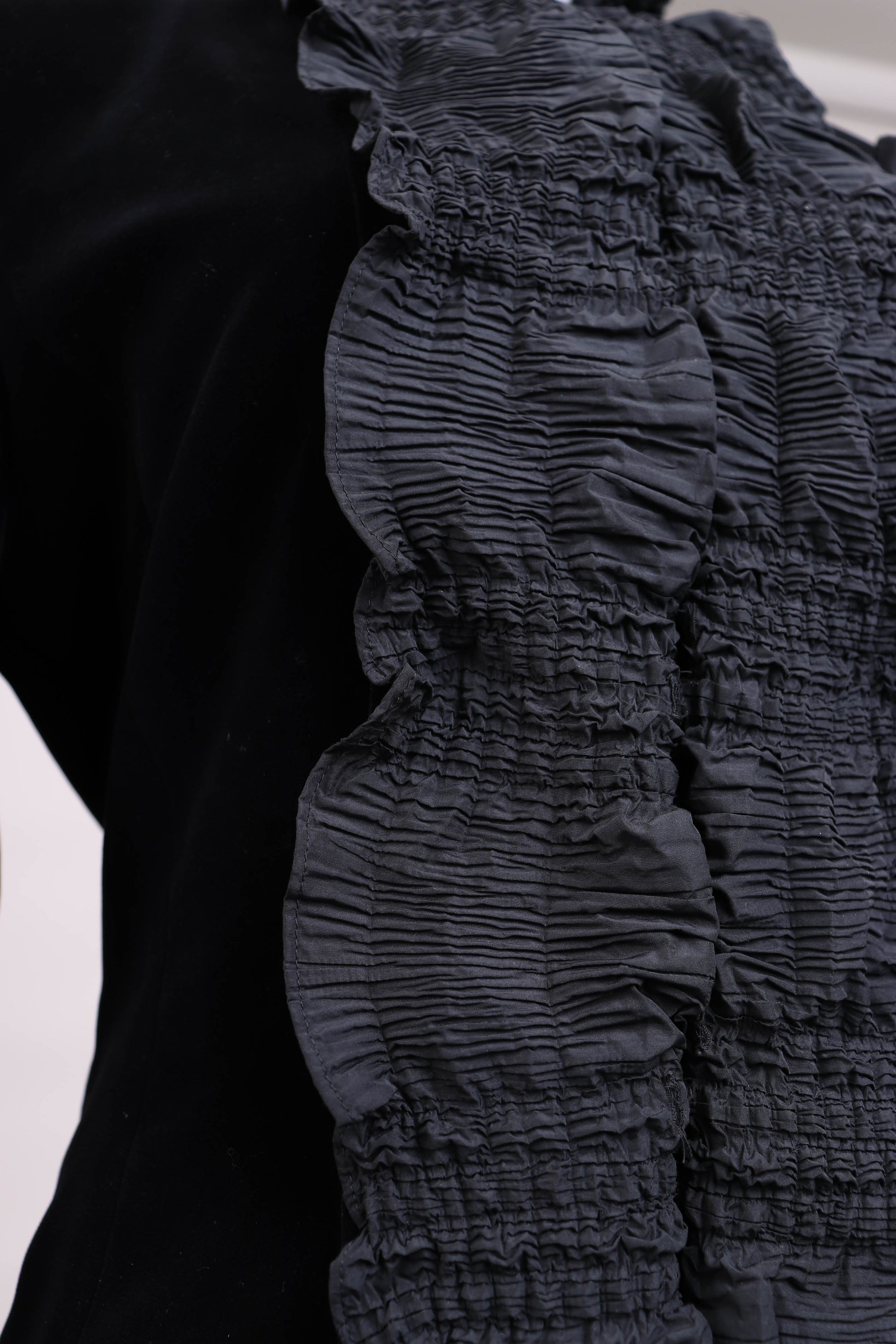 Stunning black velvet is adorned with expertly rouched and stretchy, cotton crepe fabric on the bodice, collar lining and foldable cuffs. Fully lined, she zips up the front and has a beautifully designed collar with small velvet lapels.