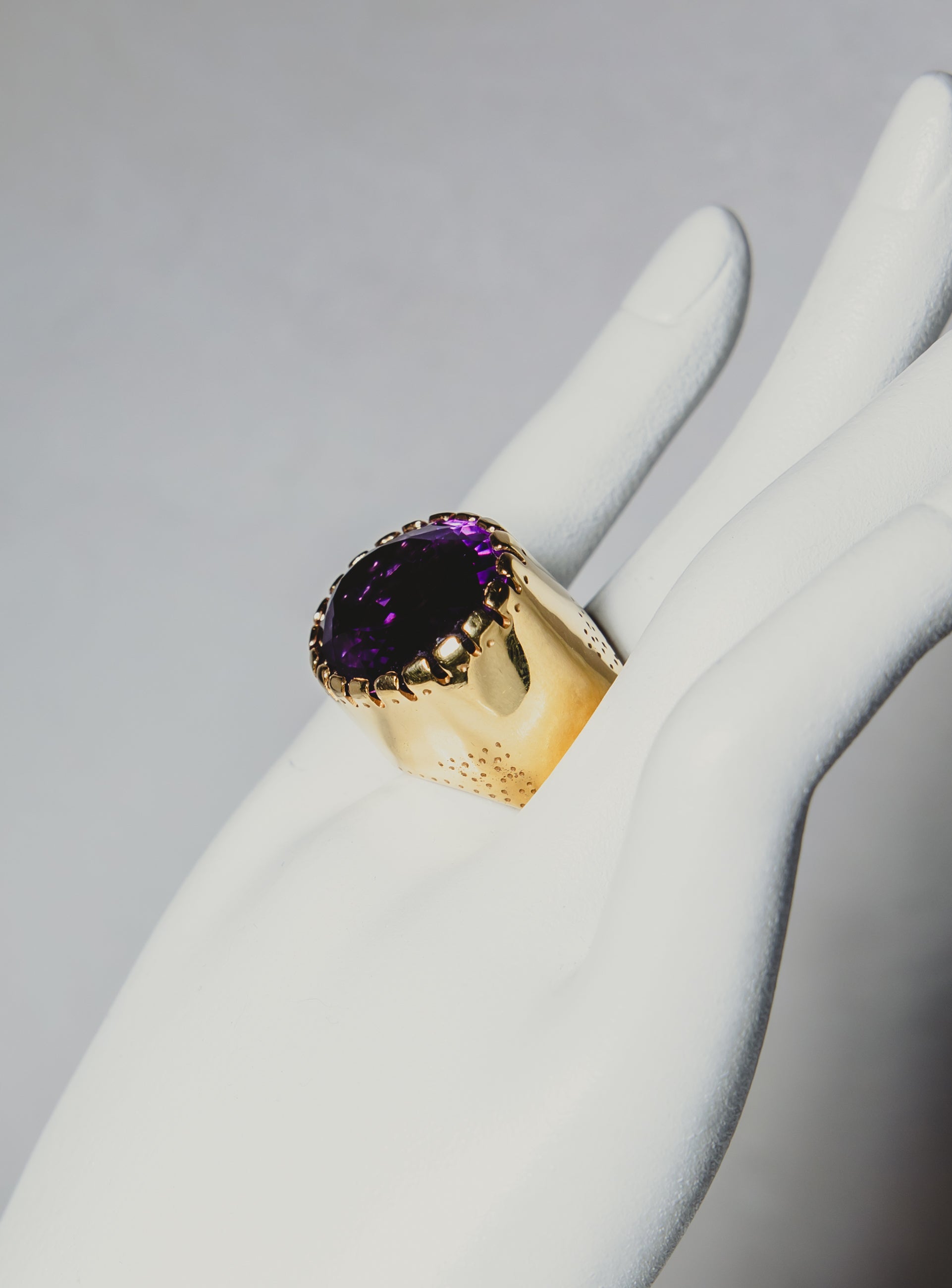 Embrace your individuality with this lavish Amethyst & Gold Cocktail Ring. Intricately made with a shimmering gold overlay, this bezel set beauty is the best way to show off your unique style. Make an unforgettable statement with this one-of-a-kind ring.