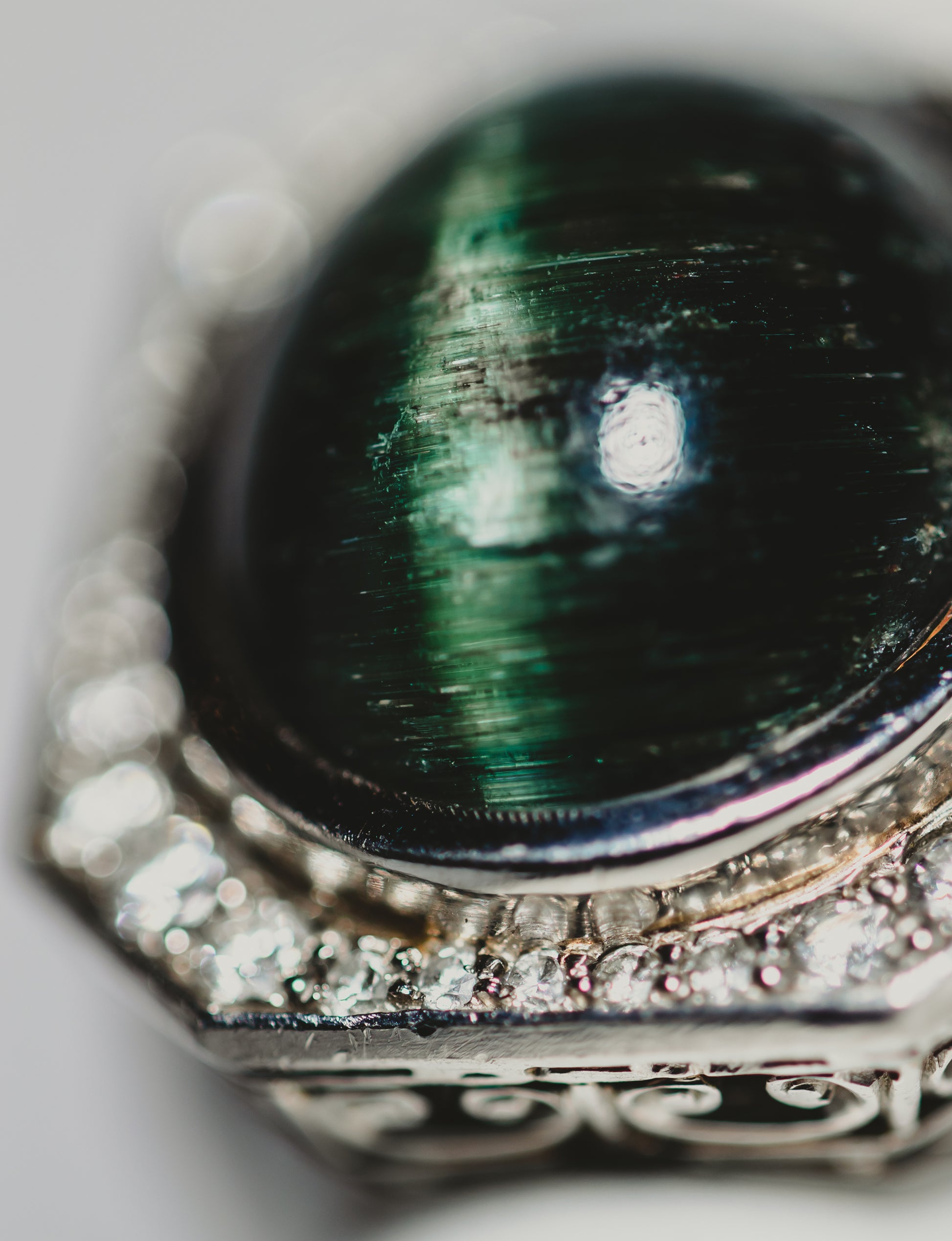 Art Deco Cat’s Eye Tourmaline & Diamond Ring in 14K White Gold.