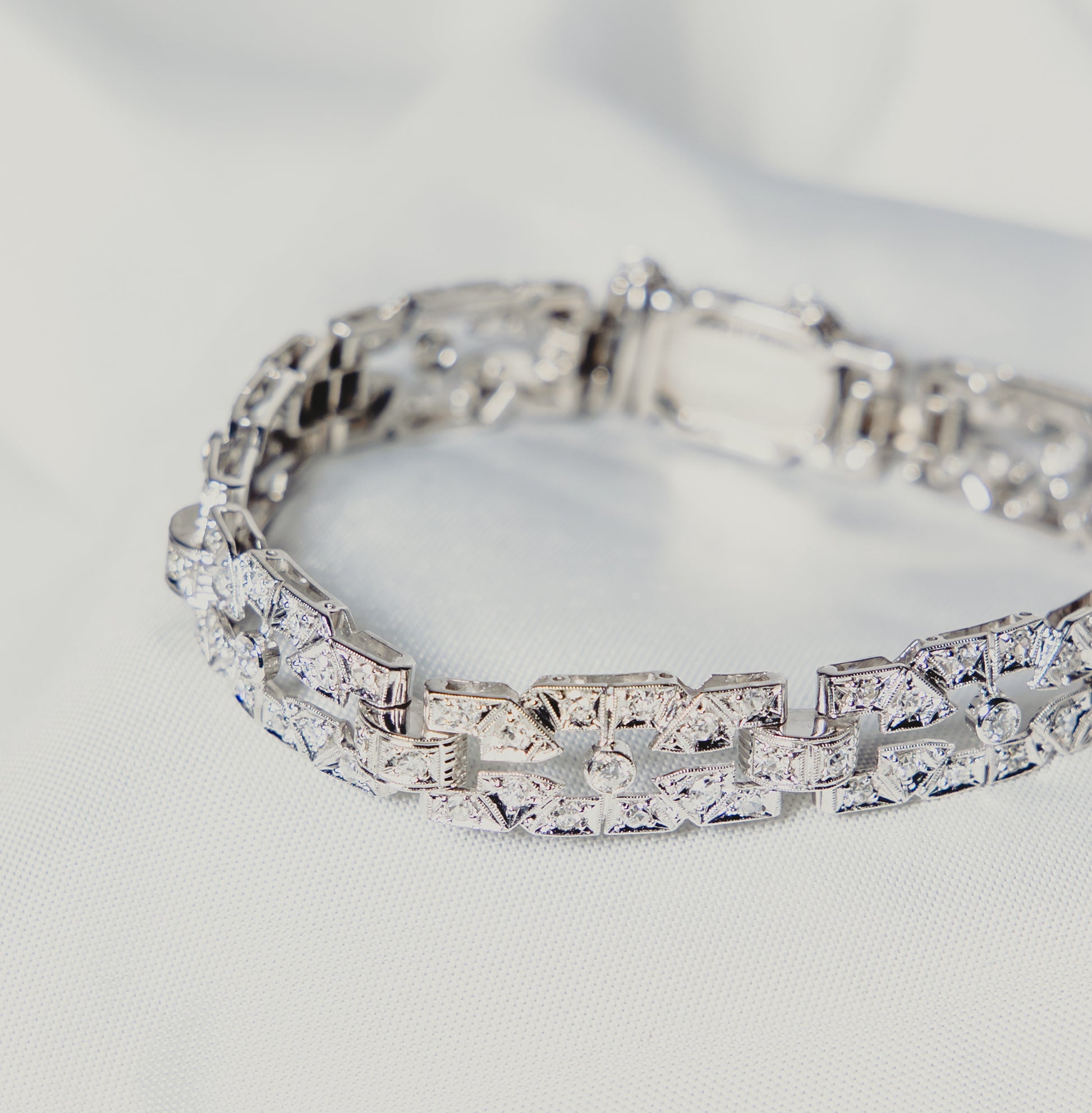 A sparkling array of small cut, brilliant diamonds and finely crafted links distinguish this delightful Depression-era wrist bauble.