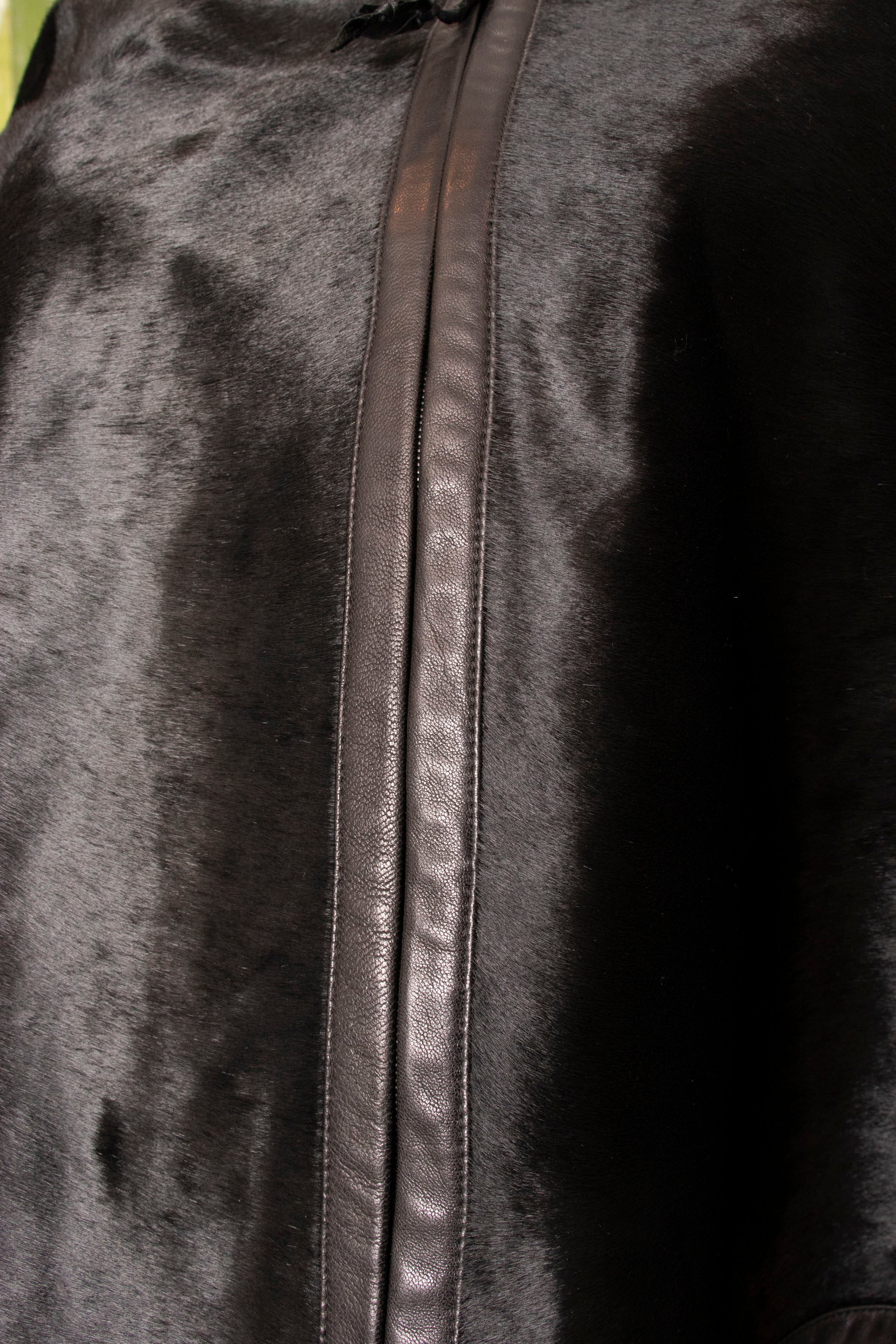 - Fabric: No Content Tag, black pony hair, black calfskin leather, synthetic black silky lining.