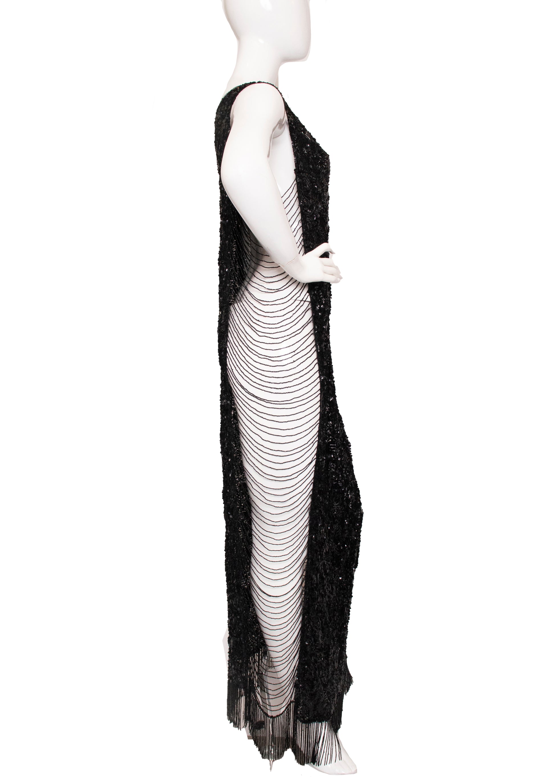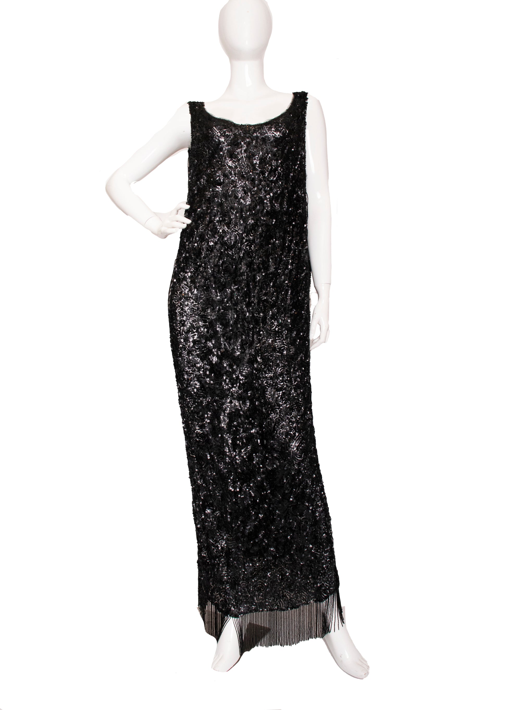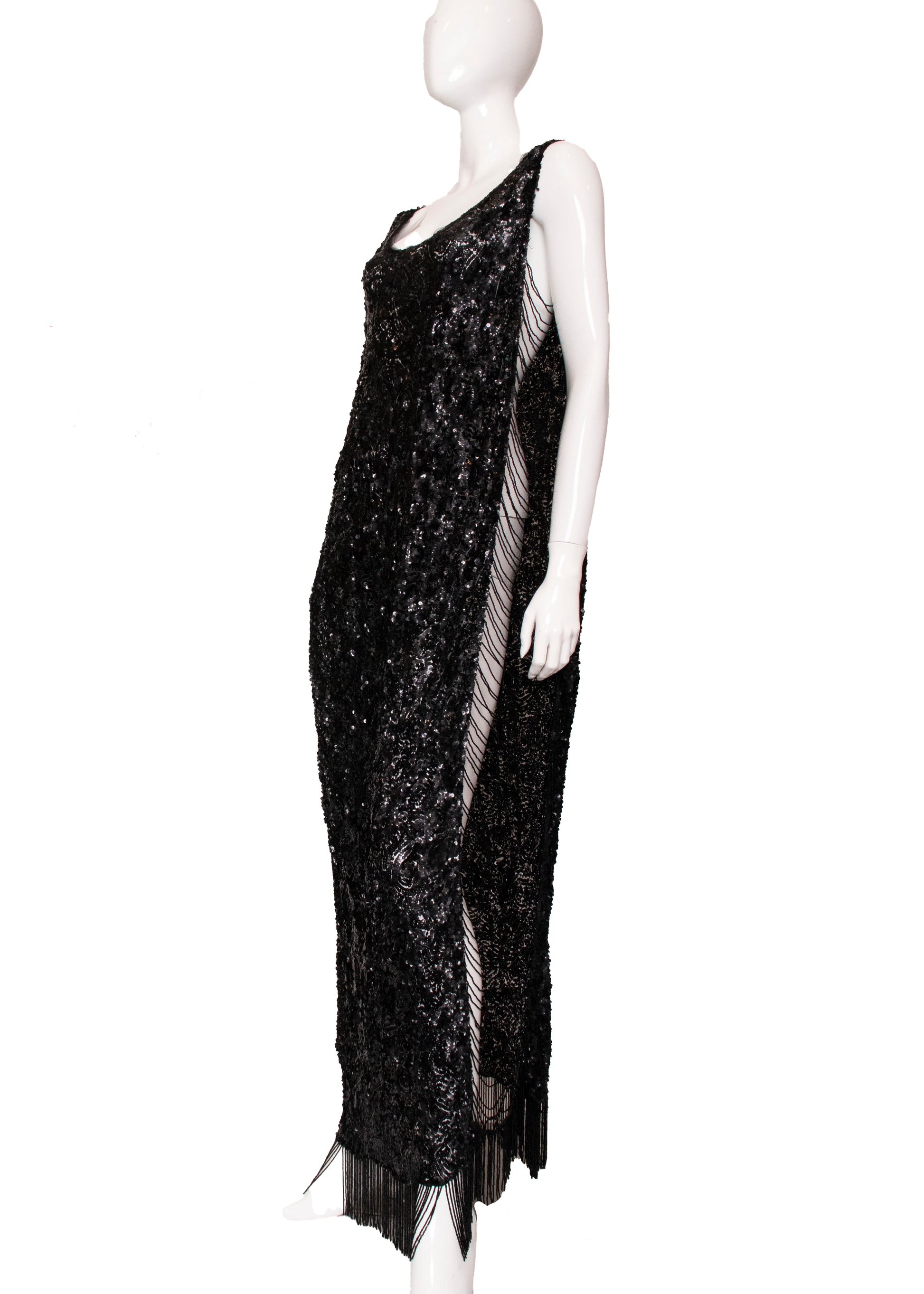This Antique Black Sequin Cocktail Dress is truly exceptional, showcasing remarkable craftsmanship and quality that make it a standout favorite. It features two black sequin tank-style panels connected by strings of black beads along the sides. The sequined fabric is light, while the beads and hem add a captivating weight. Its simple silhouette allows for easy alterations, and the signature open sides offer endless styling possibilities to make it uniquely yours.