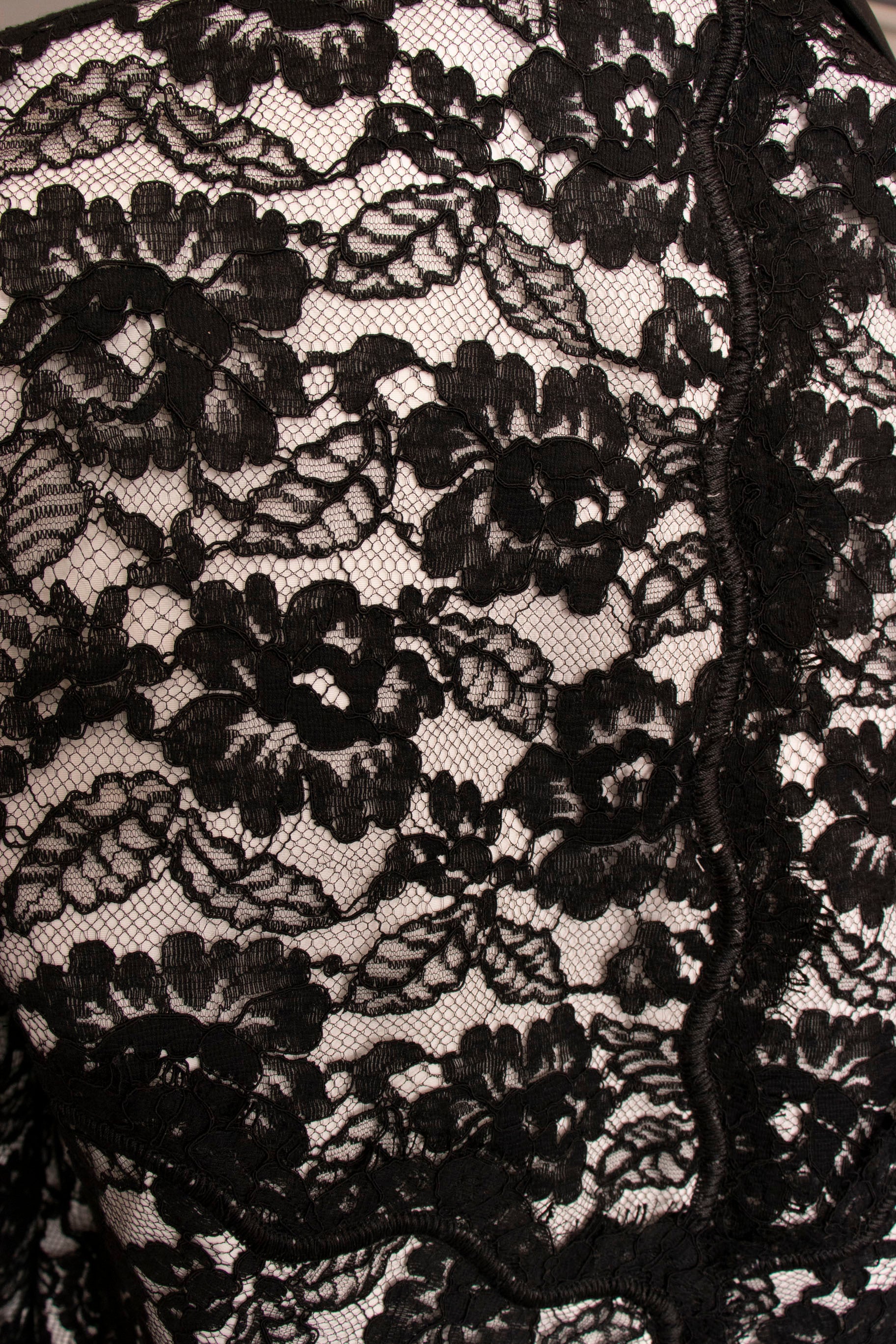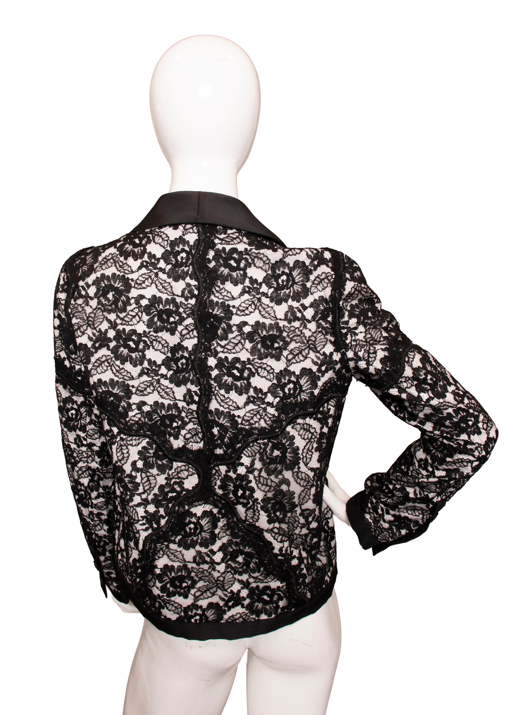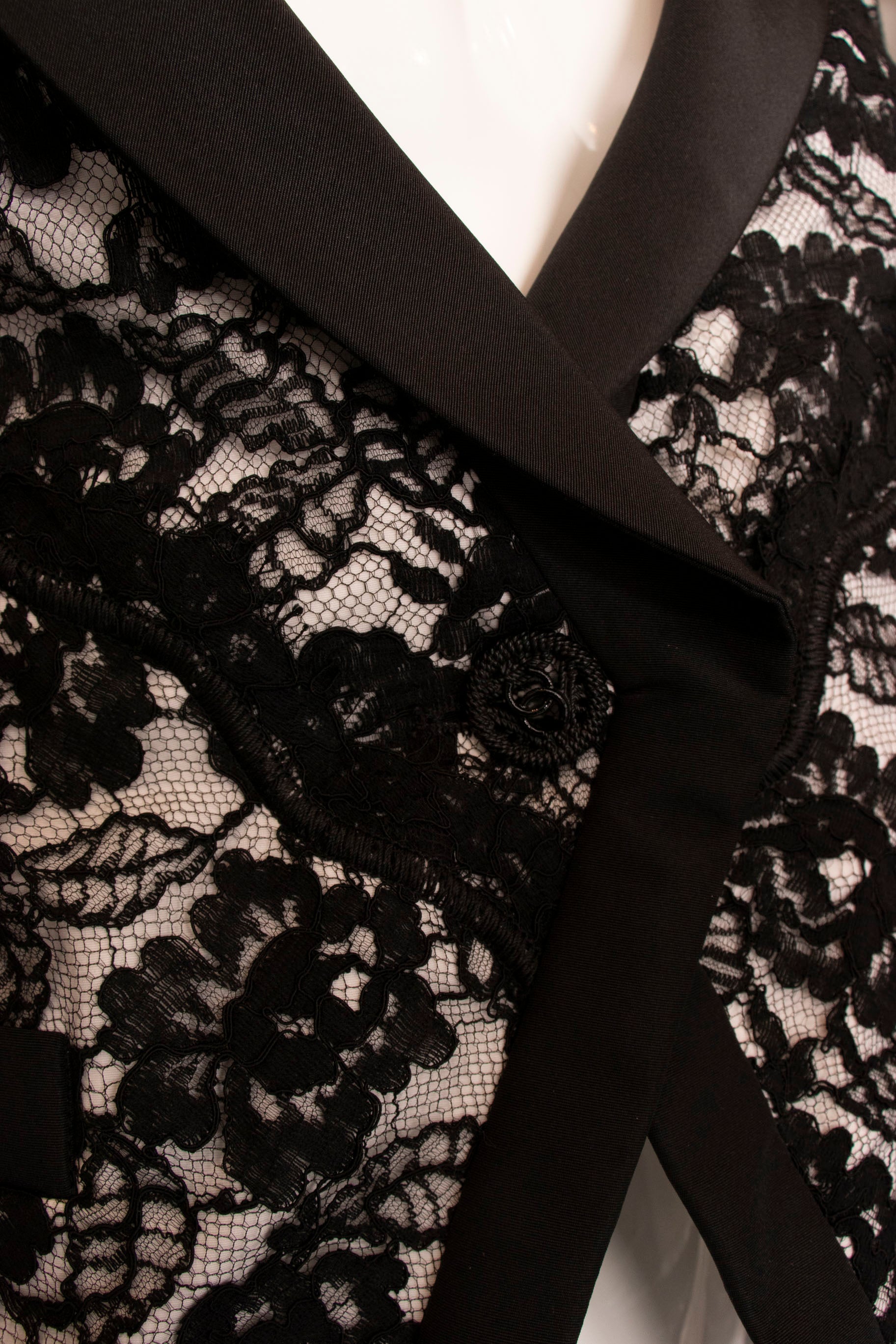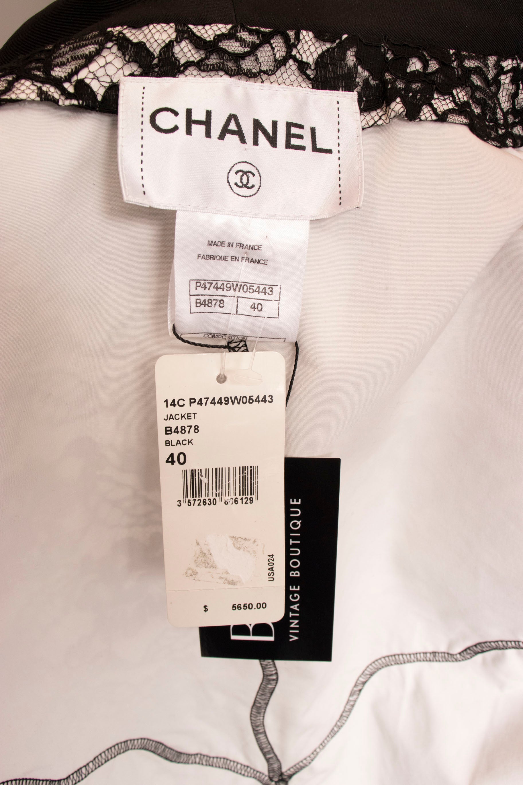 A stunning piece from Chanel's Cruise Spring 2015 collection, this black lace jacket features an elegant overlay of delicate lace atop crisp white cotton. The modern cut flatters beautifully, and with tags still attached, it's unworn and ready to make its mark. Originally styled by Janelle Monáe with a high-neck white blouse and black leggings, this timeless combination proves how versatile and effortlessly chic this jacket truly is.