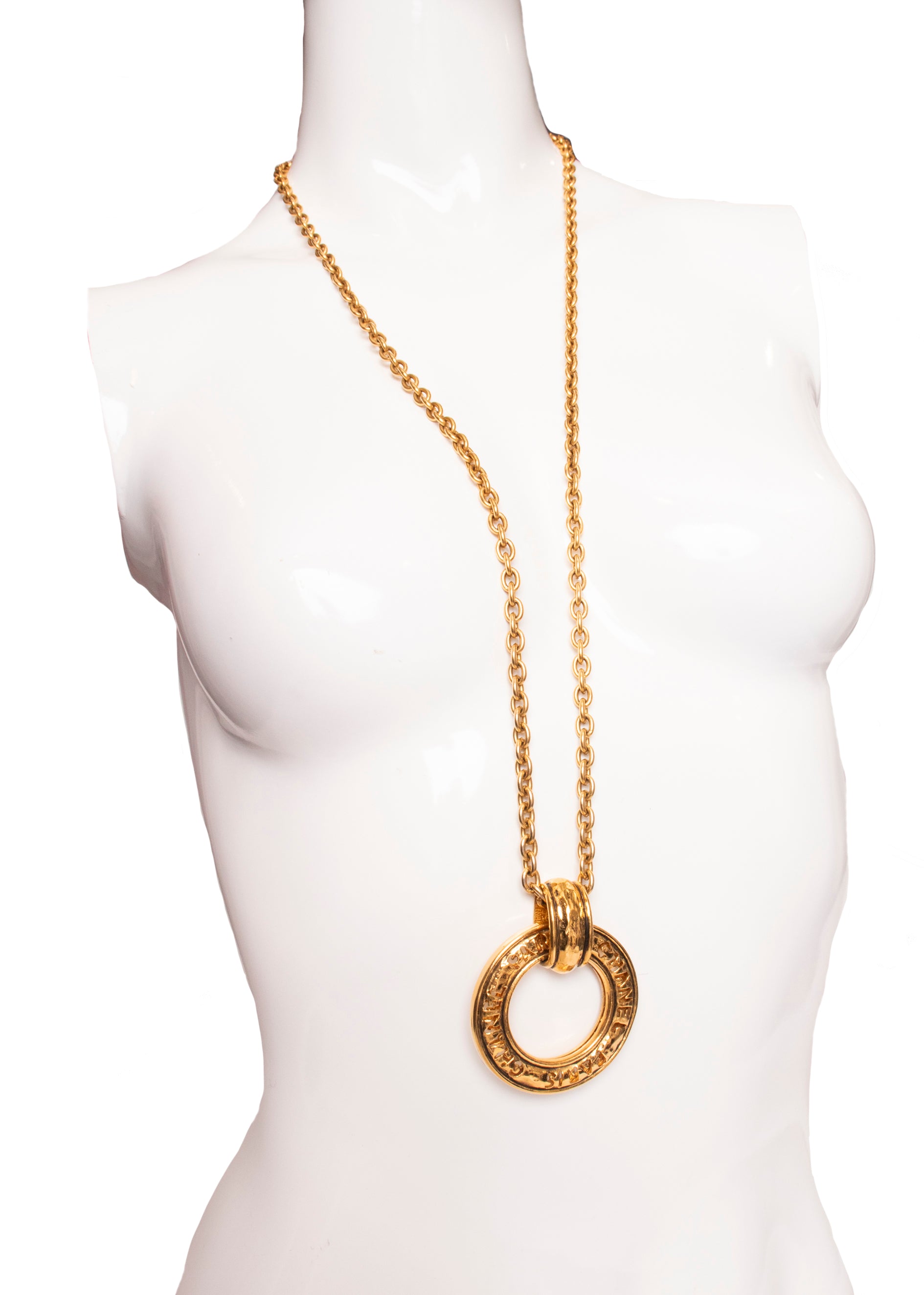 This iconic Chanel Paris Loupe Pendant necklace combines timeless elegance with functional charm. Showcases a striking pendant in 24 karat gold plating, complete with the signature Chanel Paris detailing. This 1980s-90s treasure features a substantial chain that offers versatile styling—wear it long or double it up for bold impact.