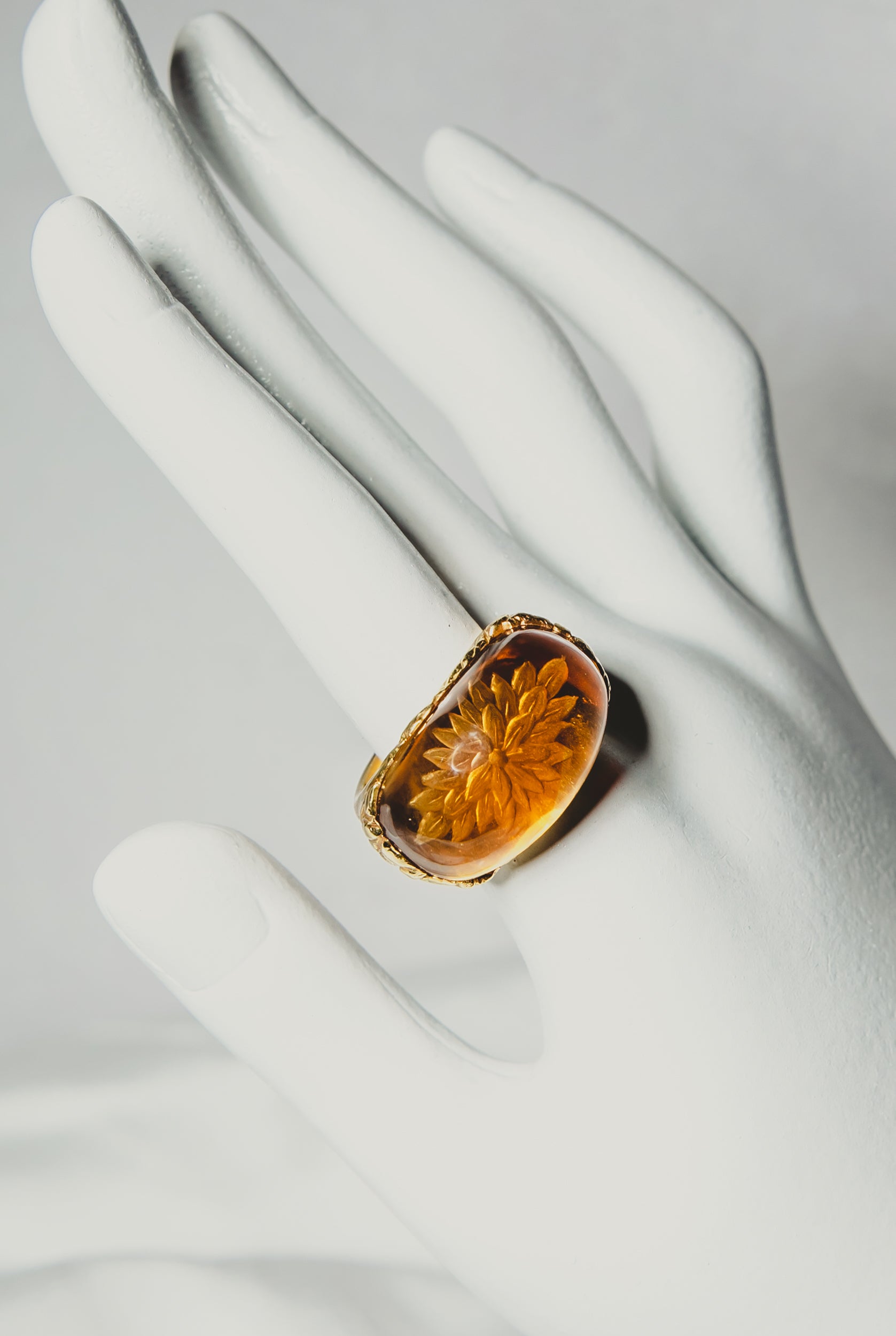 From the fabled German gem cutting center Idar-Obersteinin, we are just giddy over this ring. The wax casting was lost in the citrine and the illusion is mesmerizing.