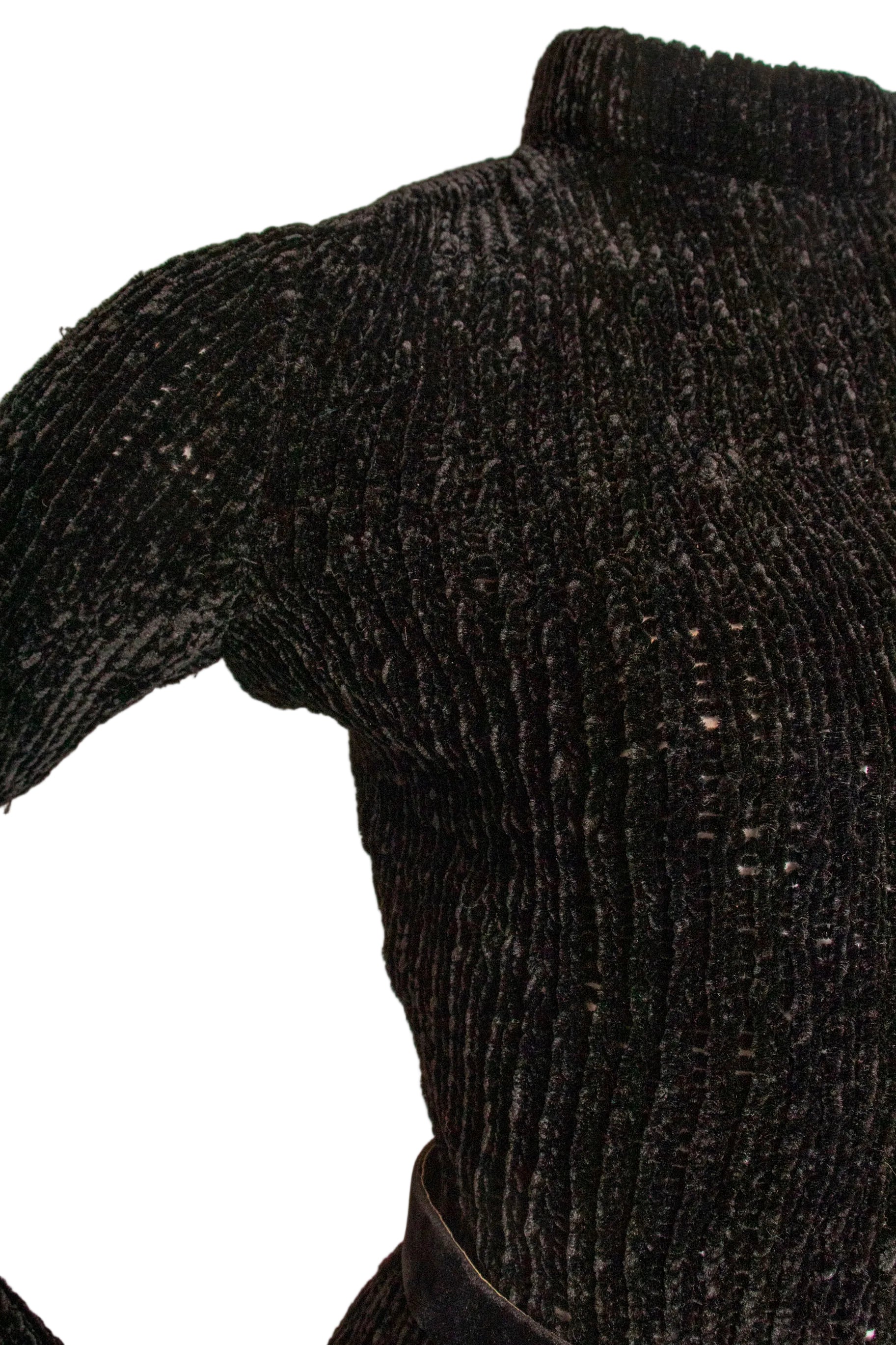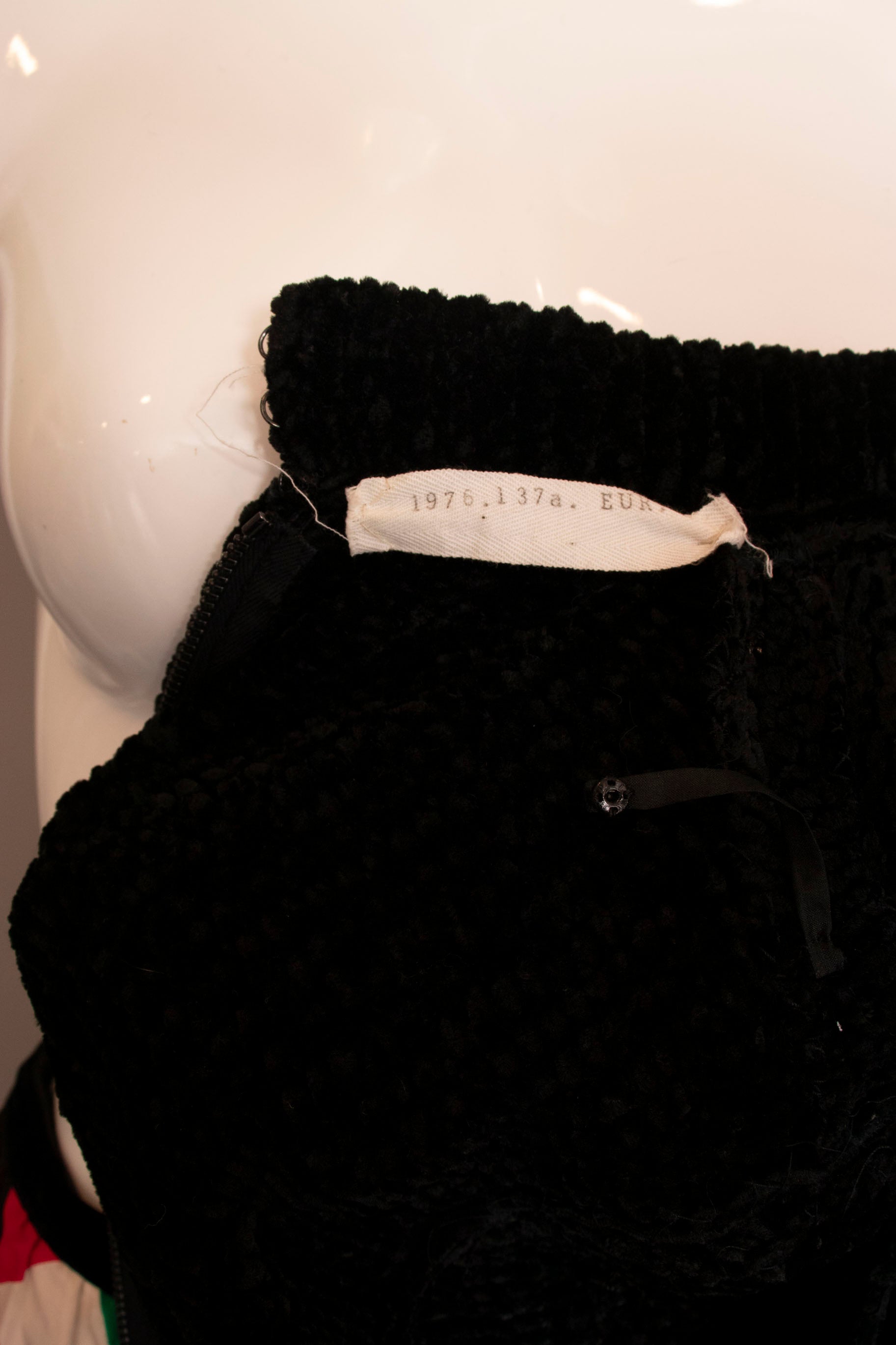 - Features back zipper that stops 2 inches above waist, 2 hook closures at mock neck.