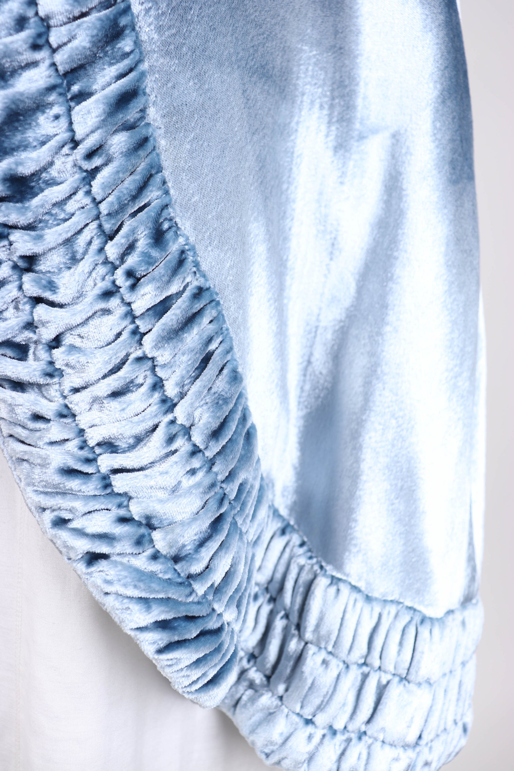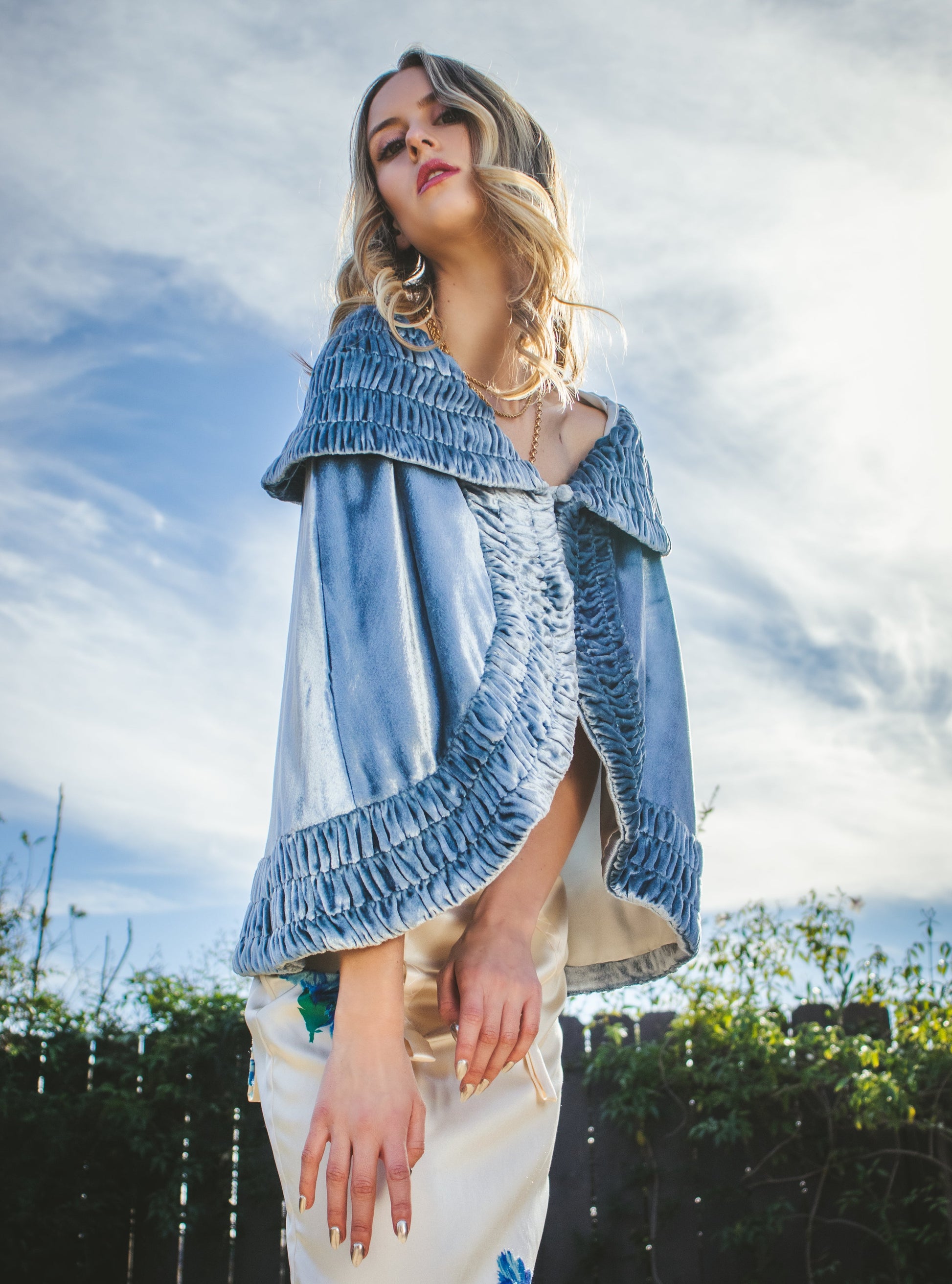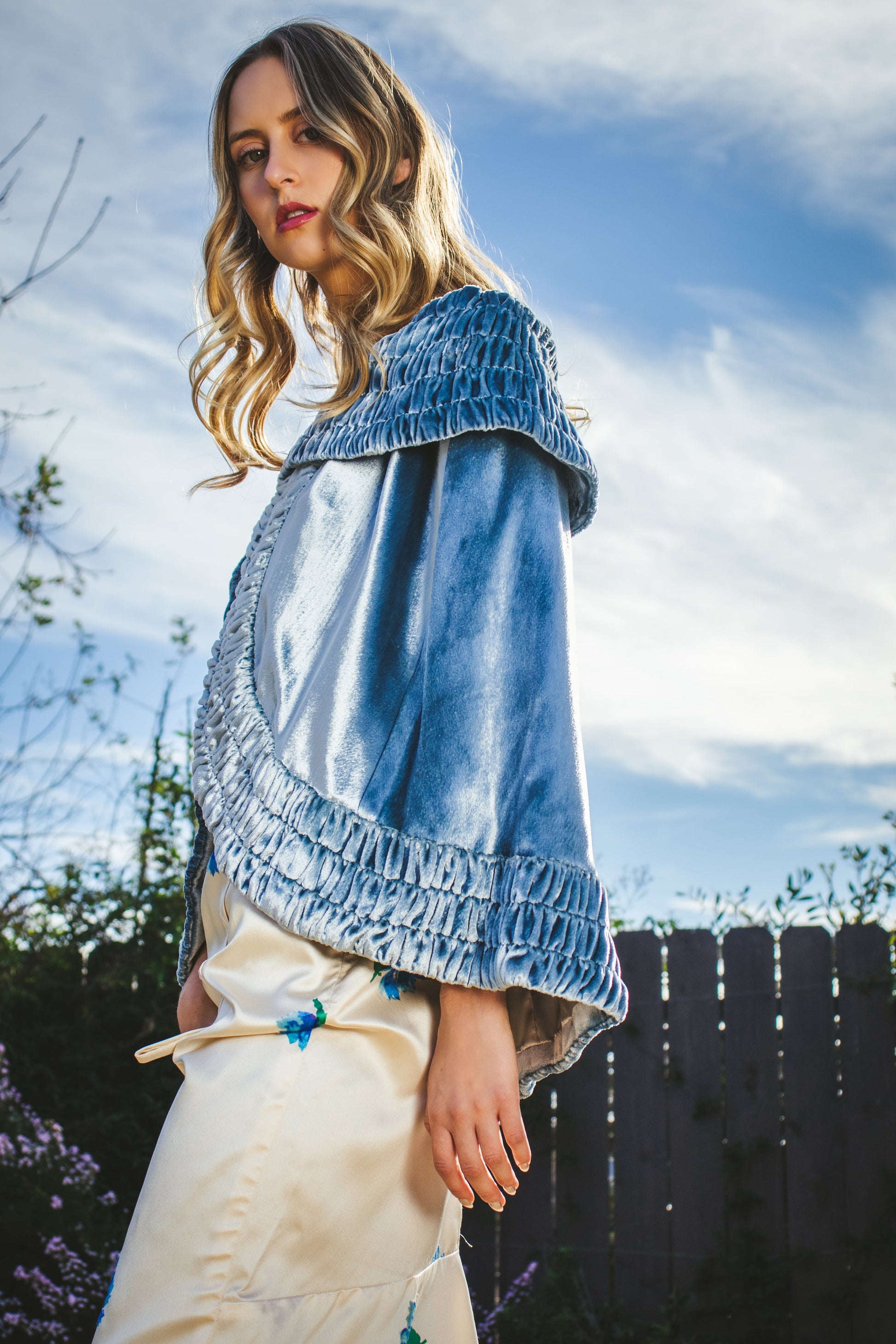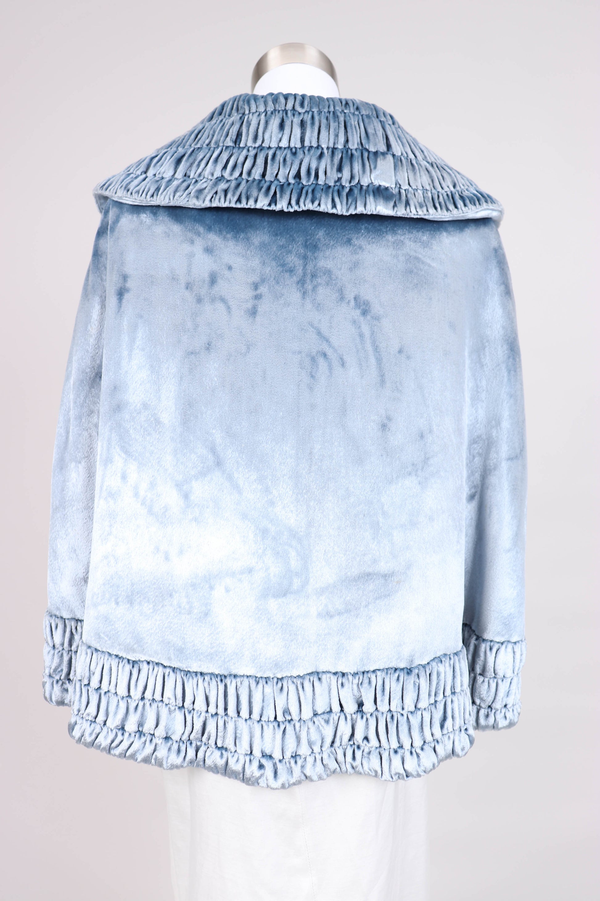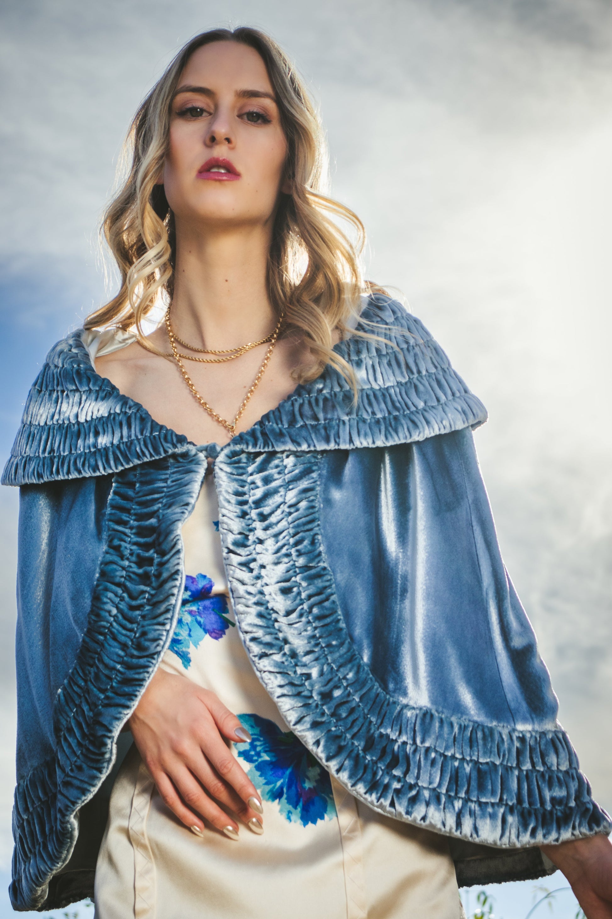 Expertly ruched velvet creates a wide, soft shawl collar and trim. Fully lined in a powder blue satin, she pairs beautifully with pastels and patterns and is iconic with black.