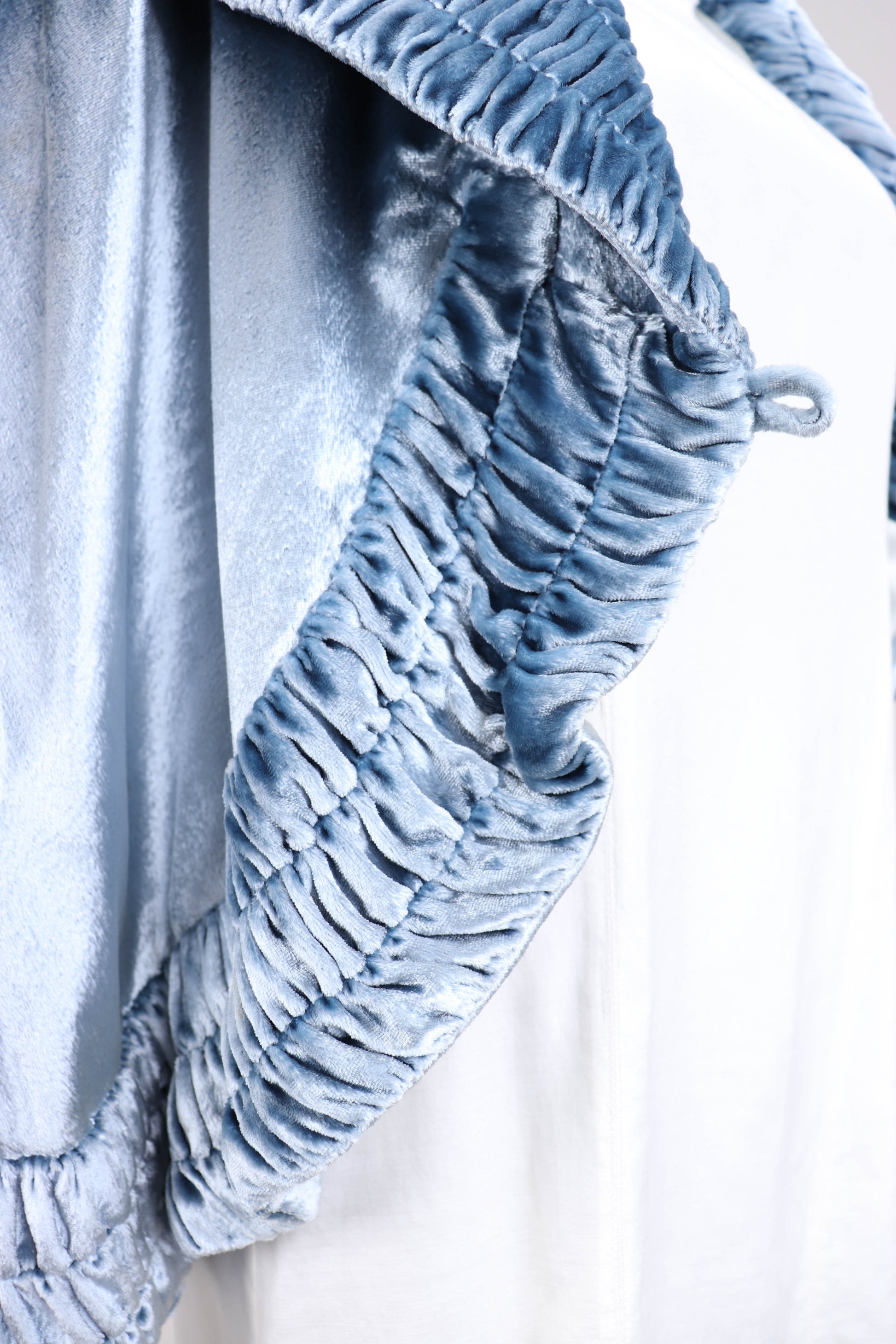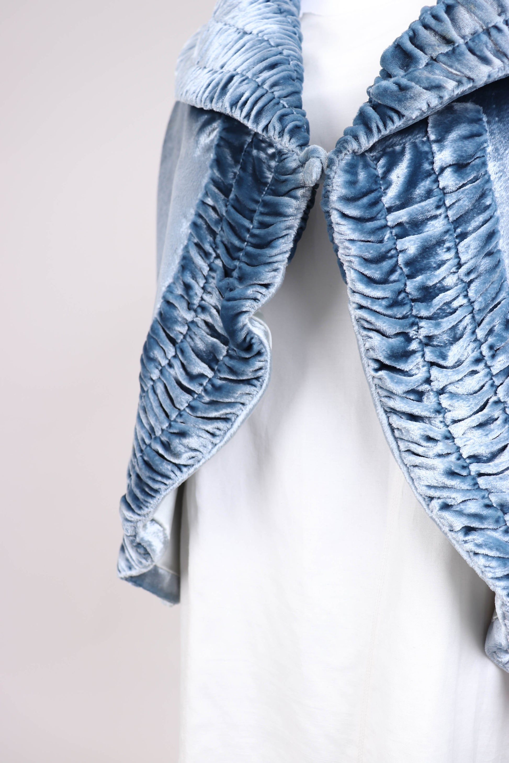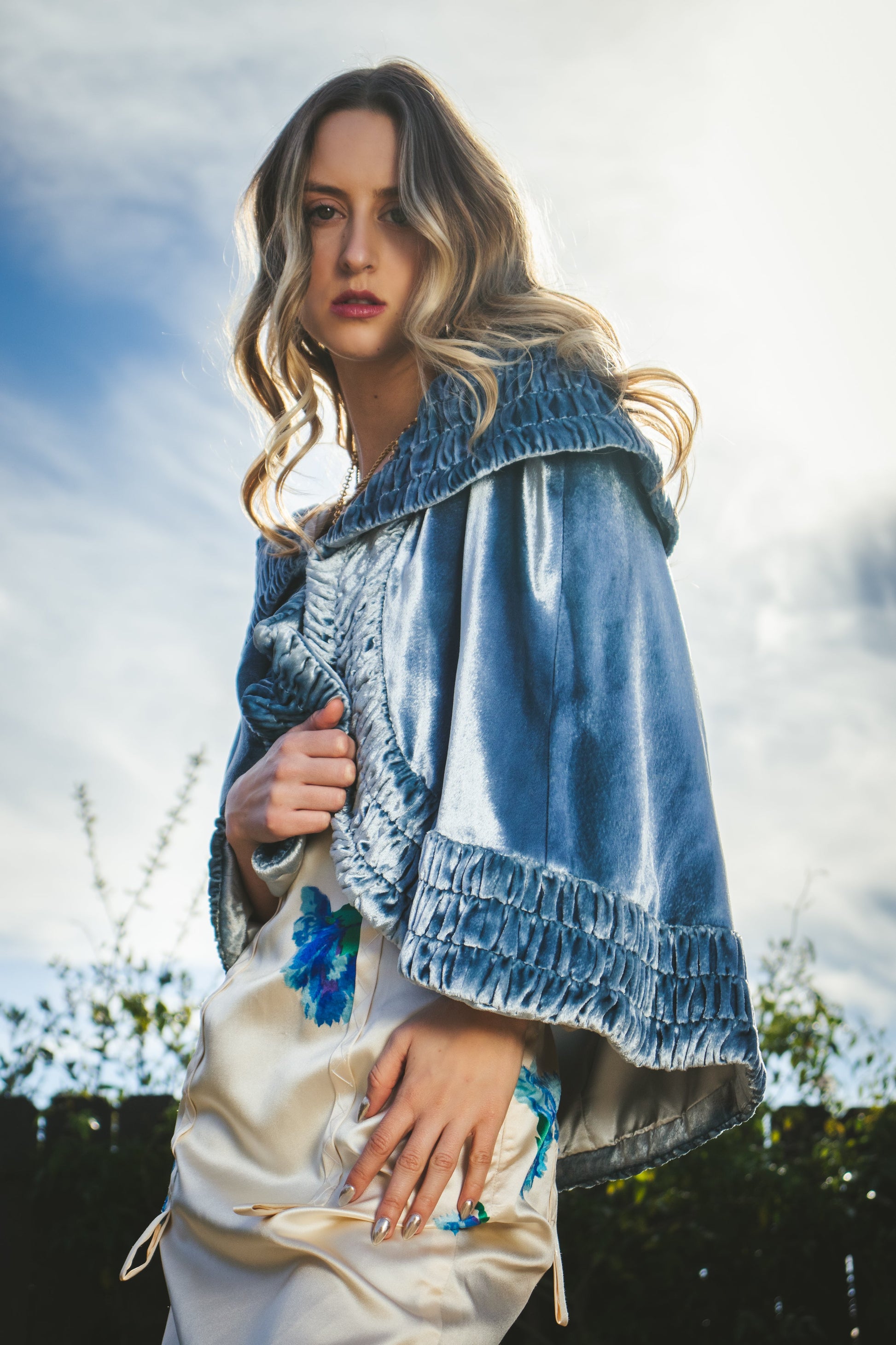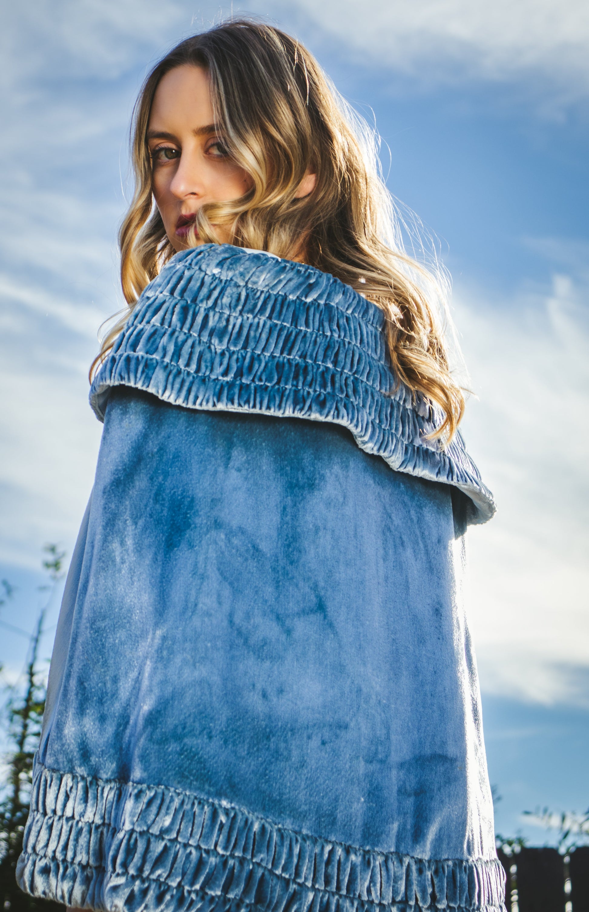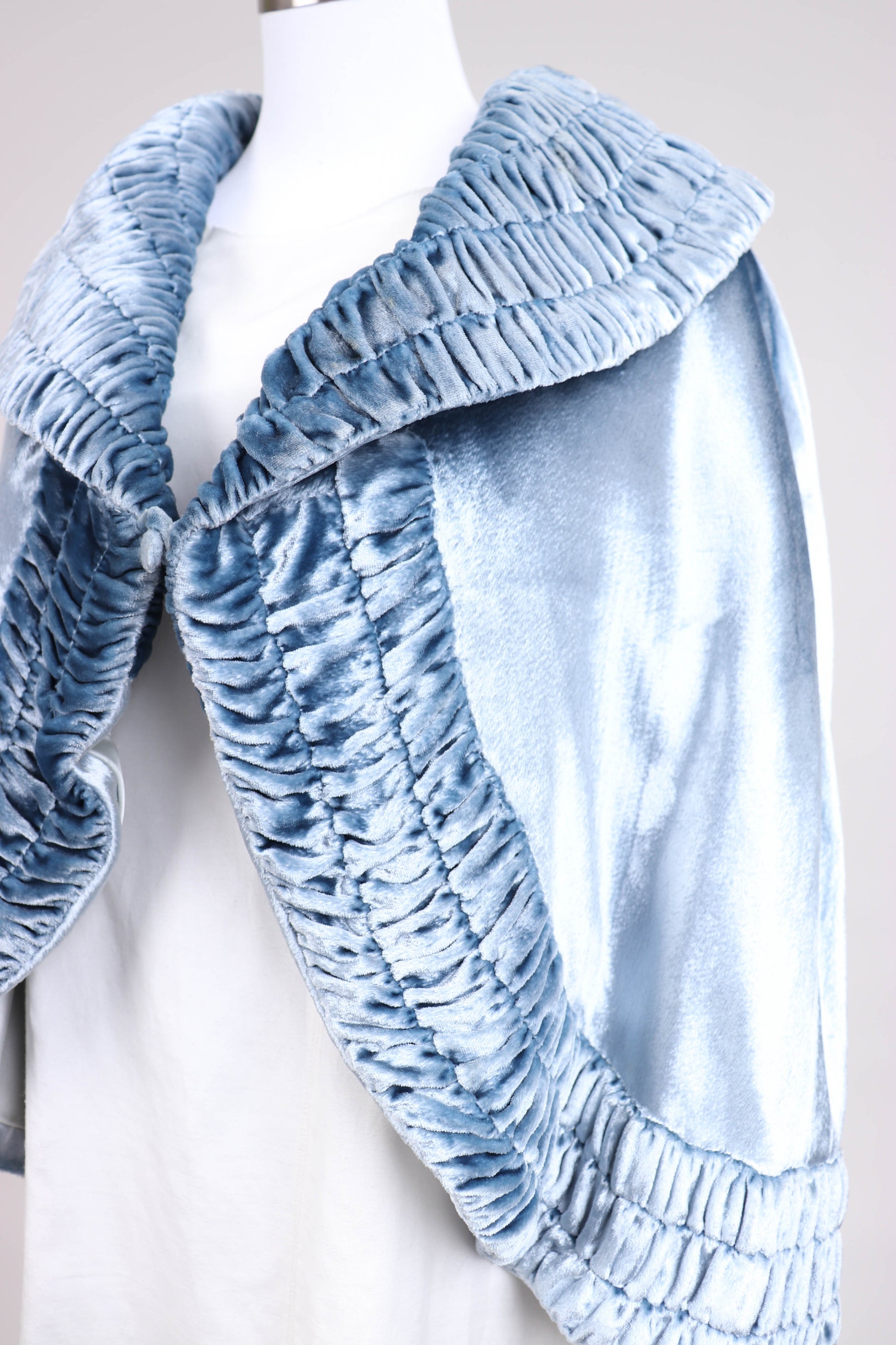 Expertly ruched velvet creates a wide, soft shawl collar and trim. Fully lined in a powder blue satin, she pairs beautifully with pastels and patterns and is iconic with black.