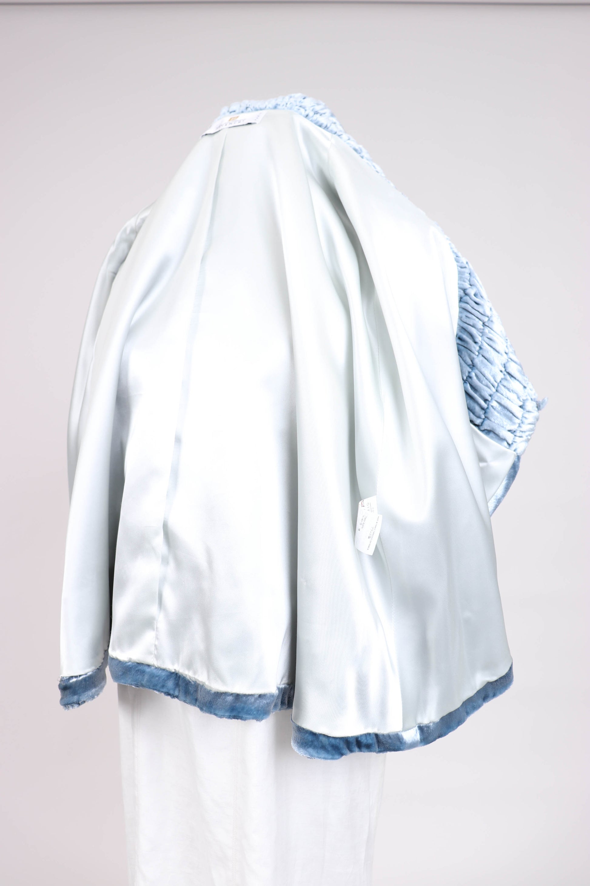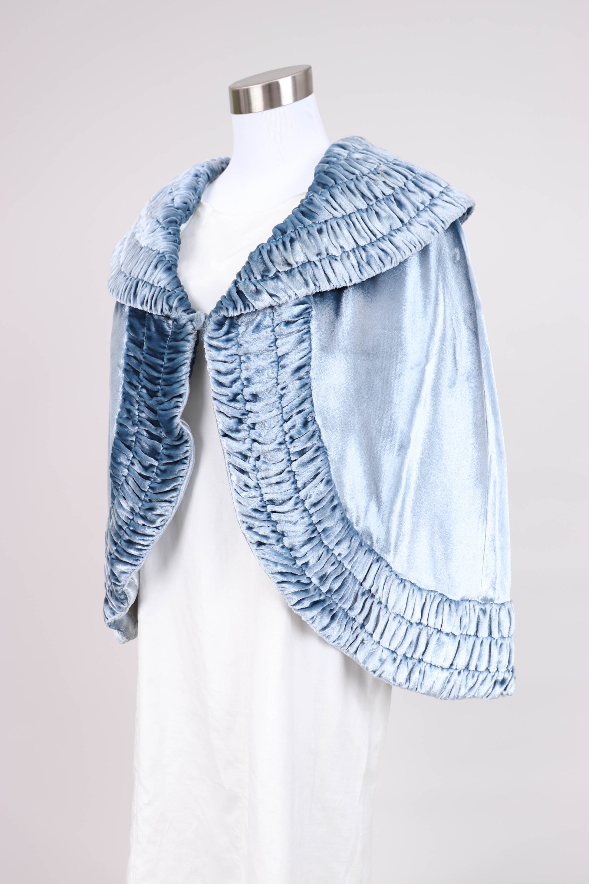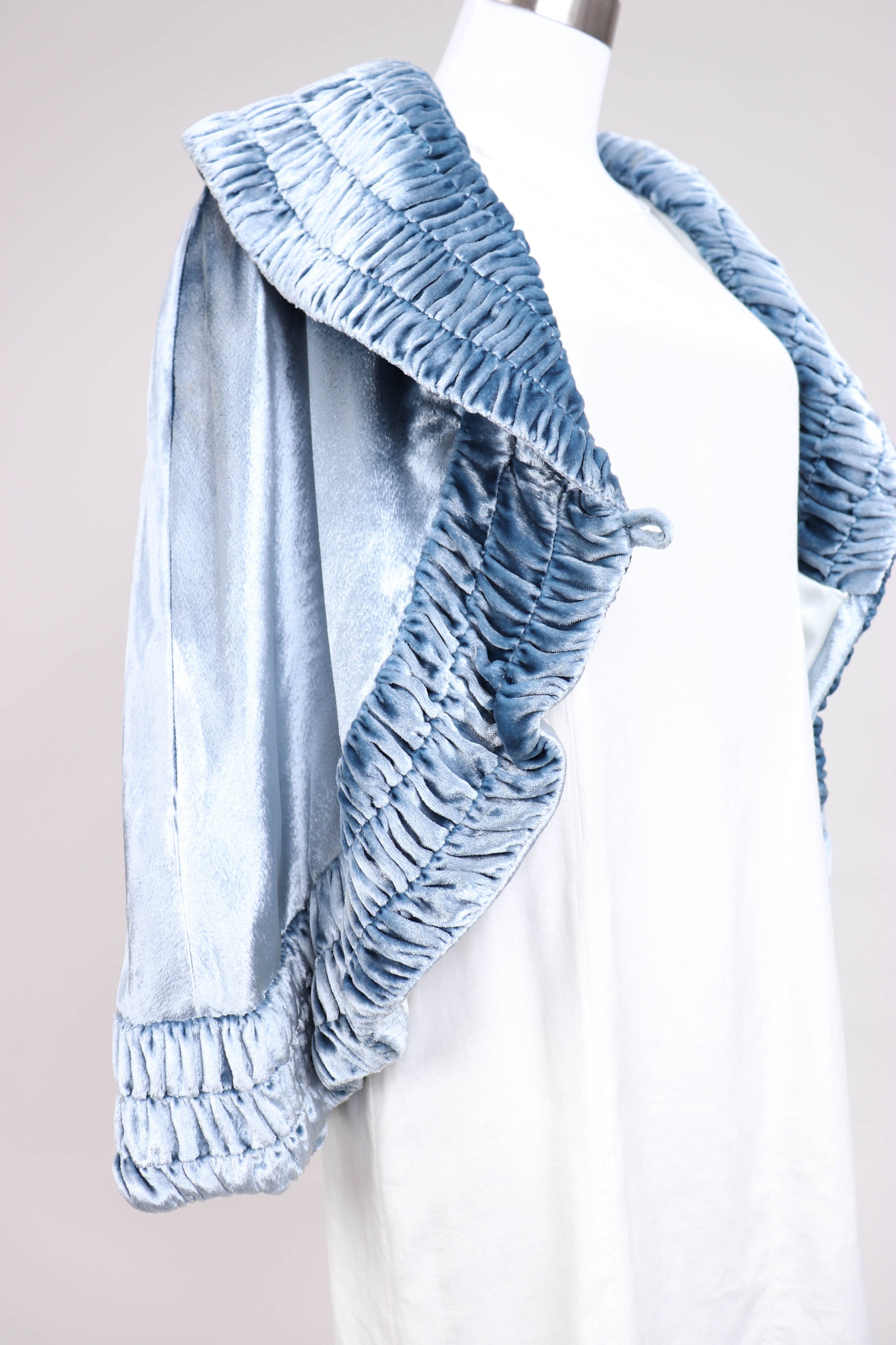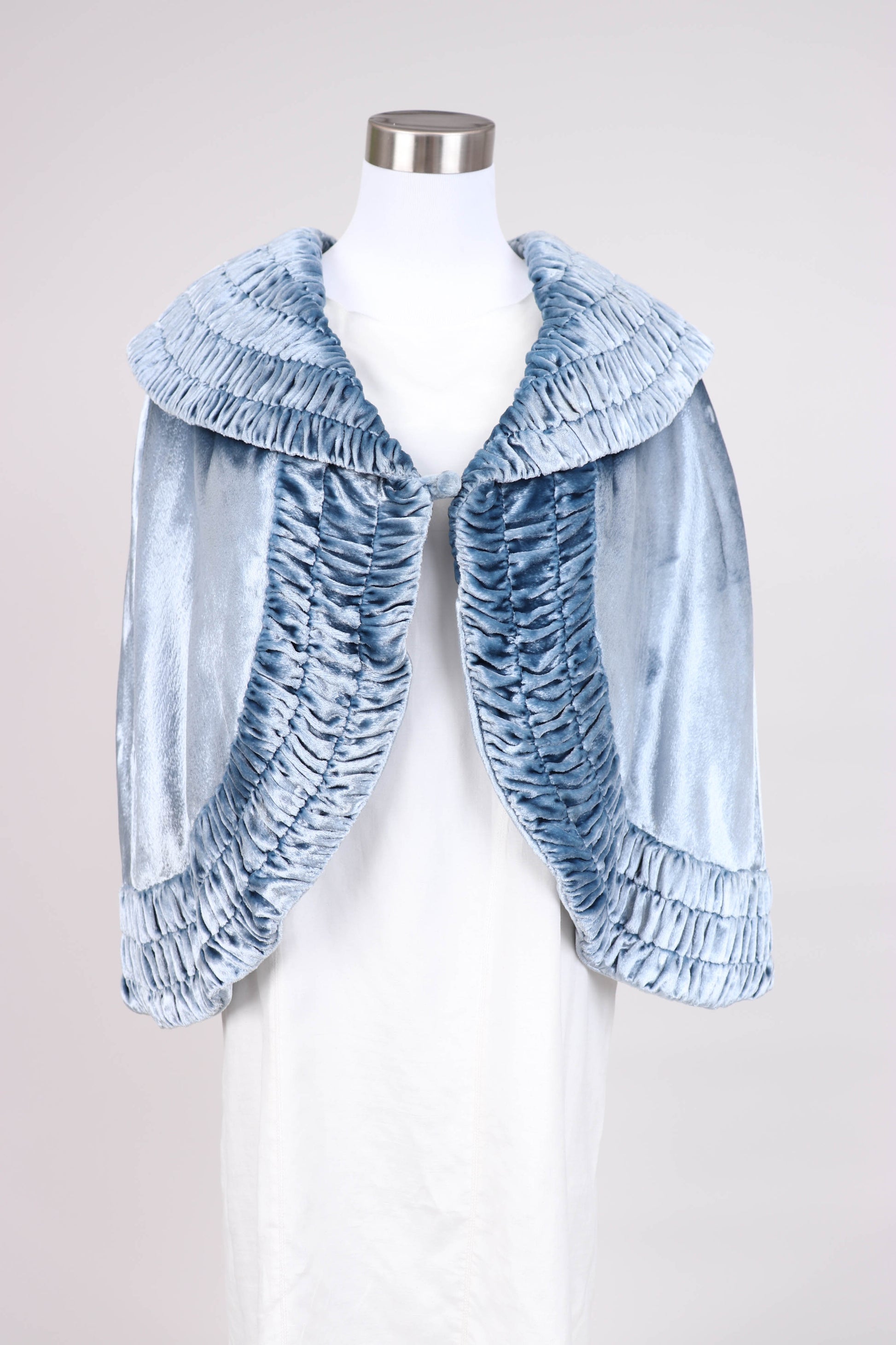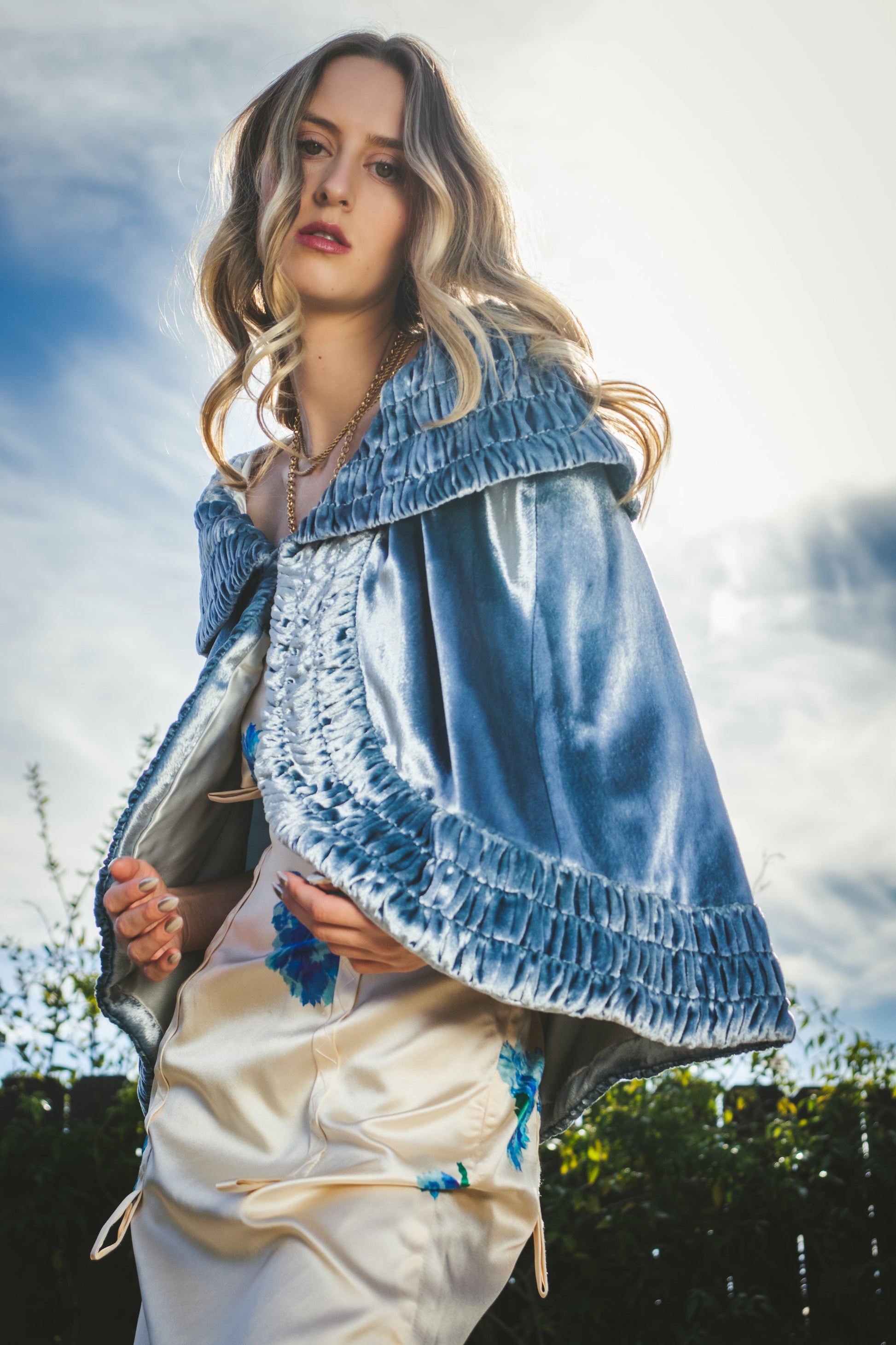 Expertly ruched velvet creates a wide, soft shawl collar and trim. Fully lined in a powder blue satin, she pairs beautifully with pastels and patterns and is iconic with black.