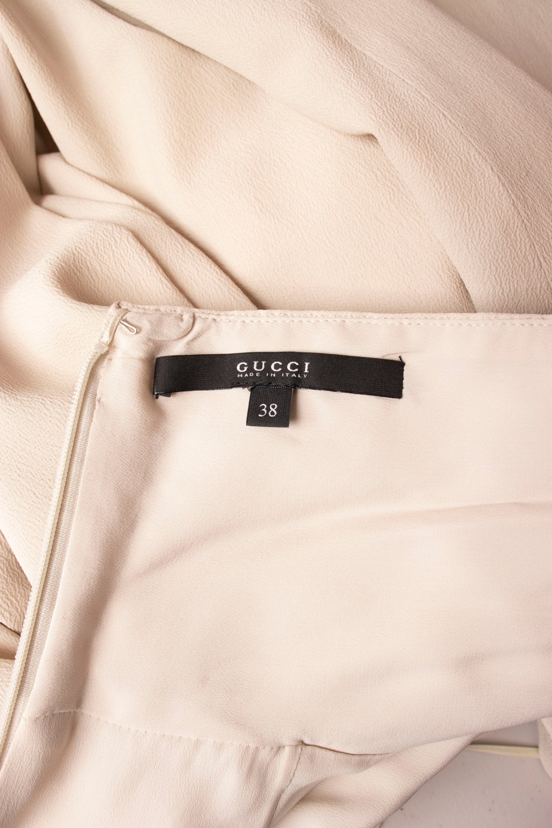 This stunning Gucci runway piece from 2007 epitomizes timeless elegance. The ecru gown features a gracefully pleated halter top and skirt, anchored by a striking sculptural black and gold patent leather belt that defines the silhouette. Crafted from luxurious acetate and silk, this unworn Italian size 38 treasure comes with original documentation and has been meticulously preserved. A true collector's piece that captures the artistry of Gucci's iconic design heritage.