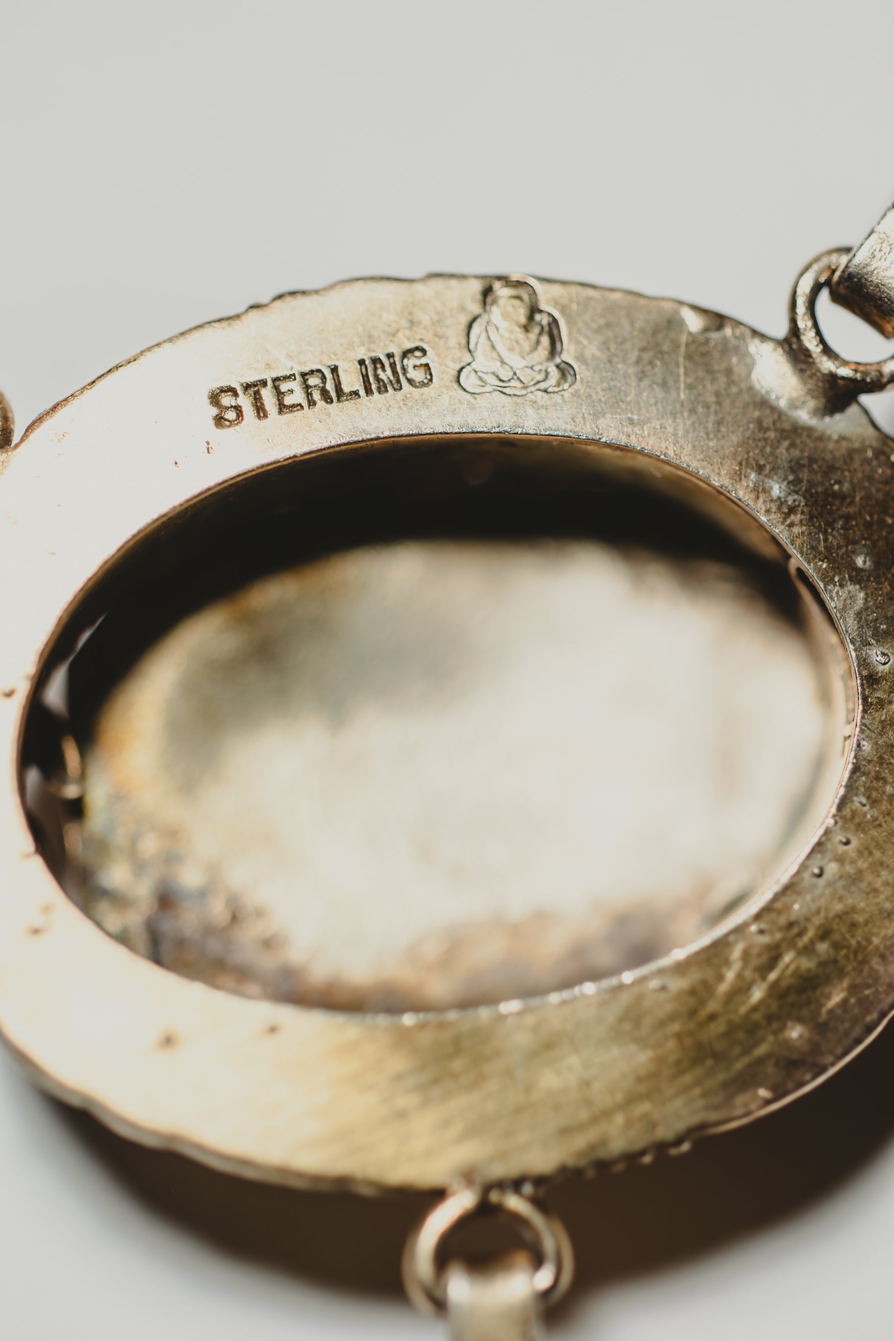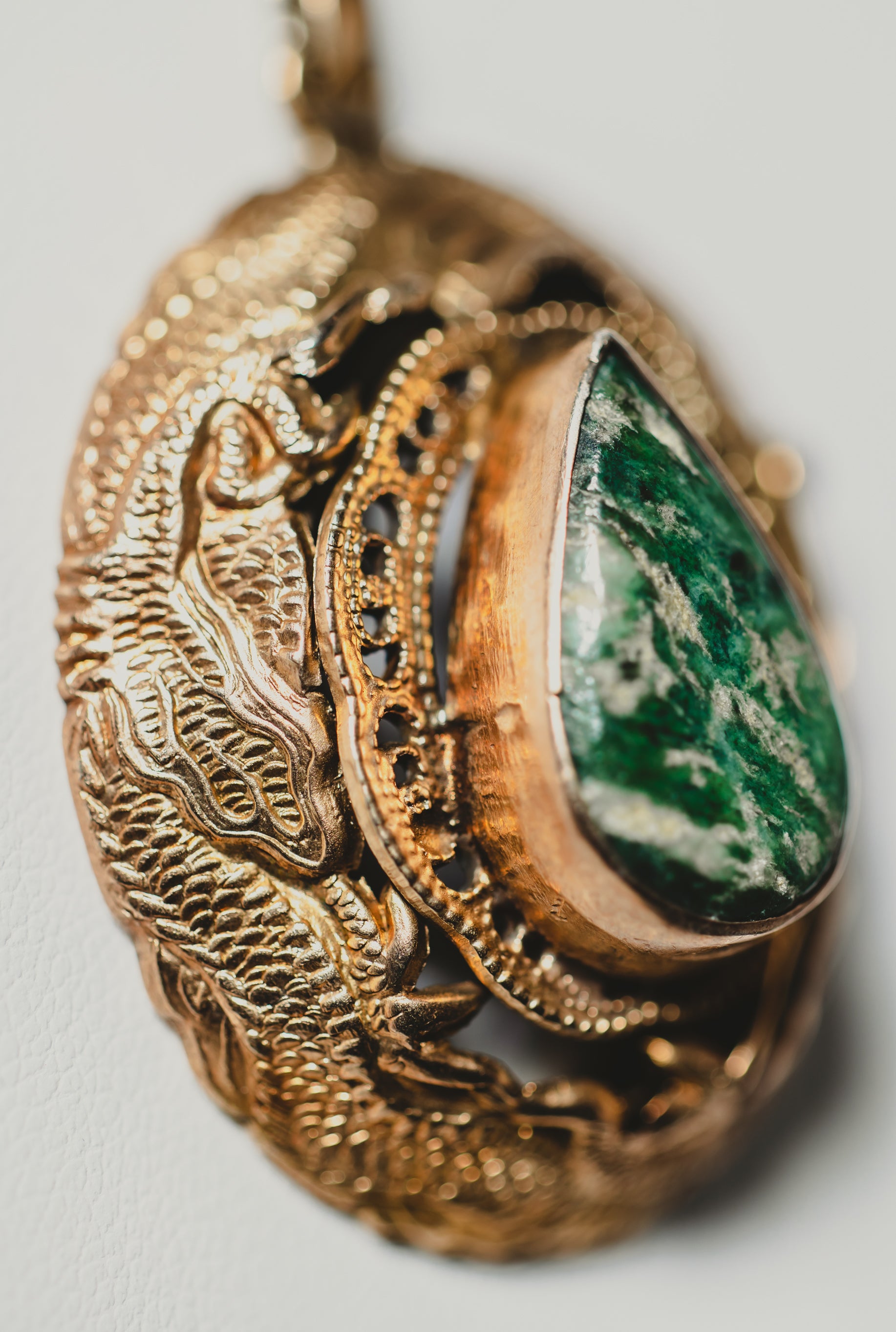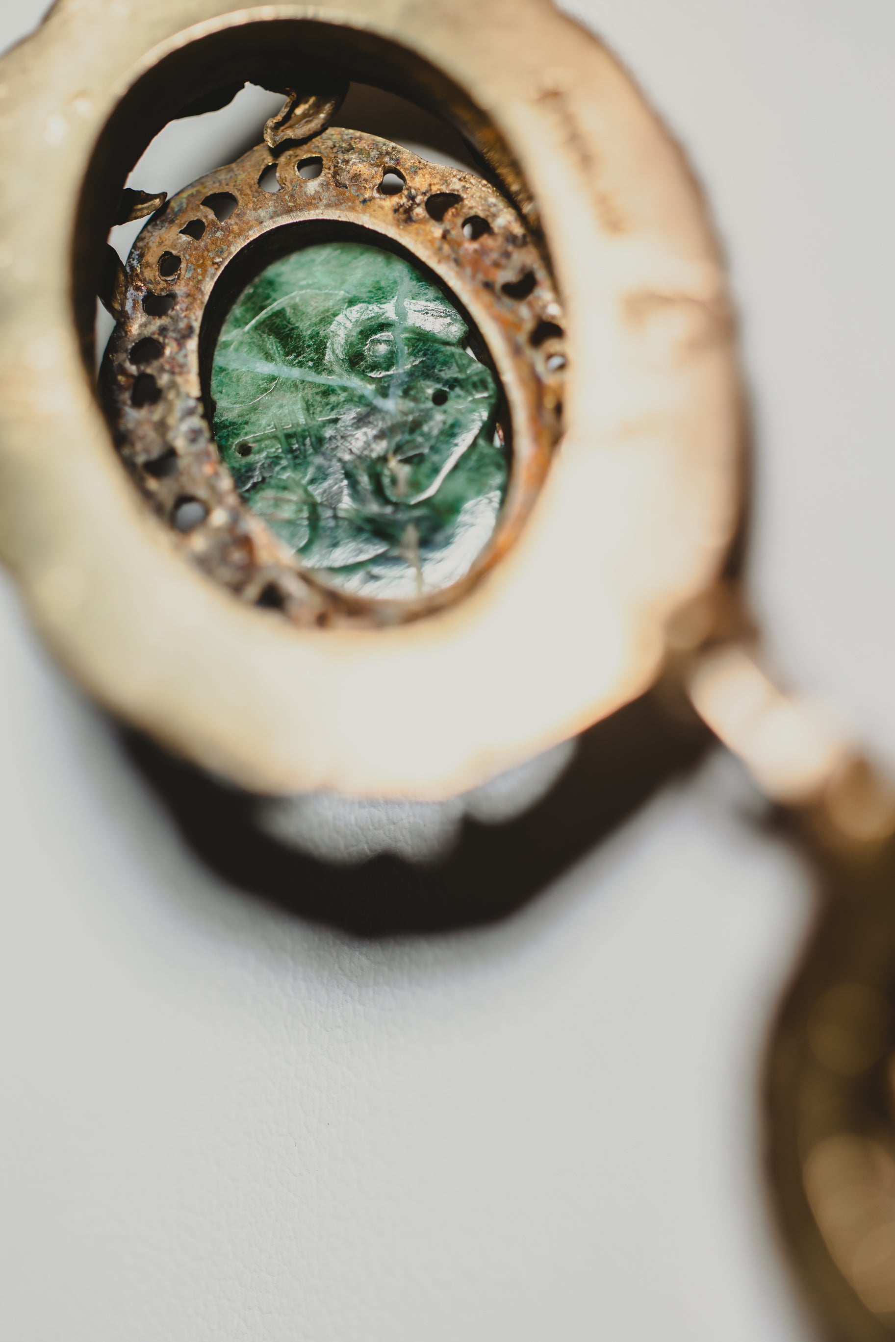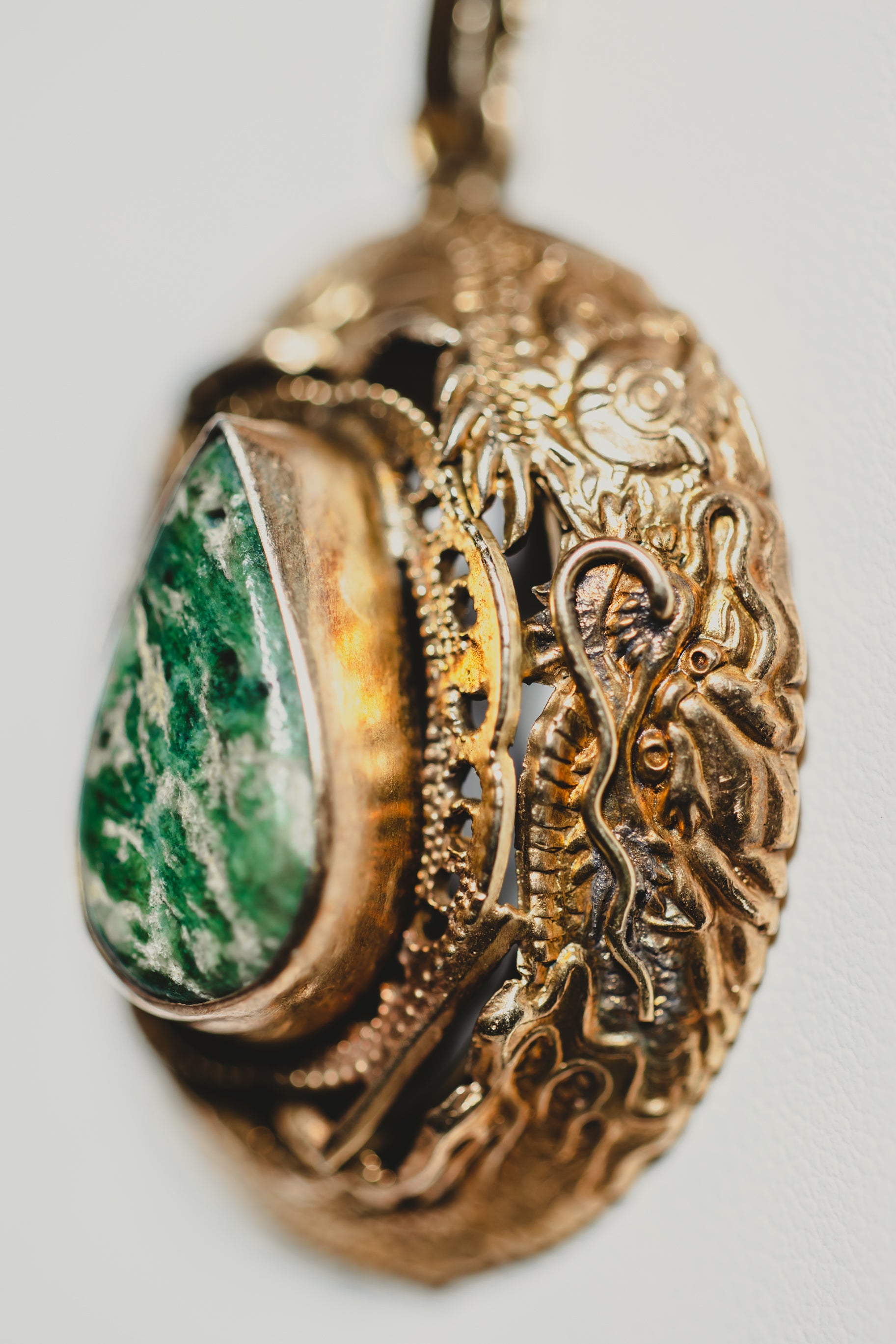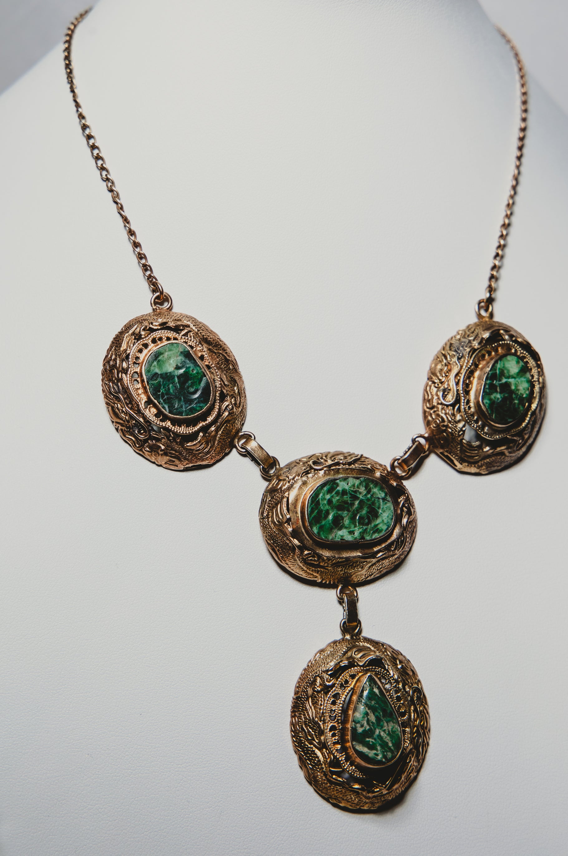 Four pieces of gorgeous, carved green jade are set in dragon bezels, beautifully crafted from sterling silver with a gold wash.