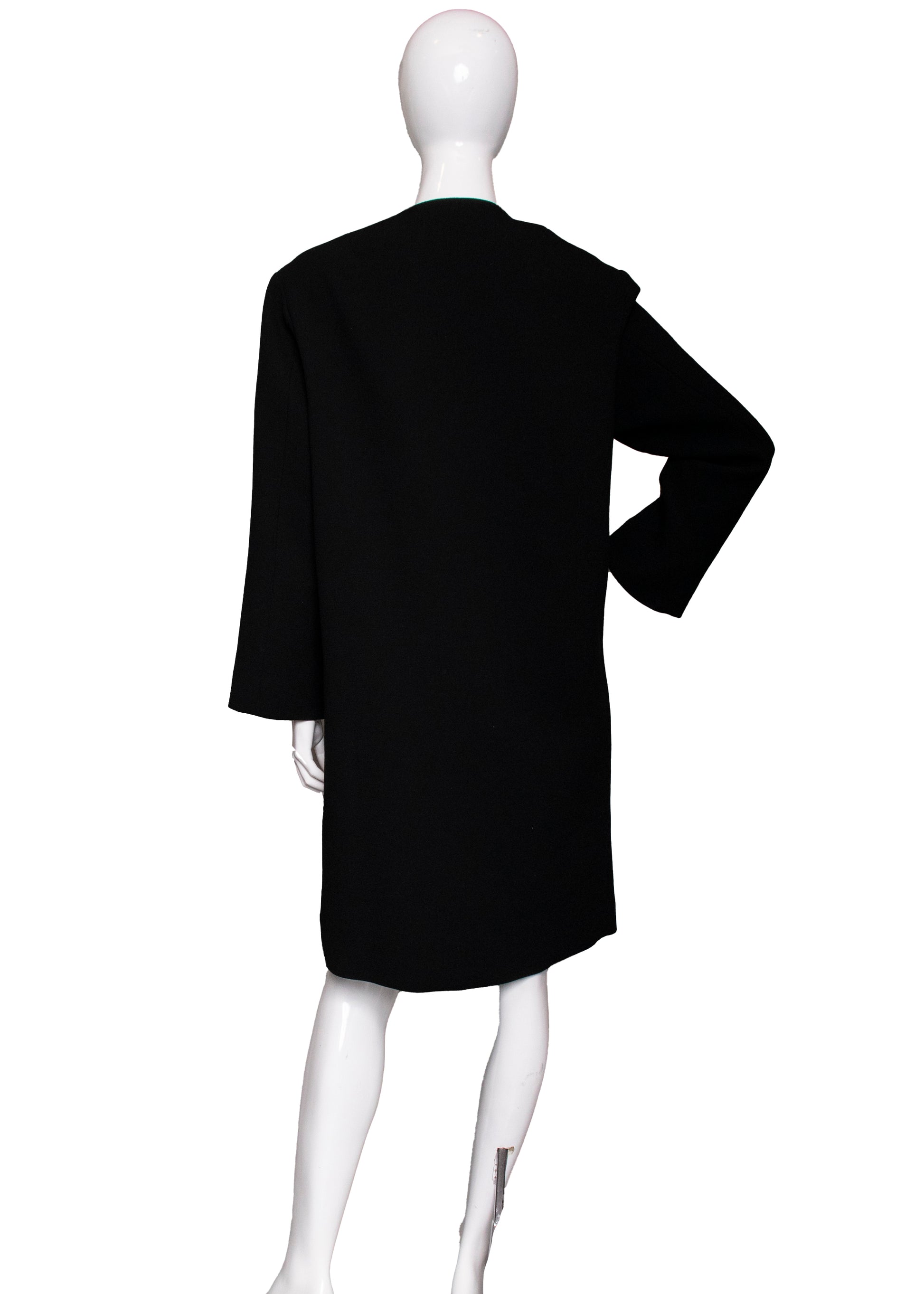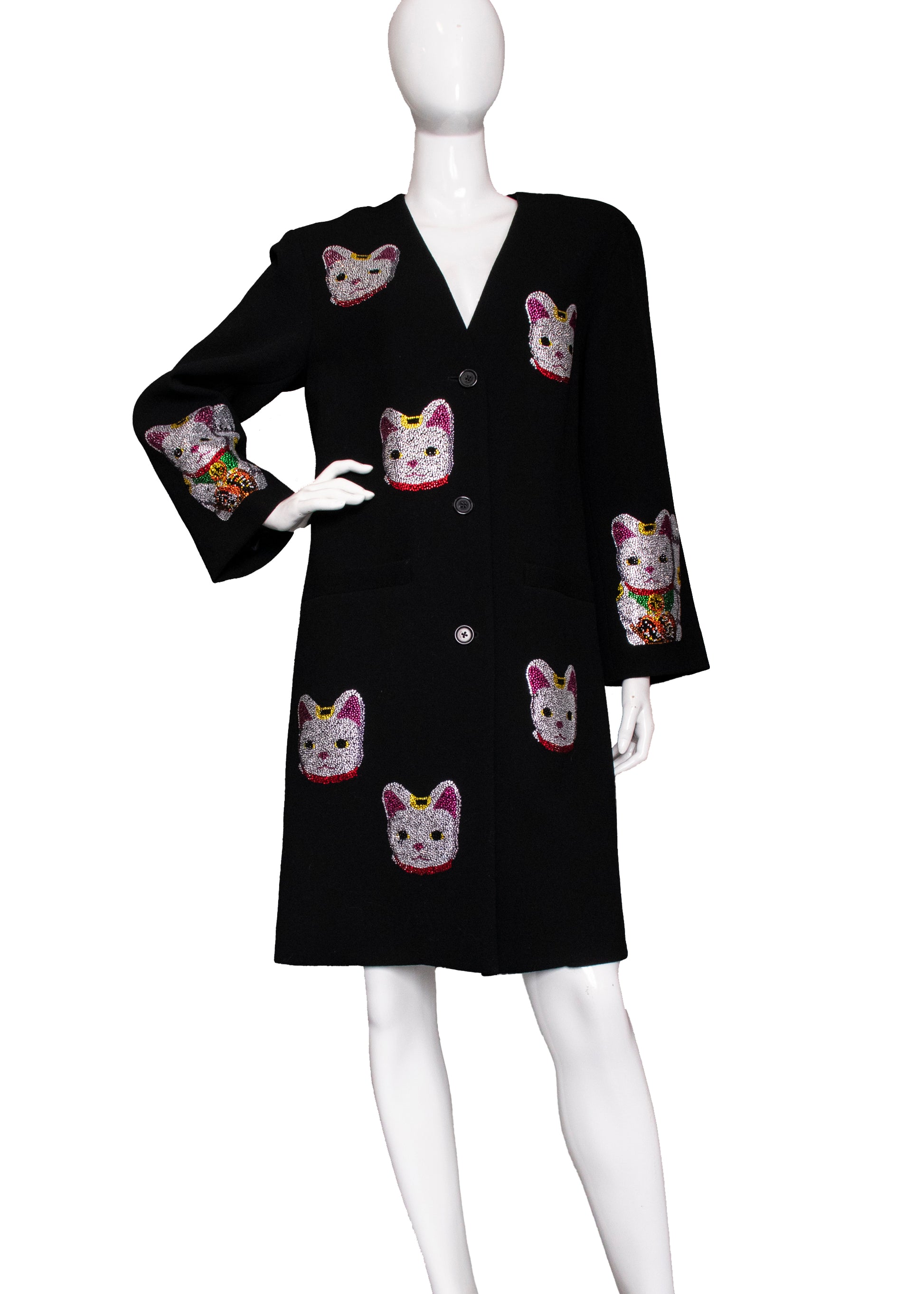 This black oversized men's style coat has been worn just once. It features a sleek, collarless design with three buttons down the front and two open pockets. Adorned with the Japanese "Maneki-neko" or "lucky cat" crafted from