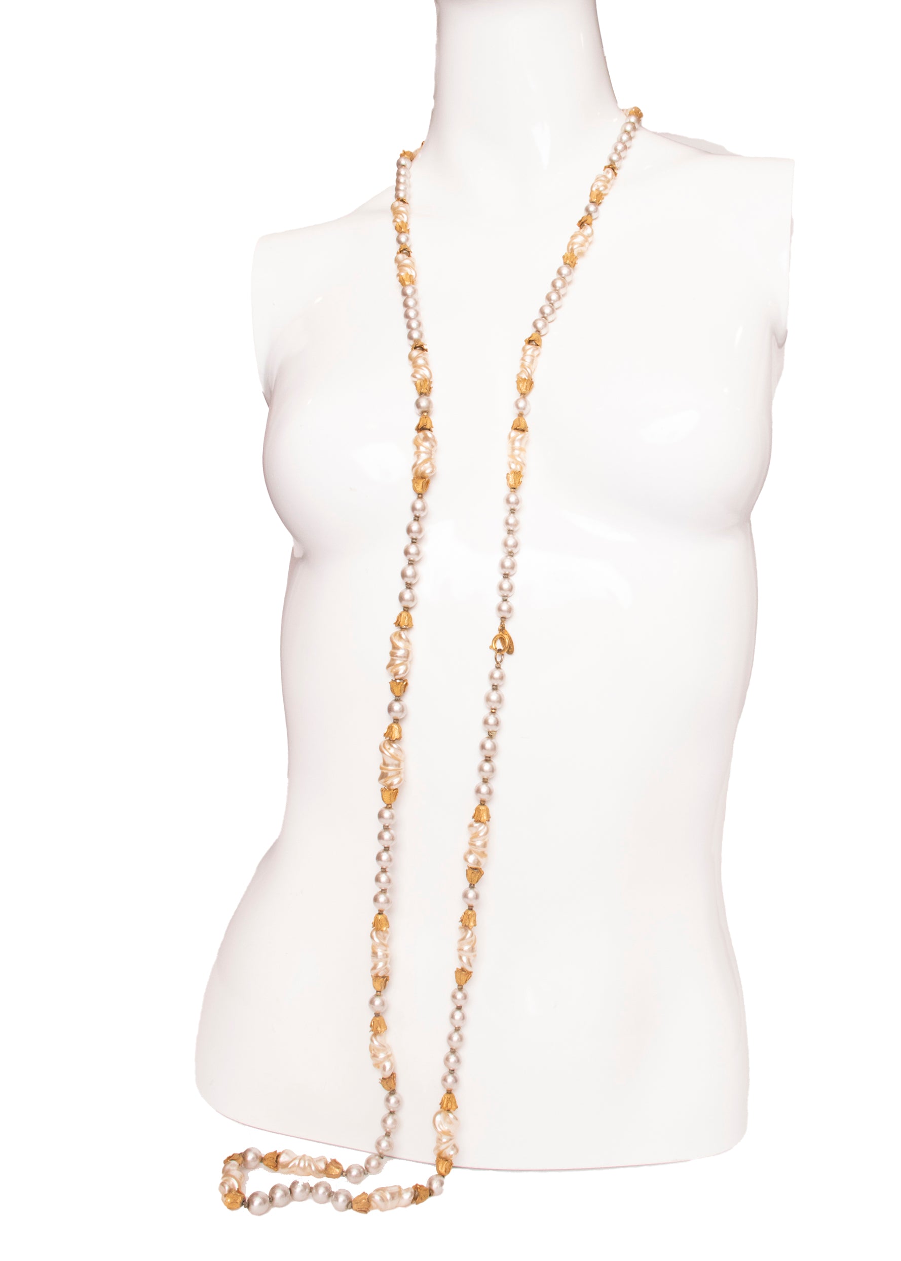 Your vintage jewelry collection deserves this stunning Miriam Haskell creation. Luxurious faux golden baroque pearls blend beautifully with delicate faux silver freshwater pearls, accented by charming gold-tone bell beads and shimmering faceted silver details. Each piece is meticulously hand-knotted to ensure lasting quality and elegance. The generous length allows you to style it three different ways—wear it long, wrap it twice for a layered look, or triple-wrap for a bold statement.