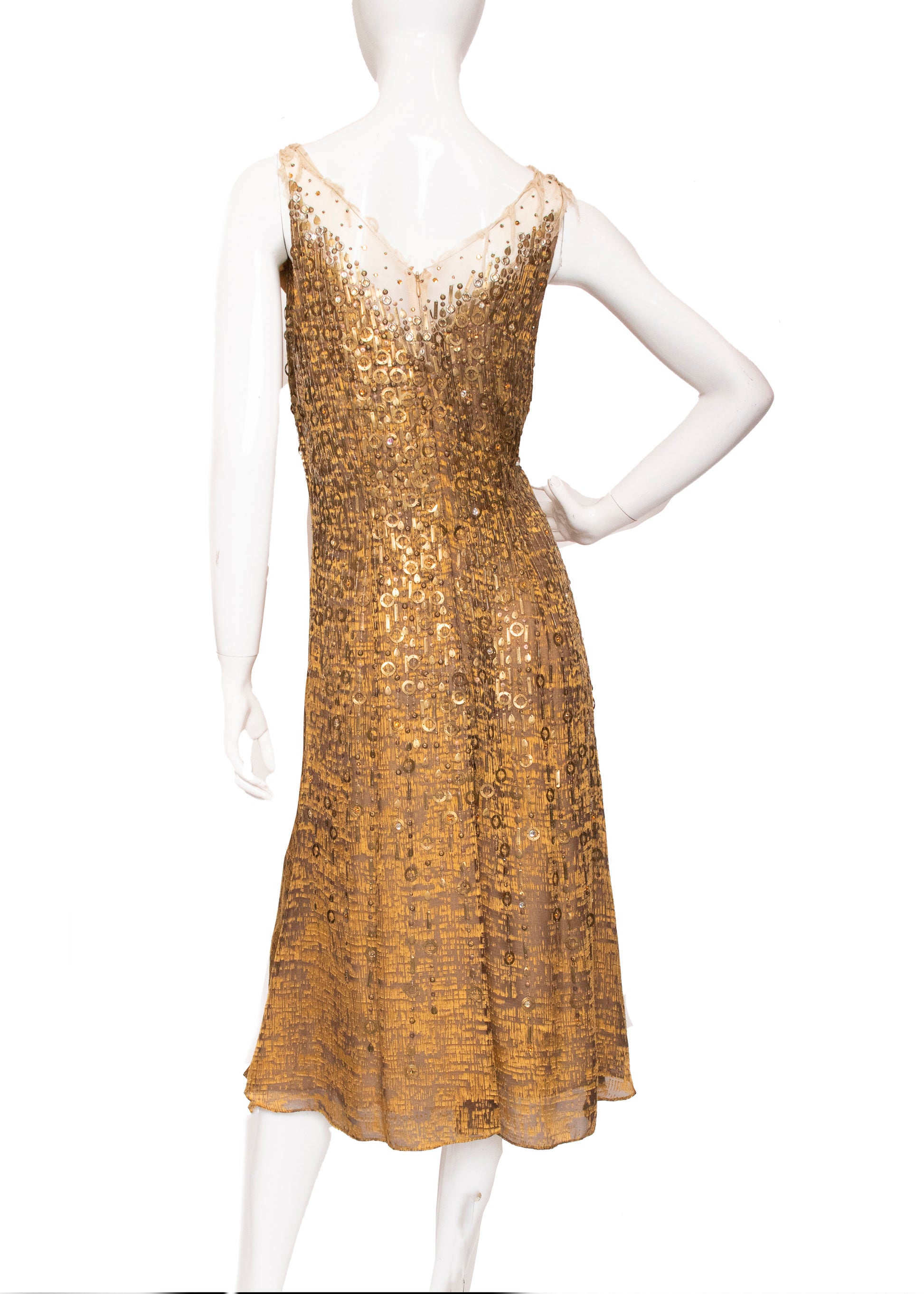From the 2005 Fall Runway, this Carolina Herrera gold dress is a true standout and a favorite in our shop. It showcases a delicate mesh front and shoulder straps, with a gathered silk V-neck adorned with an array of natural stones. The dress is richly decorated with hand-sewn gold metal pieces—both round and rectangular—set against a Klimt-inspired patterned silk fabric. Fully lined for comfort, this dress is absolutely breathtaking and crafted with exceptional attention to detail.