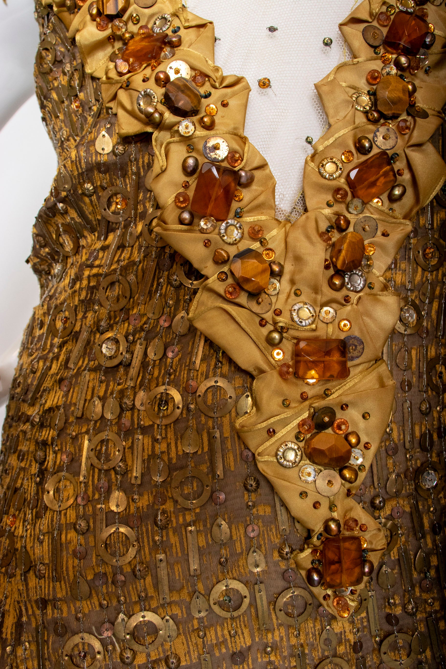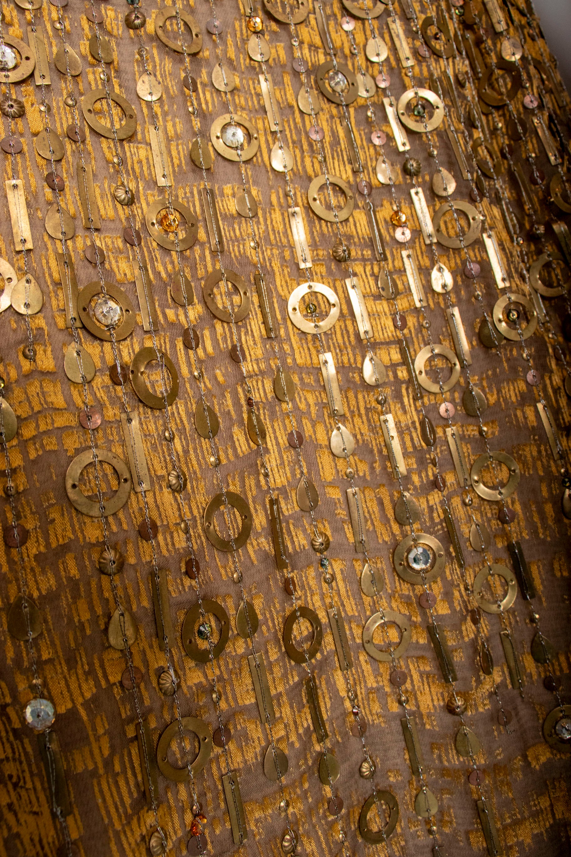 - Fabric: no content or designer tag, perhaps silk, metal and natural stone embellishments