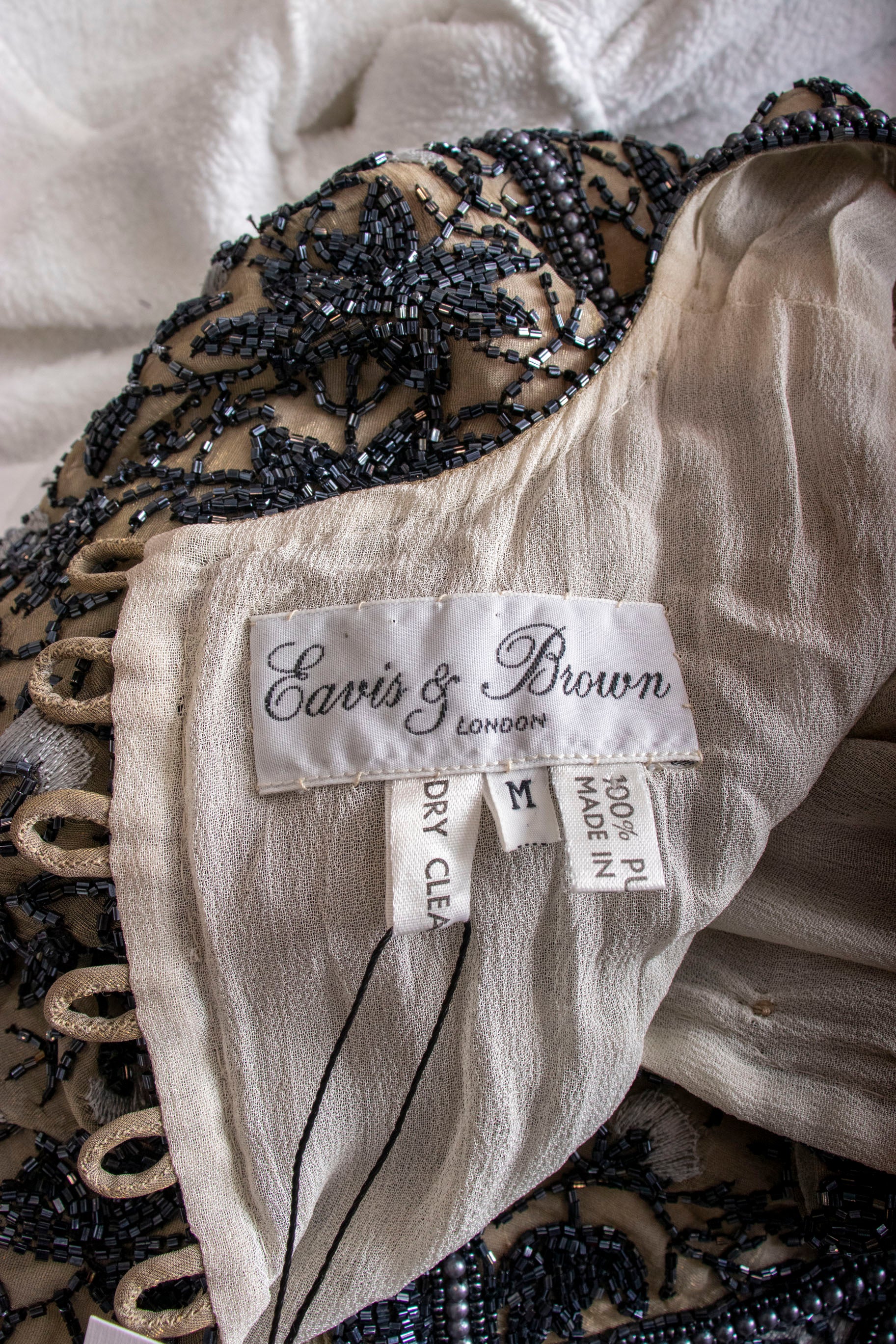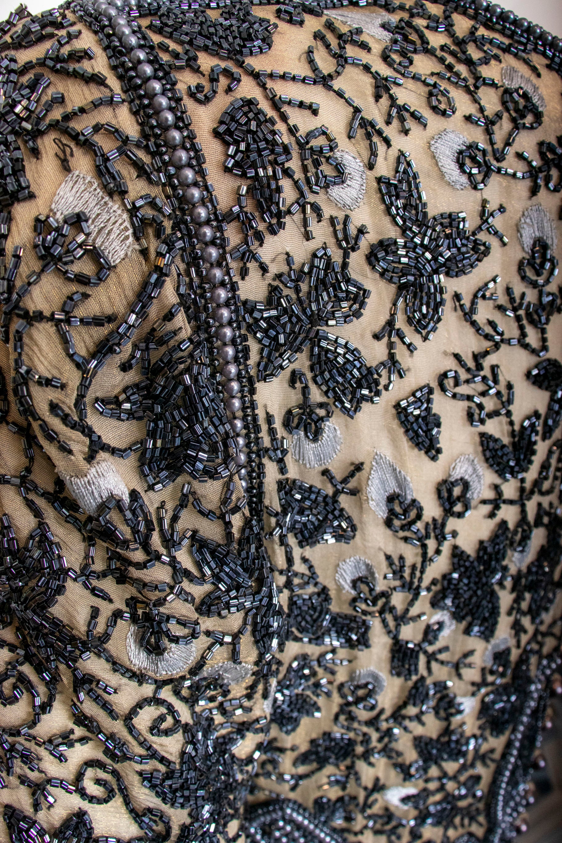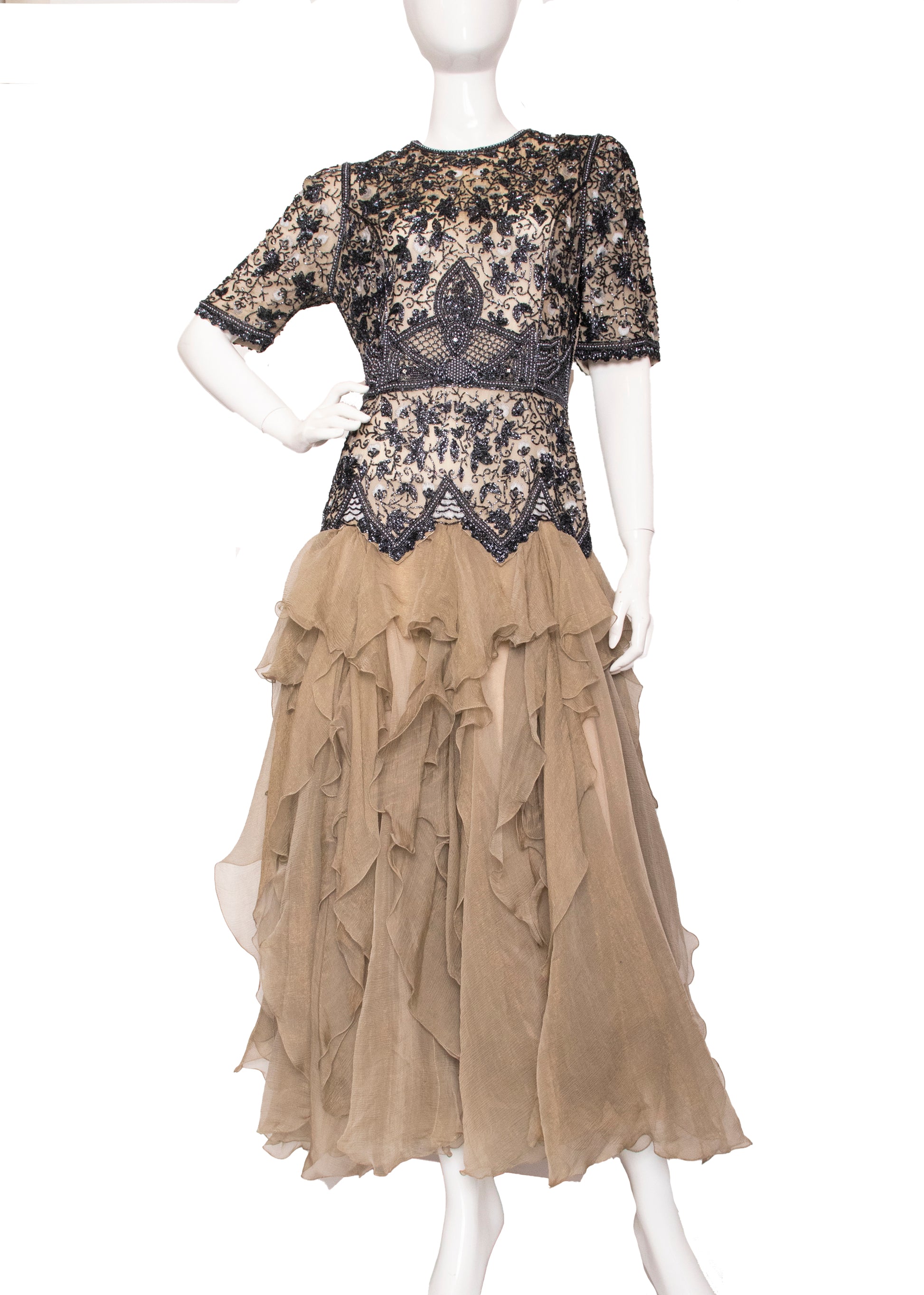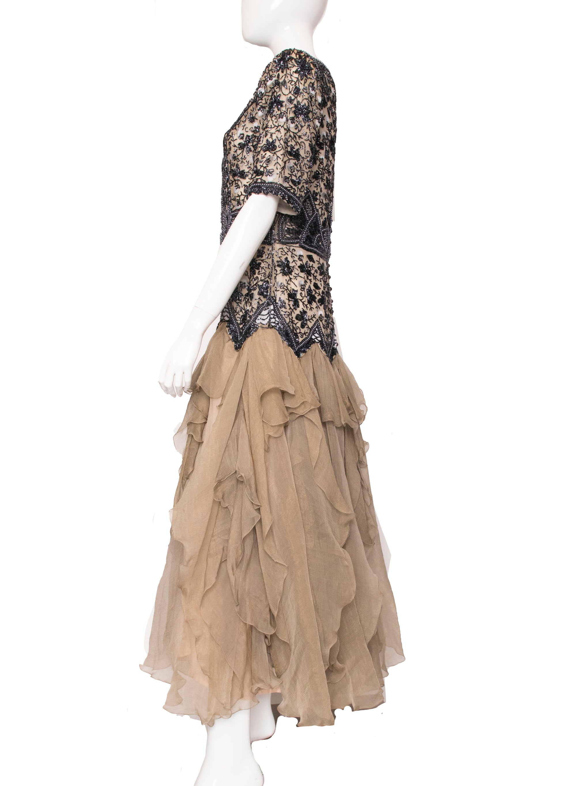 This 1980s gown from Saks Fifth Avenue in Beverly Hills showcases a beautiful black hand-beaded bodice, complemented by flowing layers of tan silk chiffon that form a lively skirt. Fully lined for comfort, it fastens with a row of buttons down the back. Designed with proportions ideal for a taller figure.