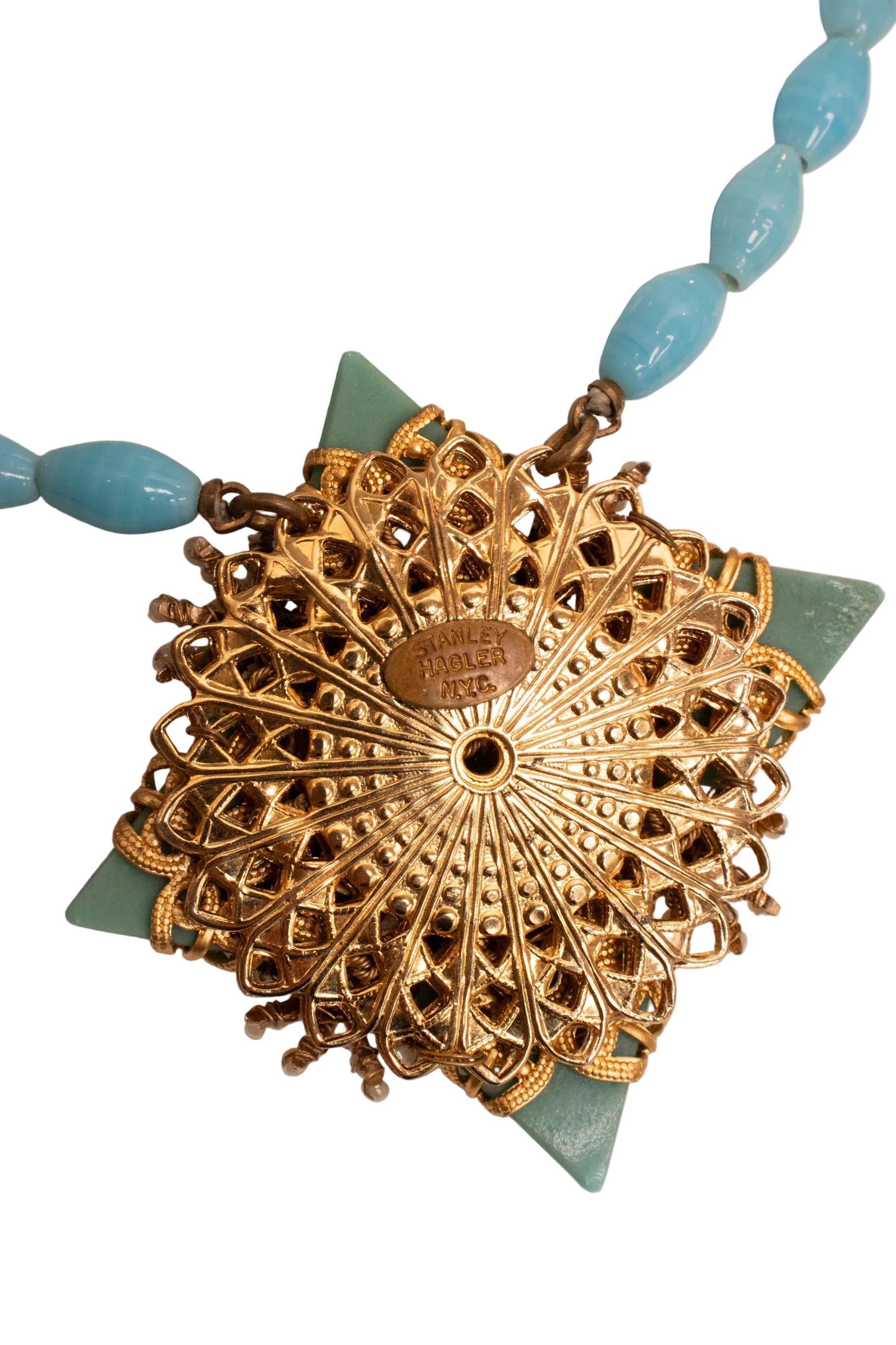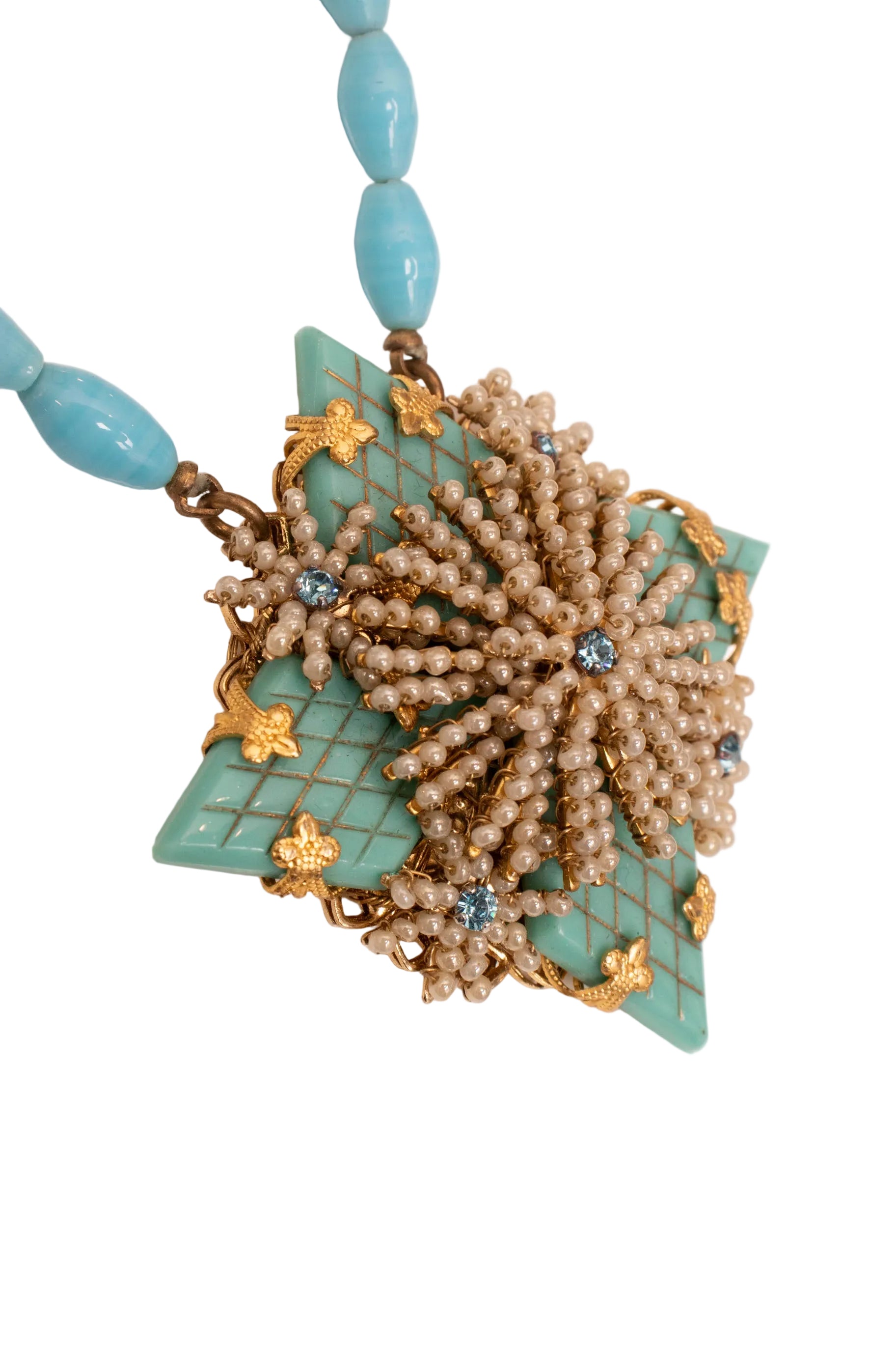 Celebrity Owned Stanley Hagler Blue Necklace with gold tone, faux pearl and blue rhinestone accents on blue bead chain.