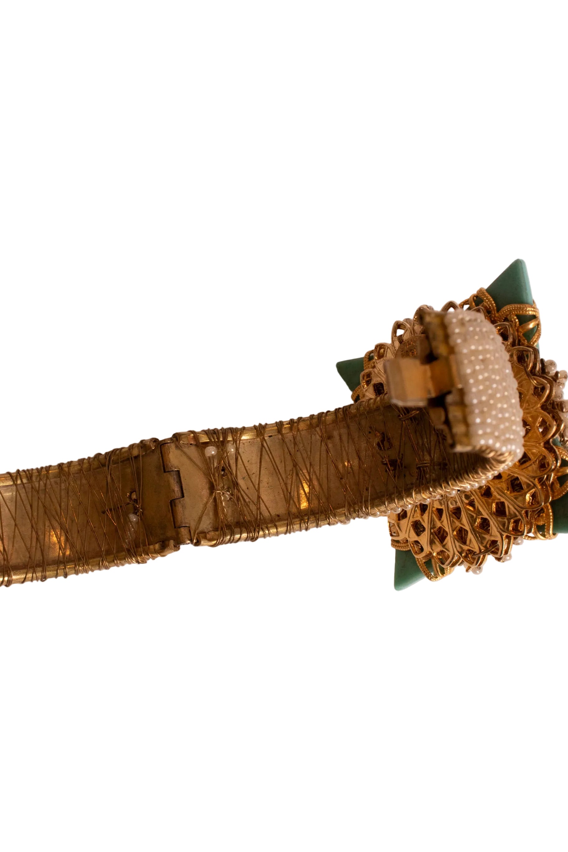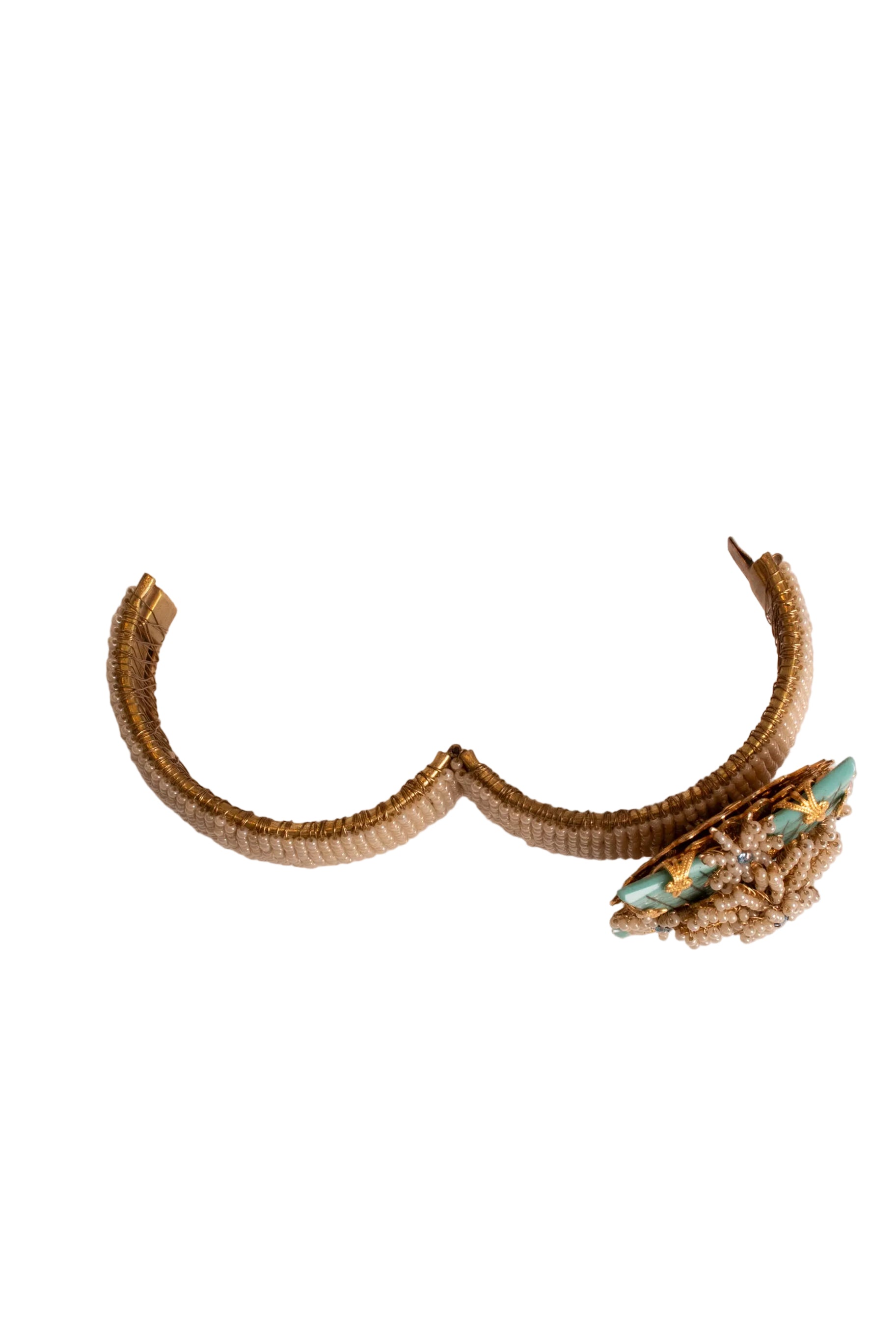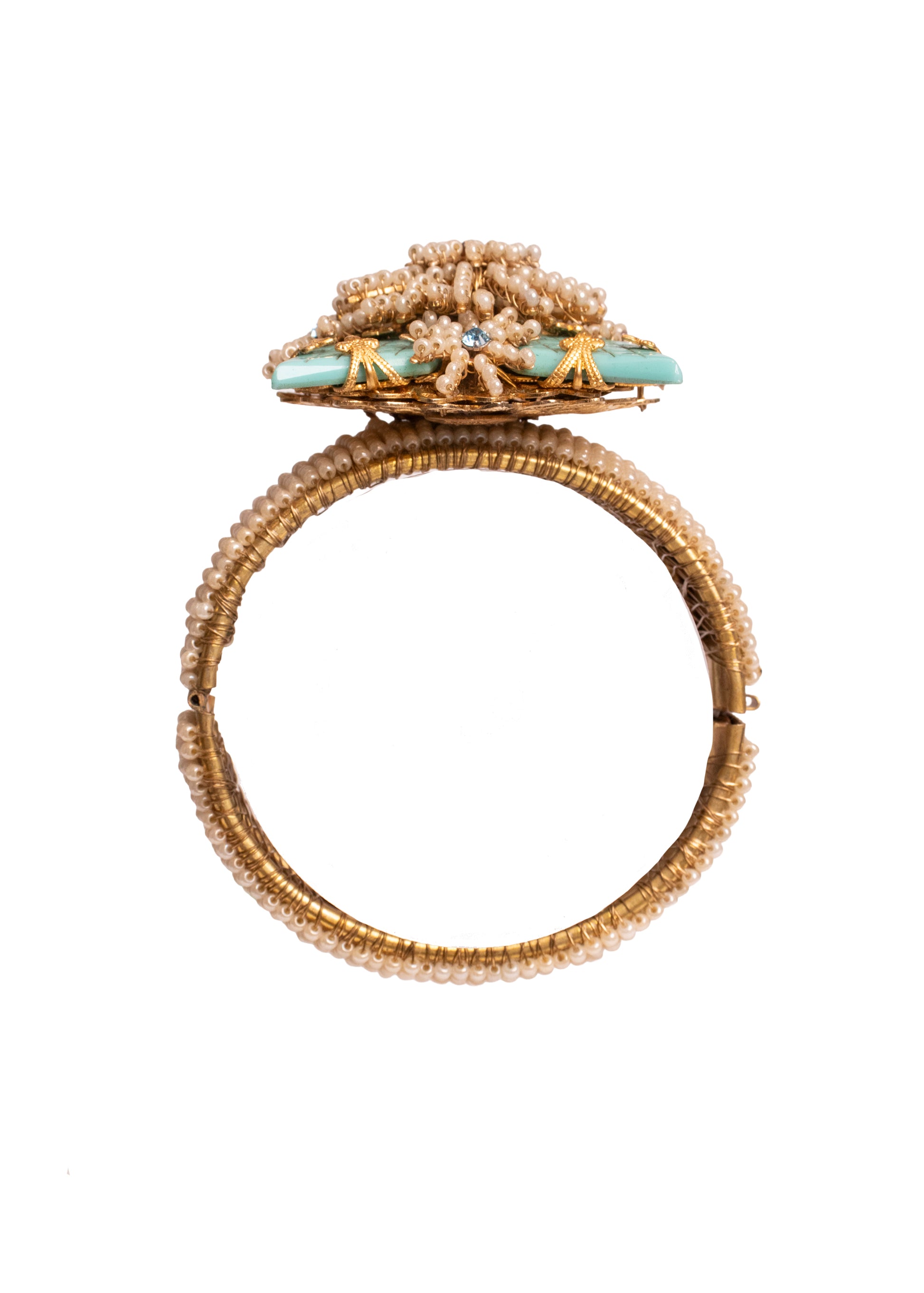 Experience the legacy of Stanley Hagler, a master craftsman whose innovative designs revolutionized costume jewelry. After studying under the renowned Miriam Haskell in the late 1940s, Hagler established his brand in 1953, crafting exceptional pieces through 1983. This striking blue cuff showcases his signature artistry with delicate faux pearls, shimmering blue rhinestones, and gold-tone details arranged on a rich blue base. Each piece reflects Hagler's unwavering commitment to quality—hand-wired stones, Swarovski crystals, handmade glass beads, and gold-plated metal filigree combine to create jewelry of remarkable depth and character. Versatile and timeless, this cuff celebrates the visionary work of a designer whose influence continues to inspire.