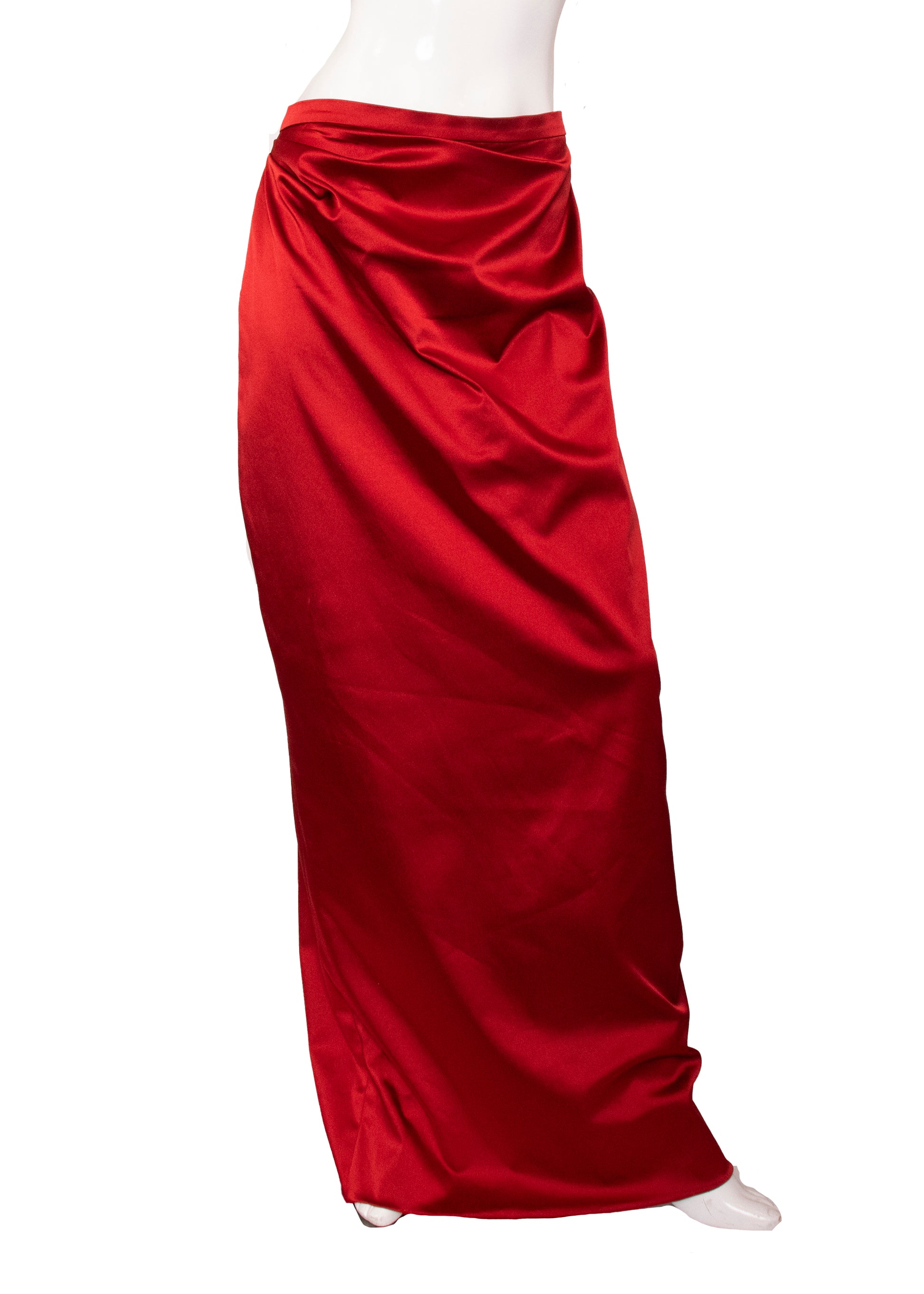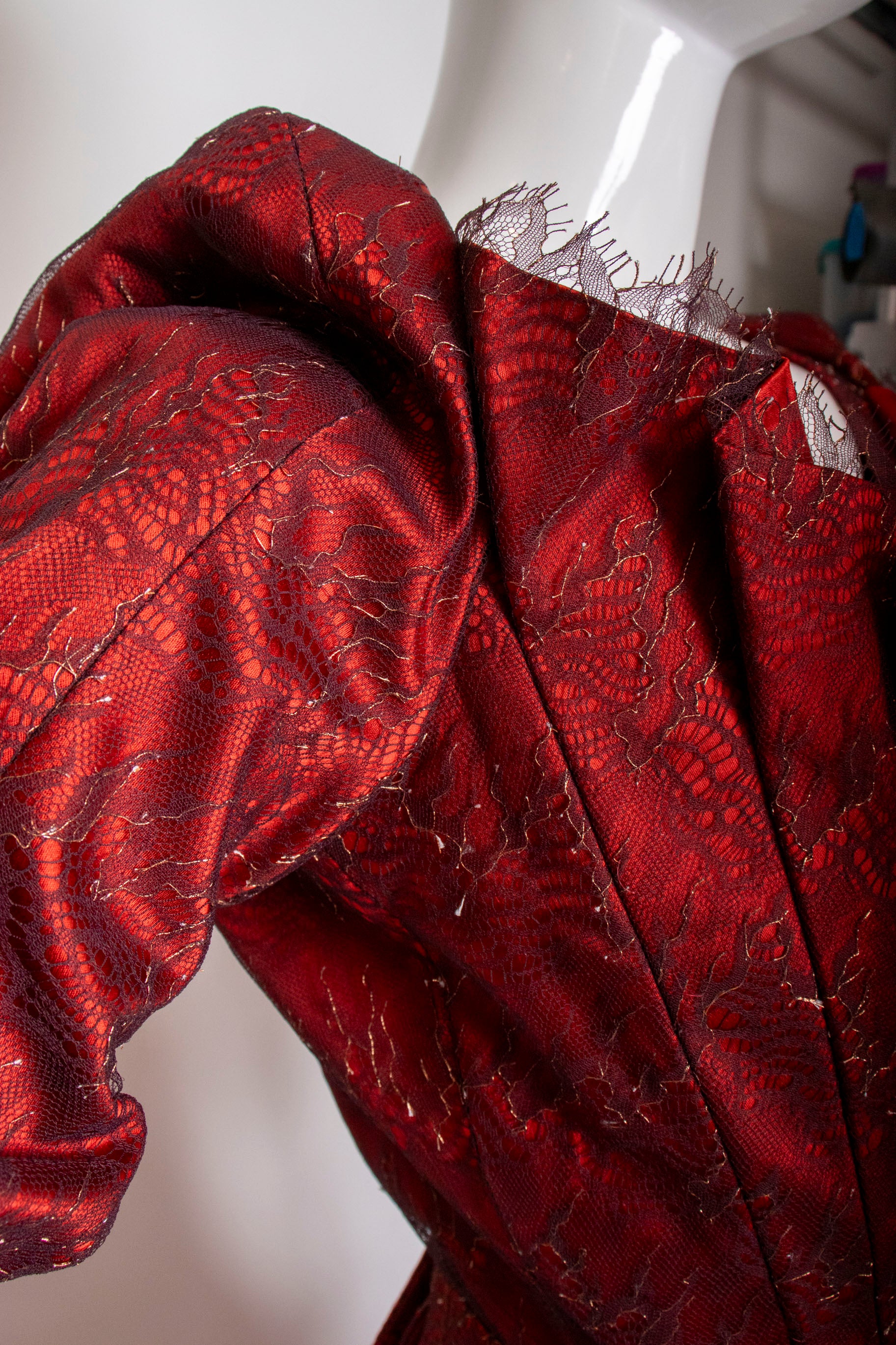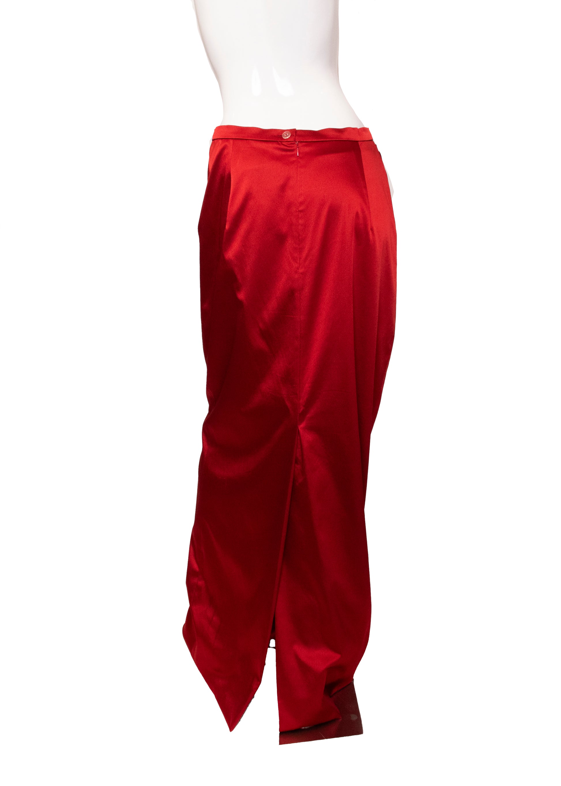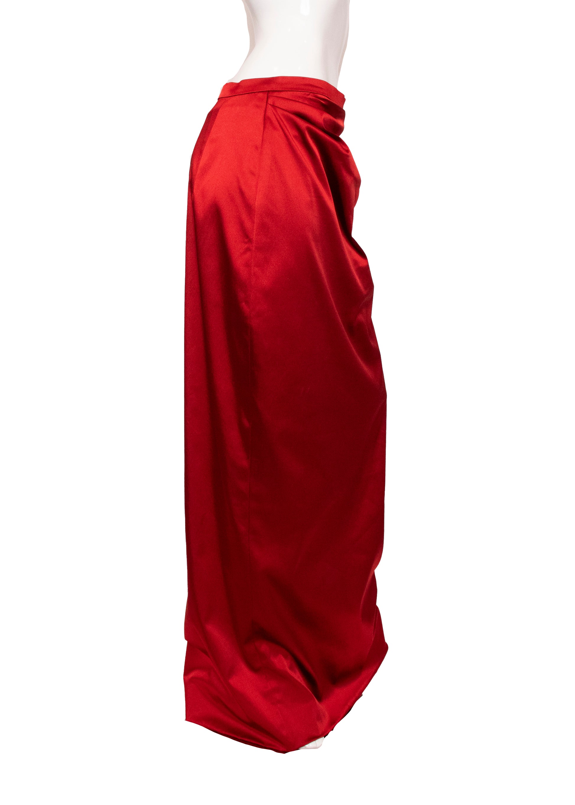 This exclusive silk satin and lace corset with a gathered skirt was custom-designed for a client before Ms. Westwood’s passing. Worn only once and kept in flawless condition, it's tailored for a fuller bust. The corset showcases a boned zip-up front with pleated detailing, a bowed and gathered back, and lace overlay on vibrant scarlet silk satin. The skirt is secured with buttons and a zipper, making this set a stunning and rare find.