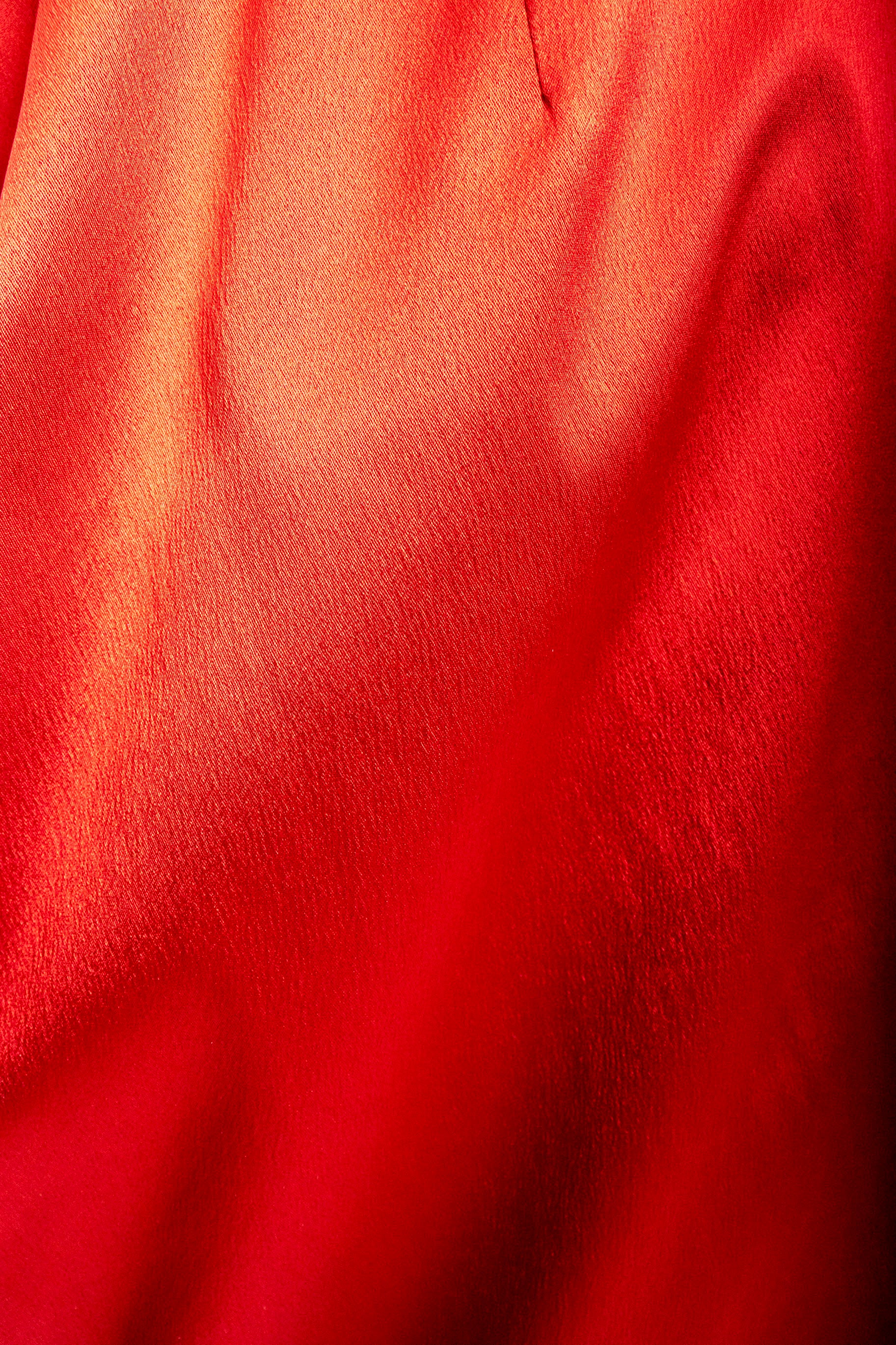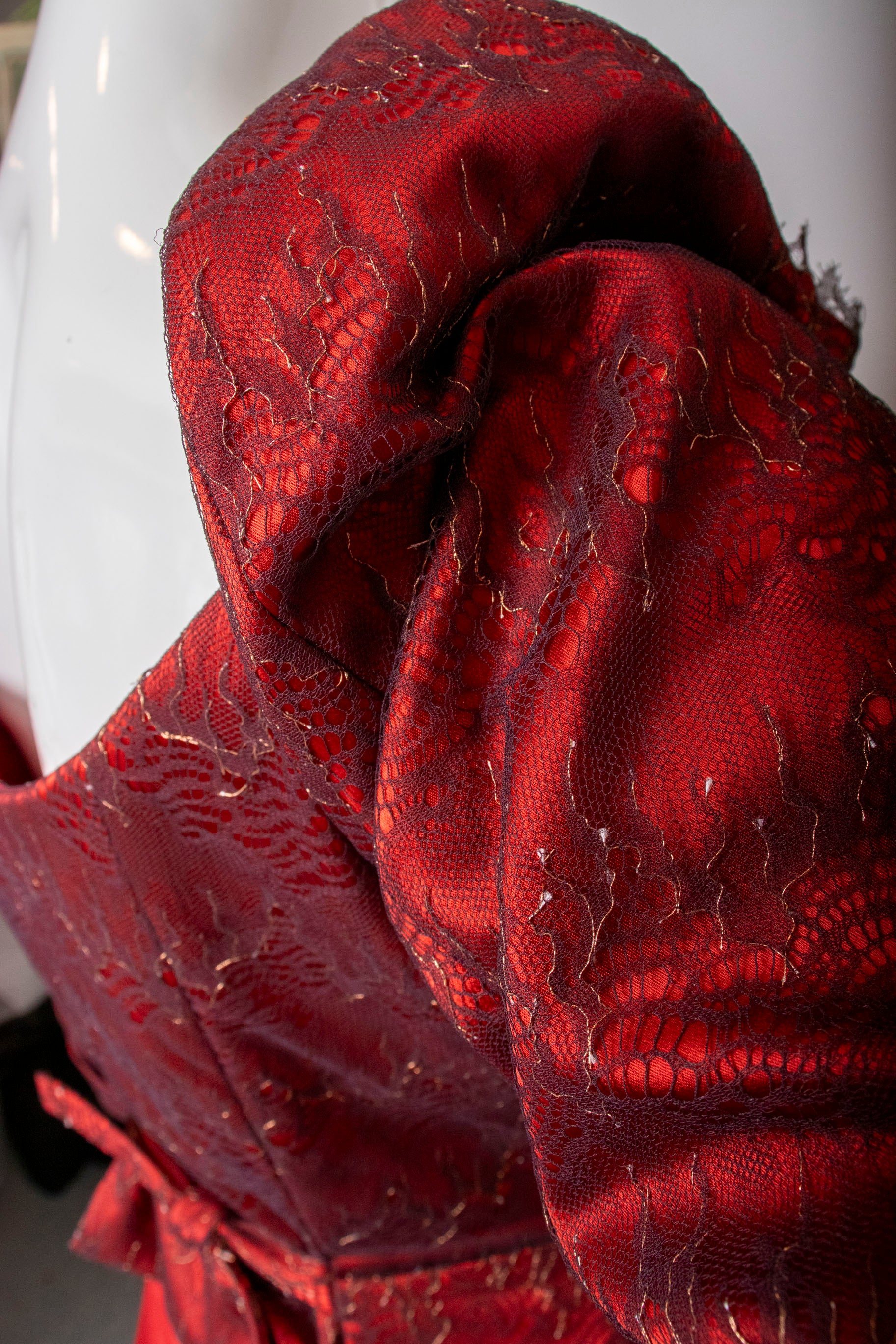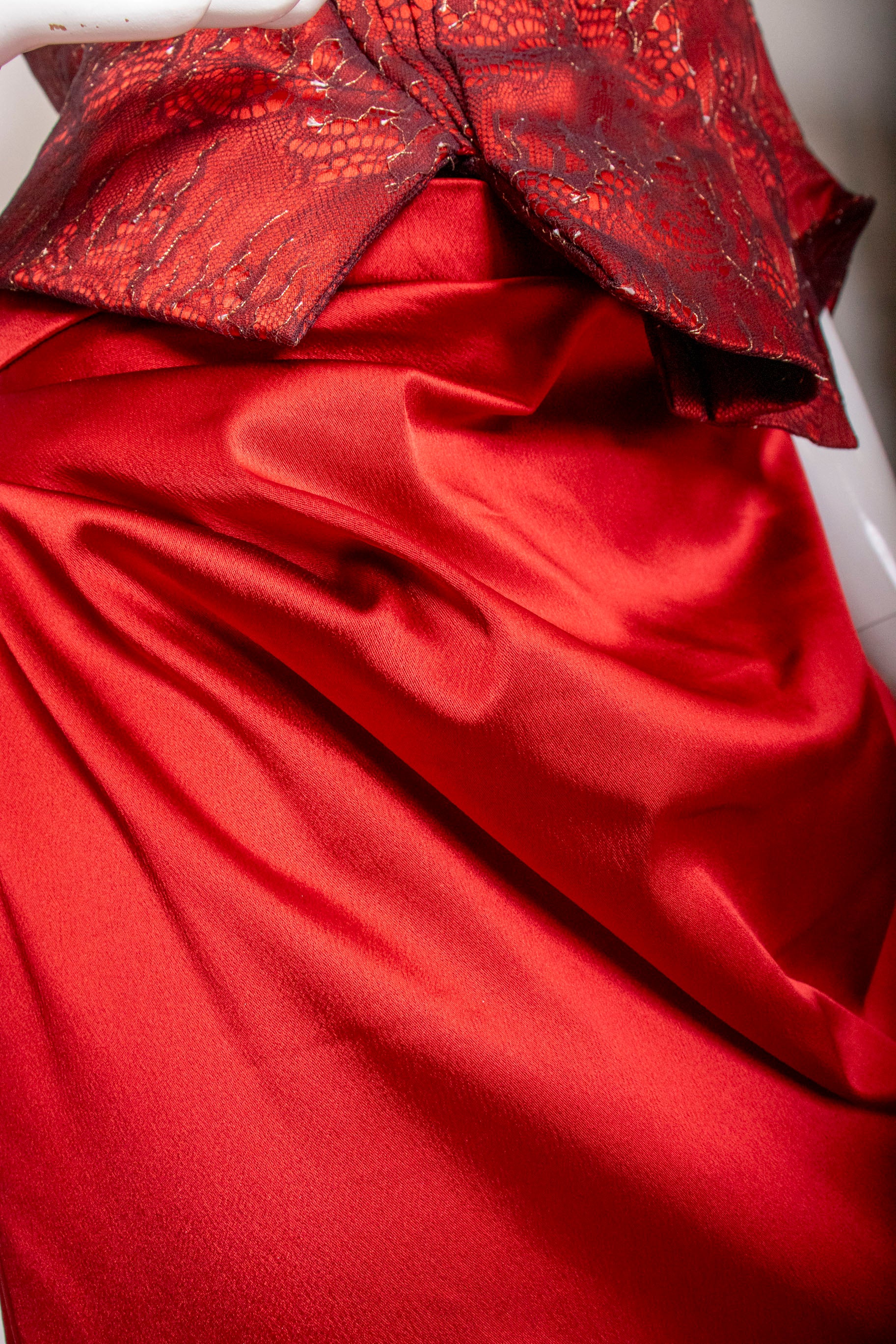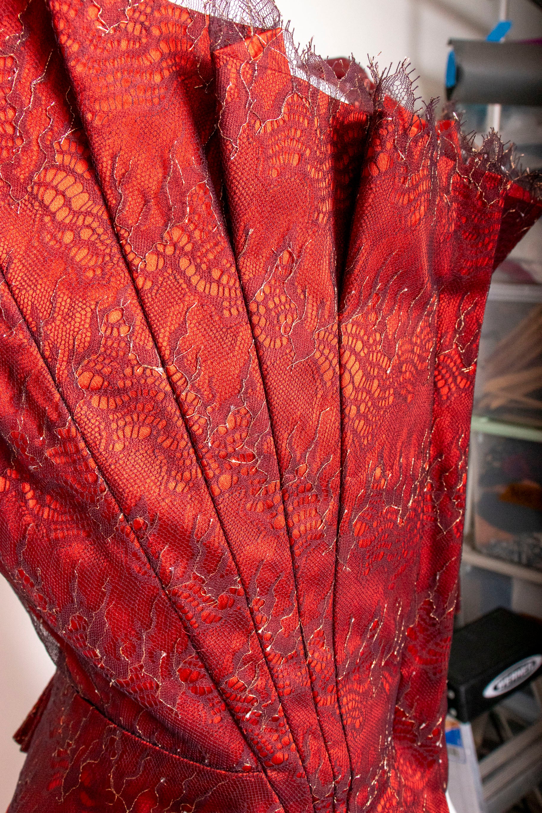 This exclusive silk satin and lace corset with a gathered skirt was custom-designed for a client before Ms. Westwood’s passing. Worn only once and kept in flawless condition, it's tailored for a fuller bust. The corset showcases a boned zip-up front with pleated detailing, a bowed and gathered back, and lace overlay on vibrant scarlet silk satin. The skirt is secured with buttons and a zipper, making this set a stunning and rare find.