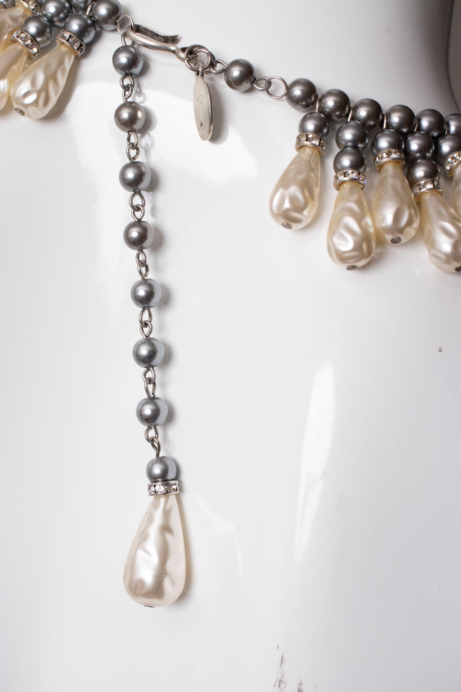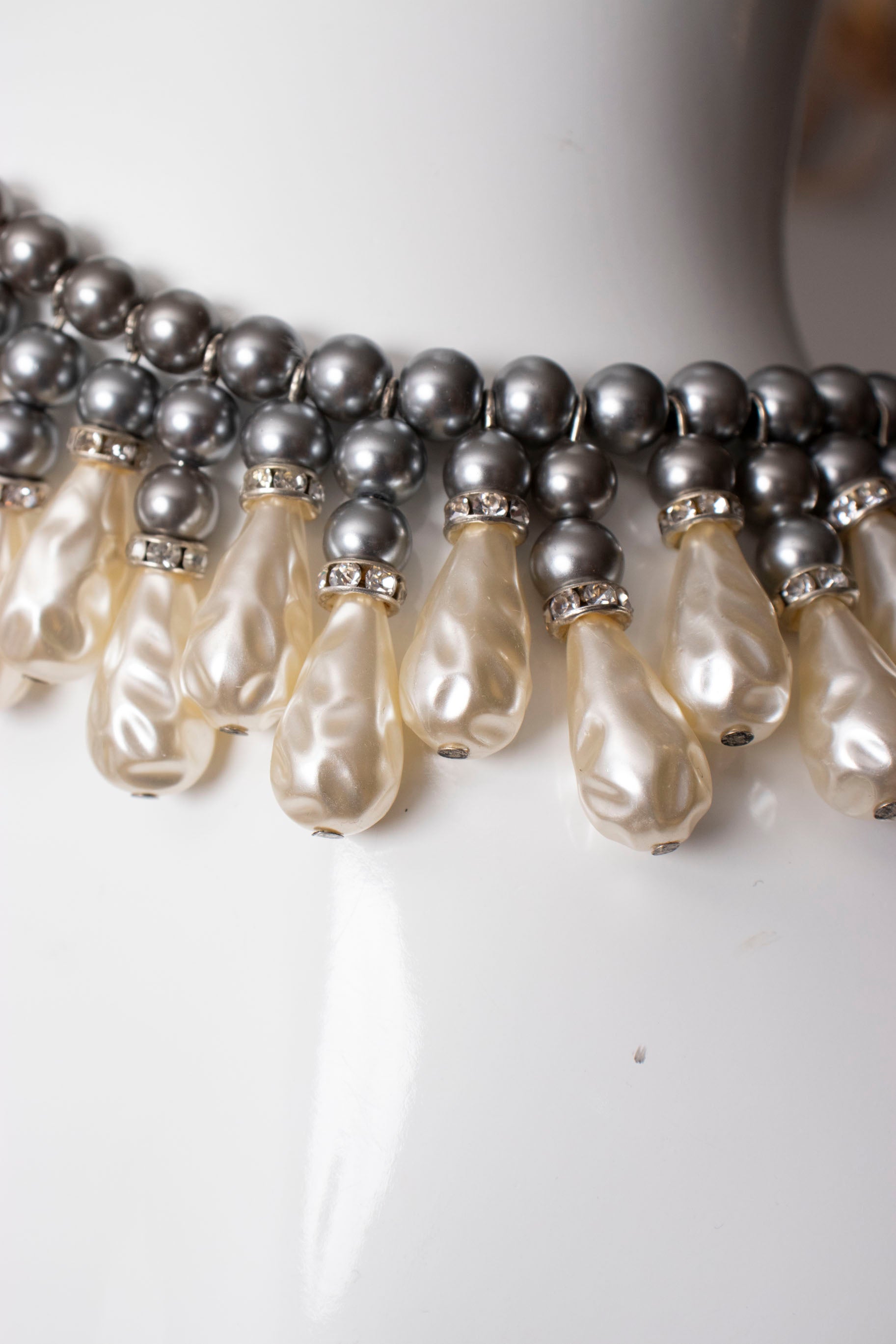 Pearl Bib Necklace with Faux Black South Sea Pearl and Baroque Pearls by Julie Rubano.