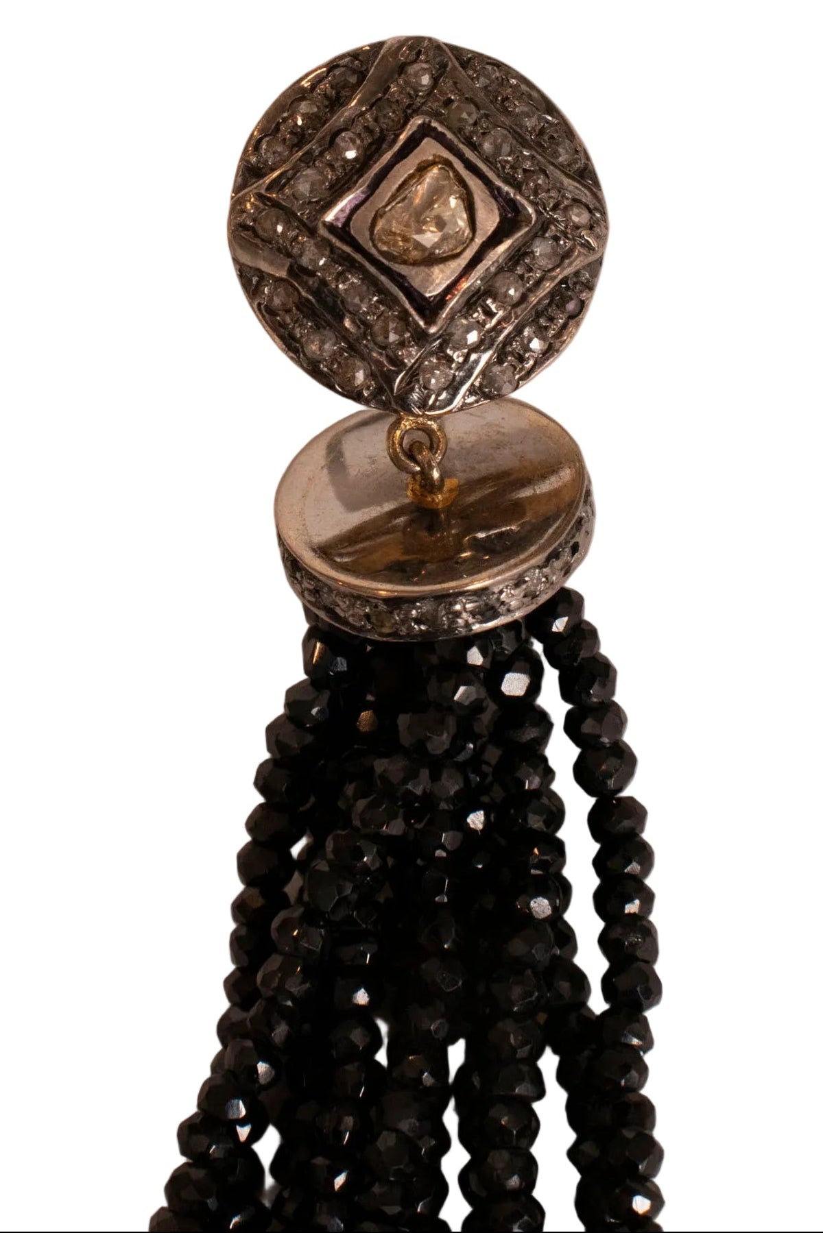 Celebrity Owned black tassel pierced earrings in sterling silver featuring rough diamonds and jet beads.