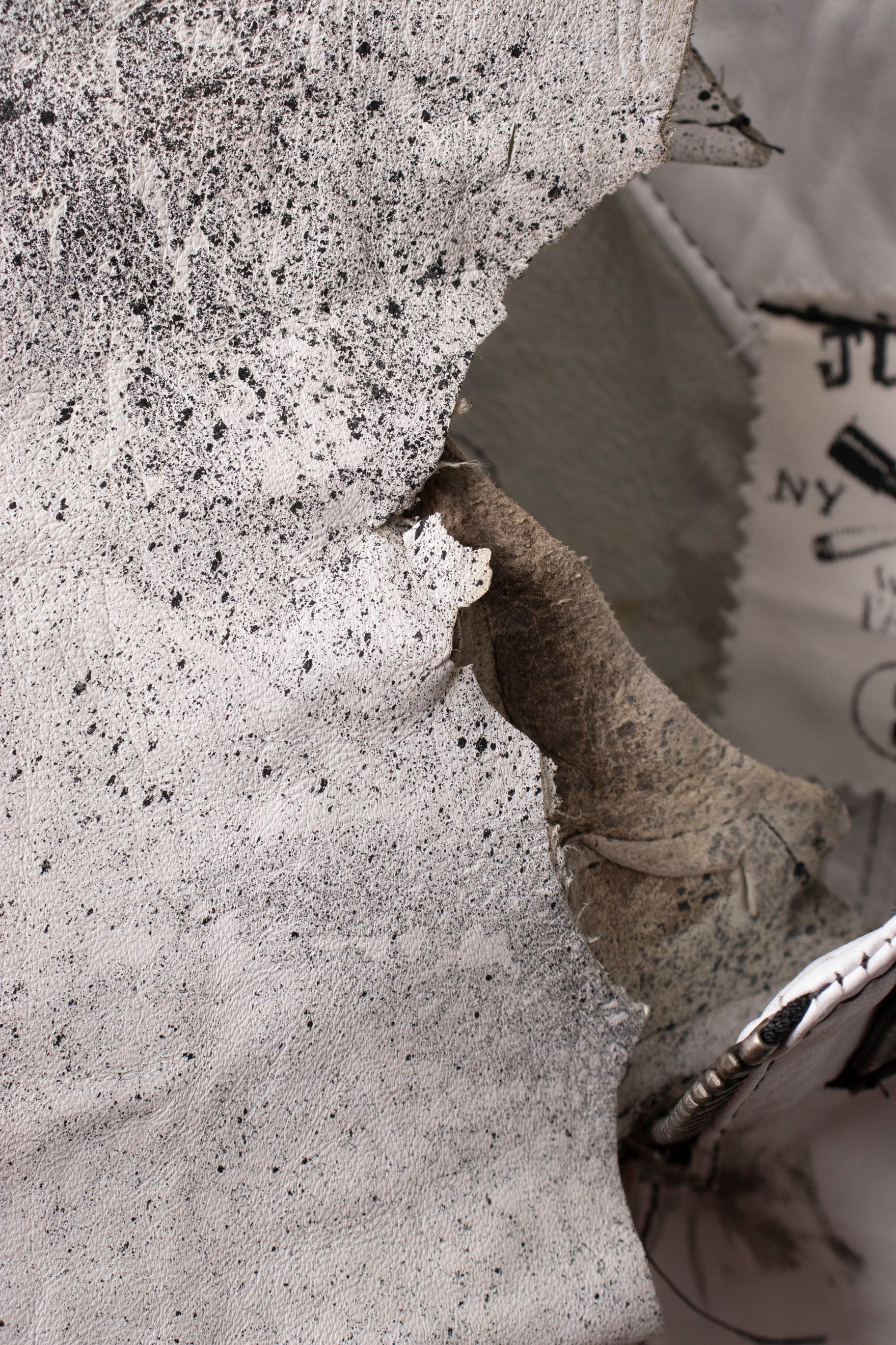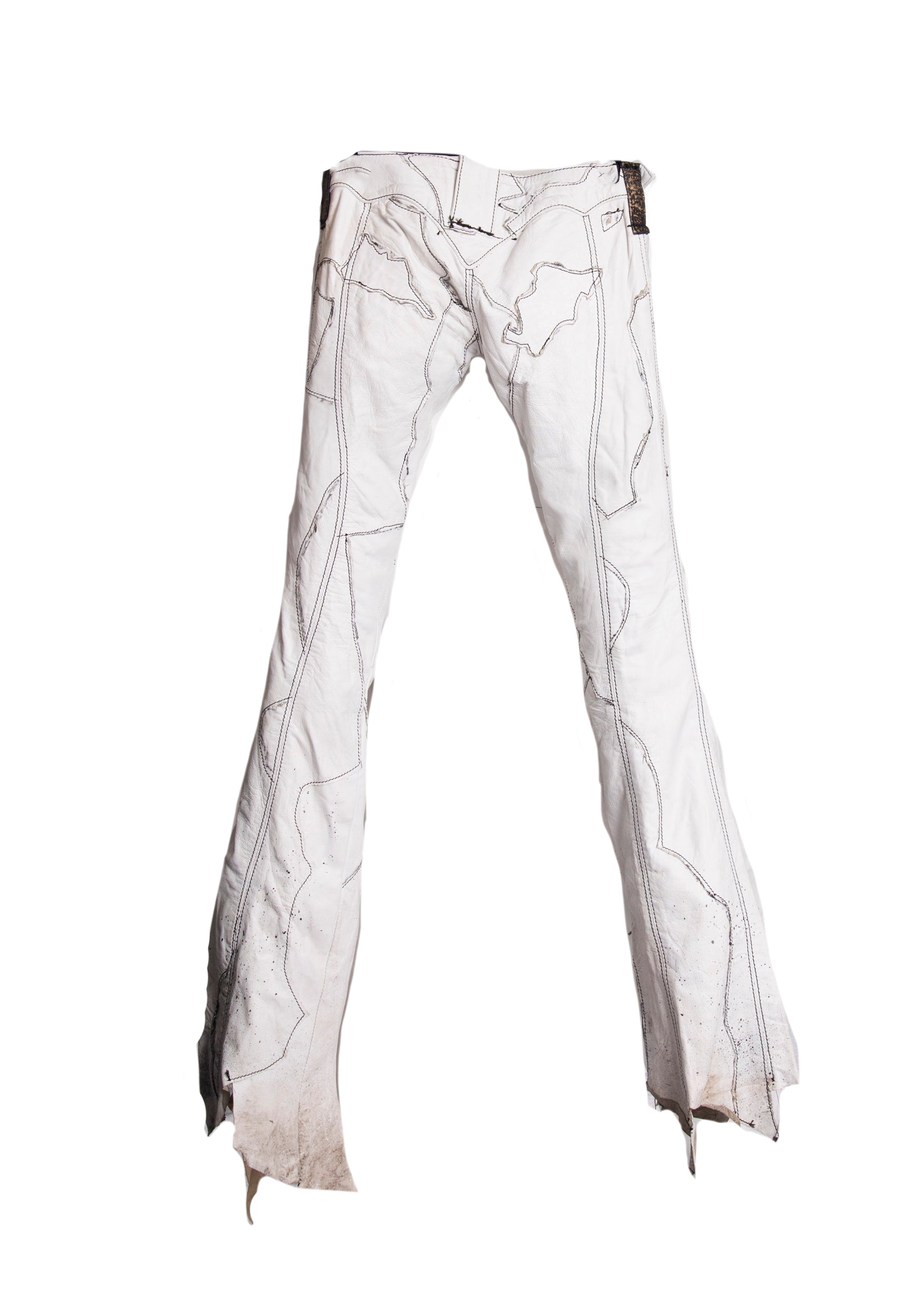 These insane Rocker pants worn by Steven Tyler are made from buttery soft and distressed white deerskin, and feature charcoal sketching detail at the patchwork seams. The raw, asymmetric hem is complete with performance stains, and we love the low-rise waist with the chunky zipper and belt loops. There are two front denim lined pockets. Handmade, hand stitched hand finished.