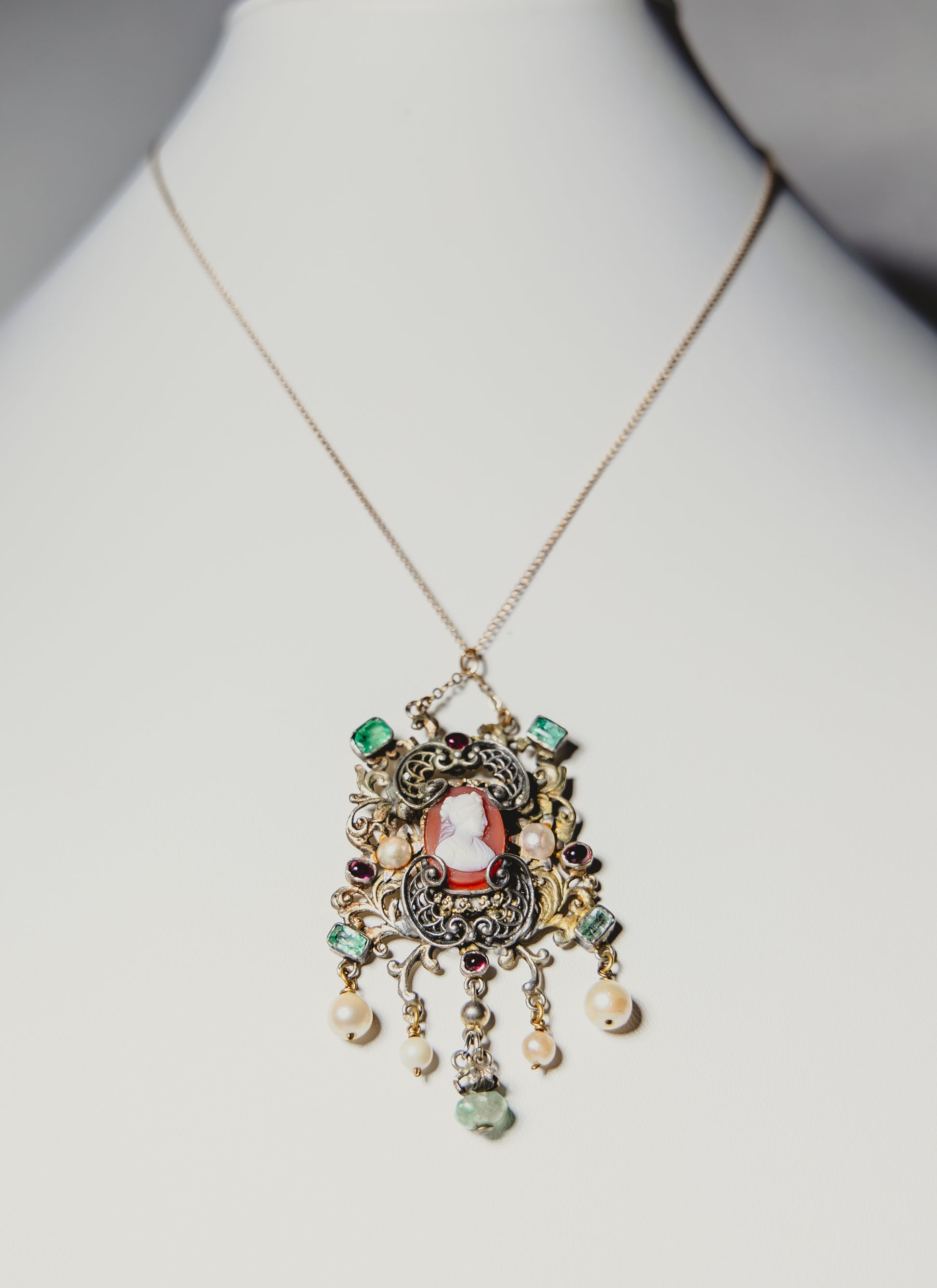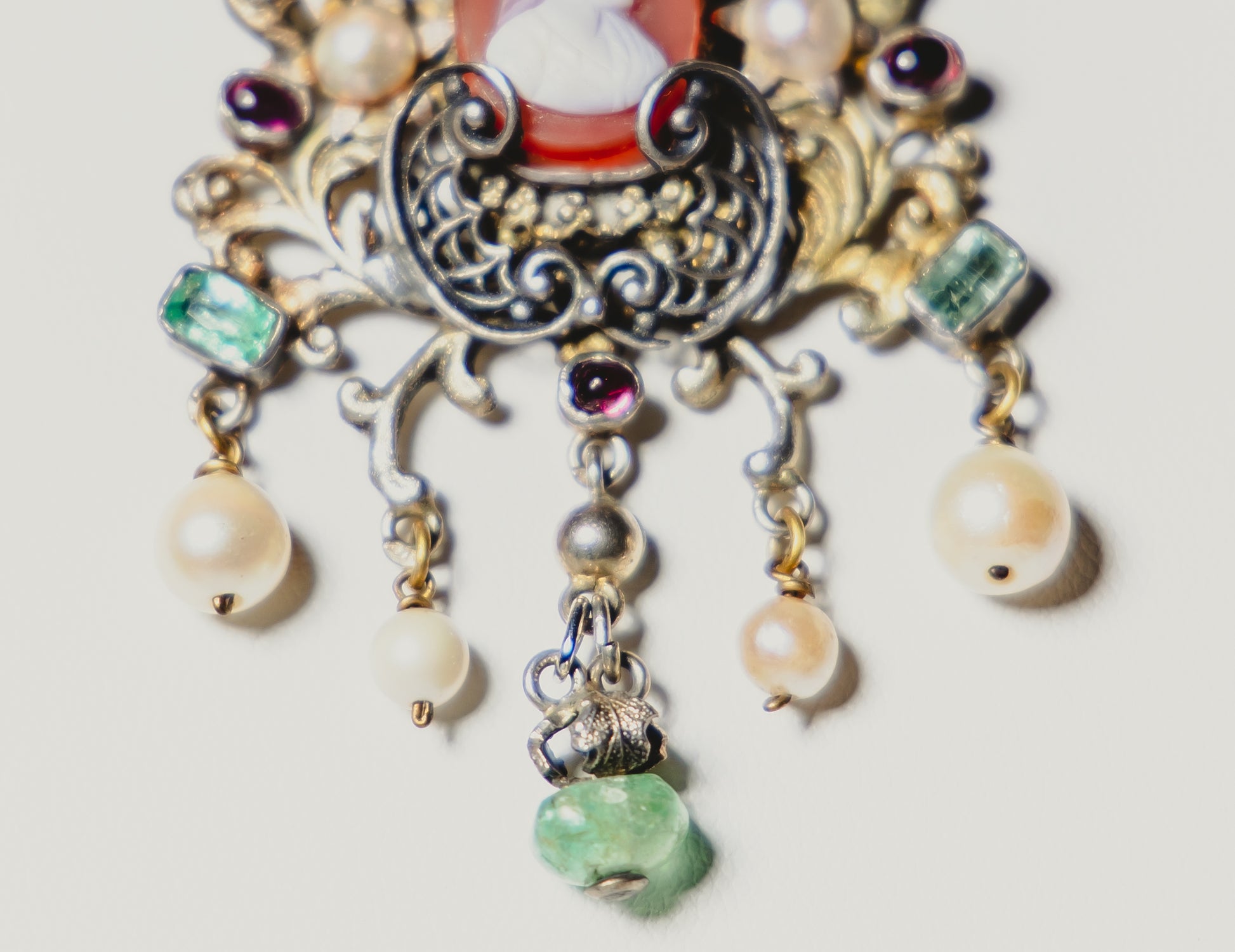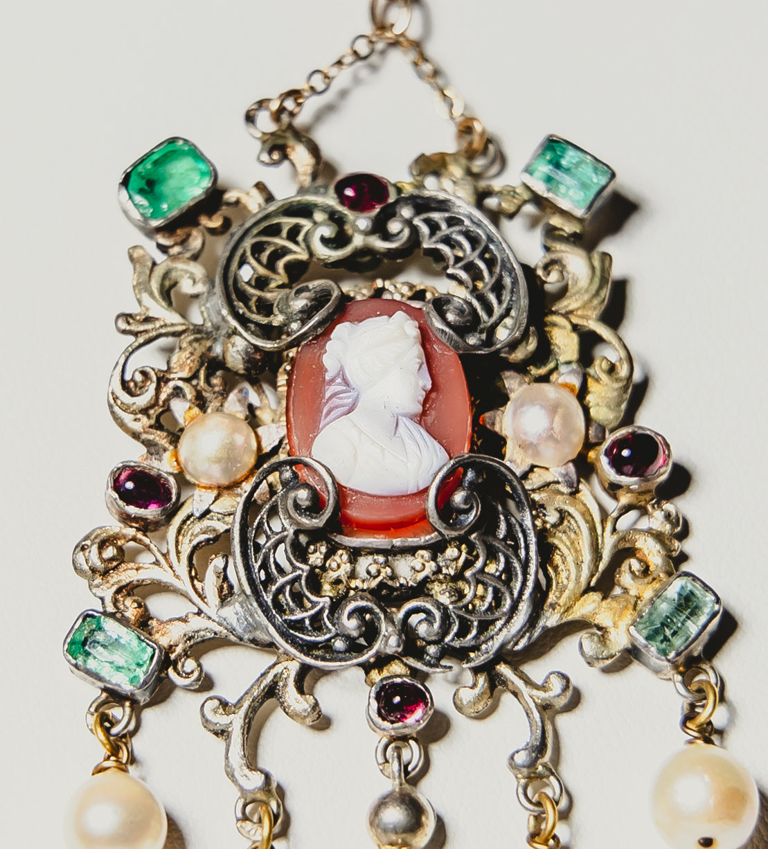 Materials: cameo, ruby, sapphire, pearl, emerald,14K gold